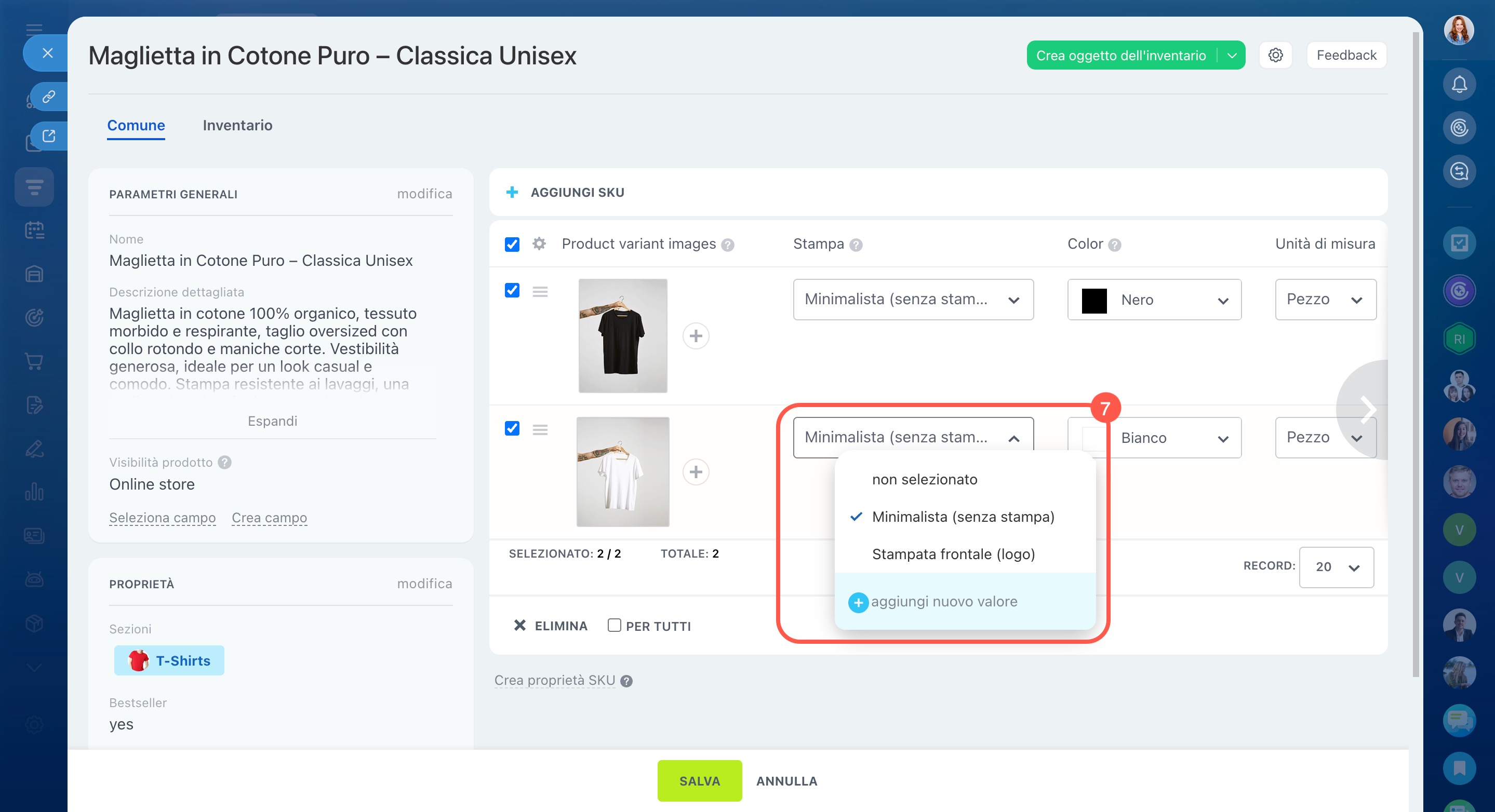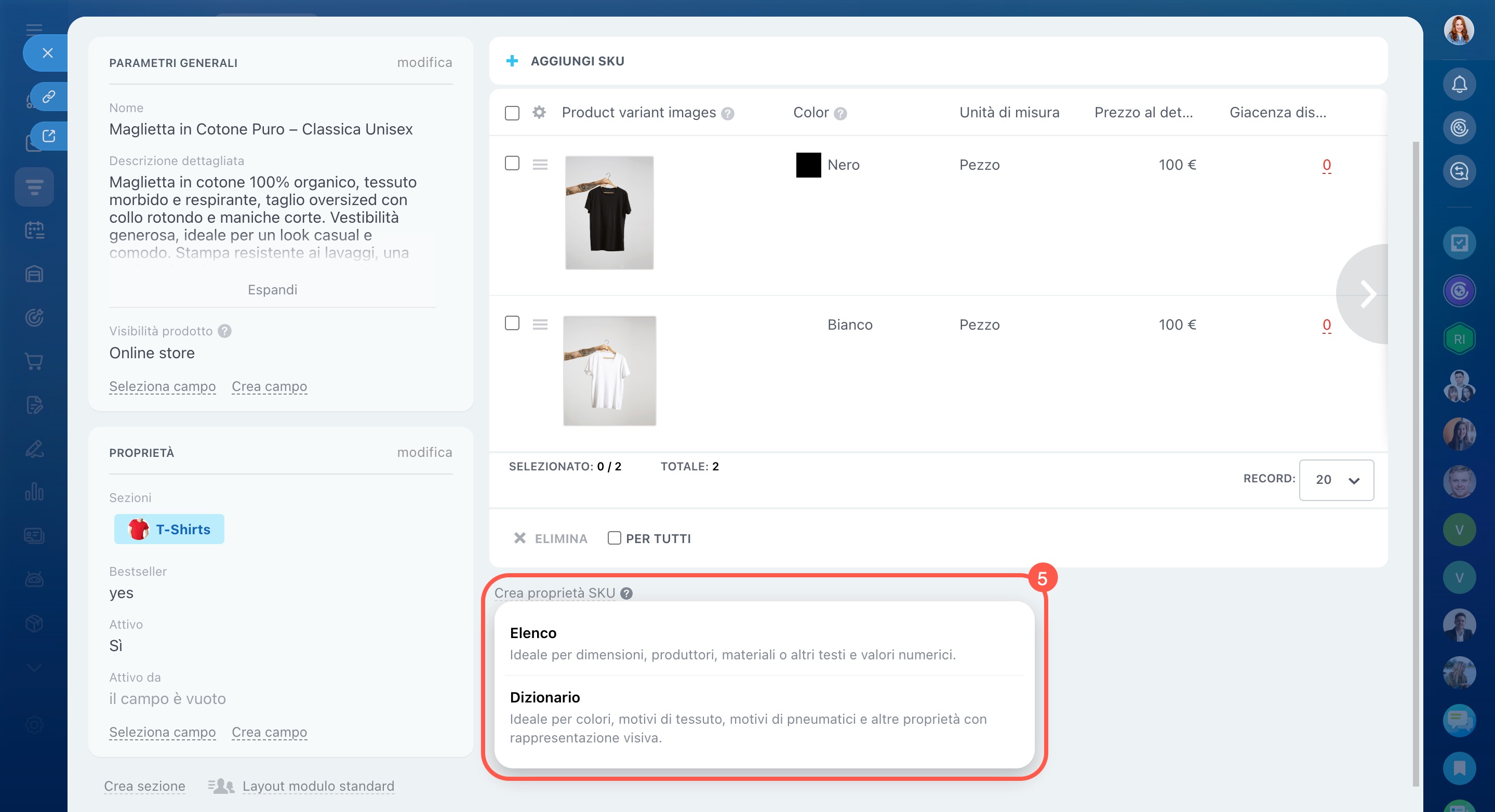 Ogni variante del prodotto corrisponde a uno SKU e può avere un insieme di proprietà specifiche.