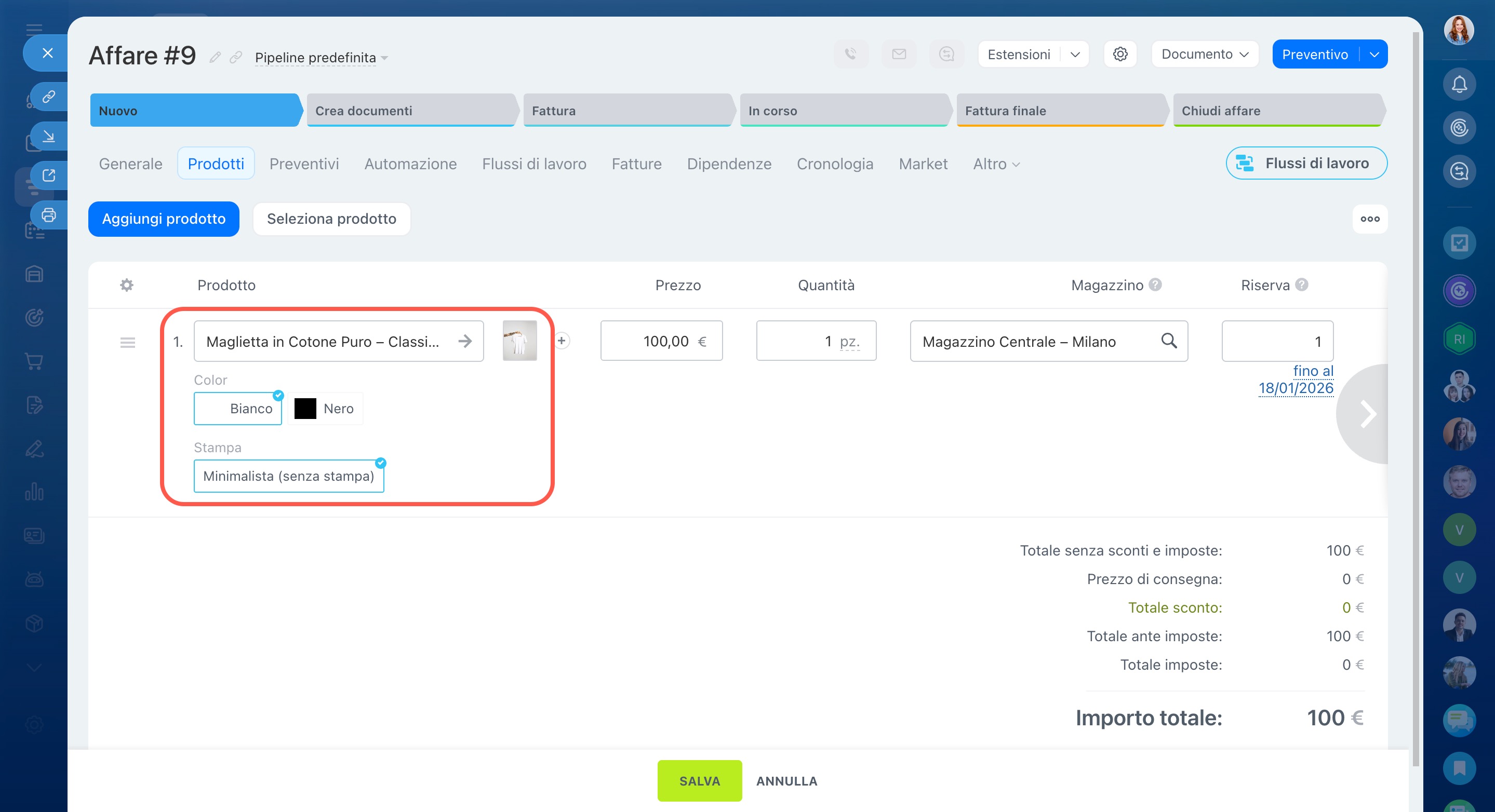 Questa impostazione permette di aggiungere un prodotto a un affare anche quando non sono disponibili scorte in magazzino. Il prodotto resta visibile nello store online, il cliente può ordinarlo e il manager può inviare un link per il pagamento.