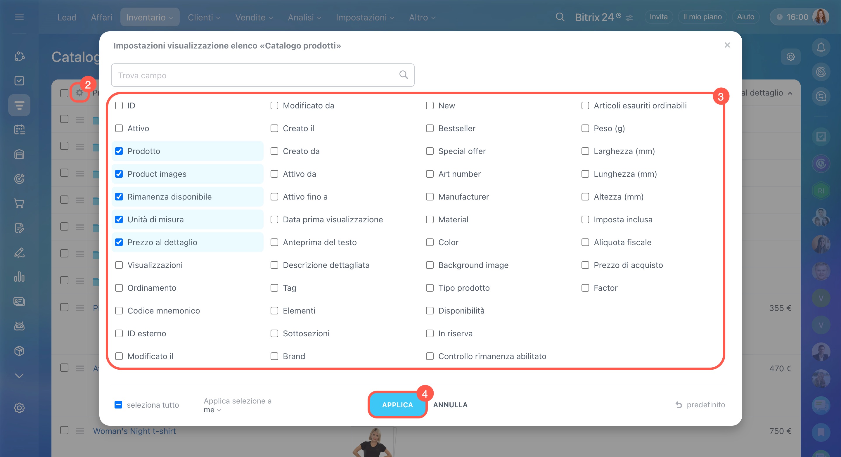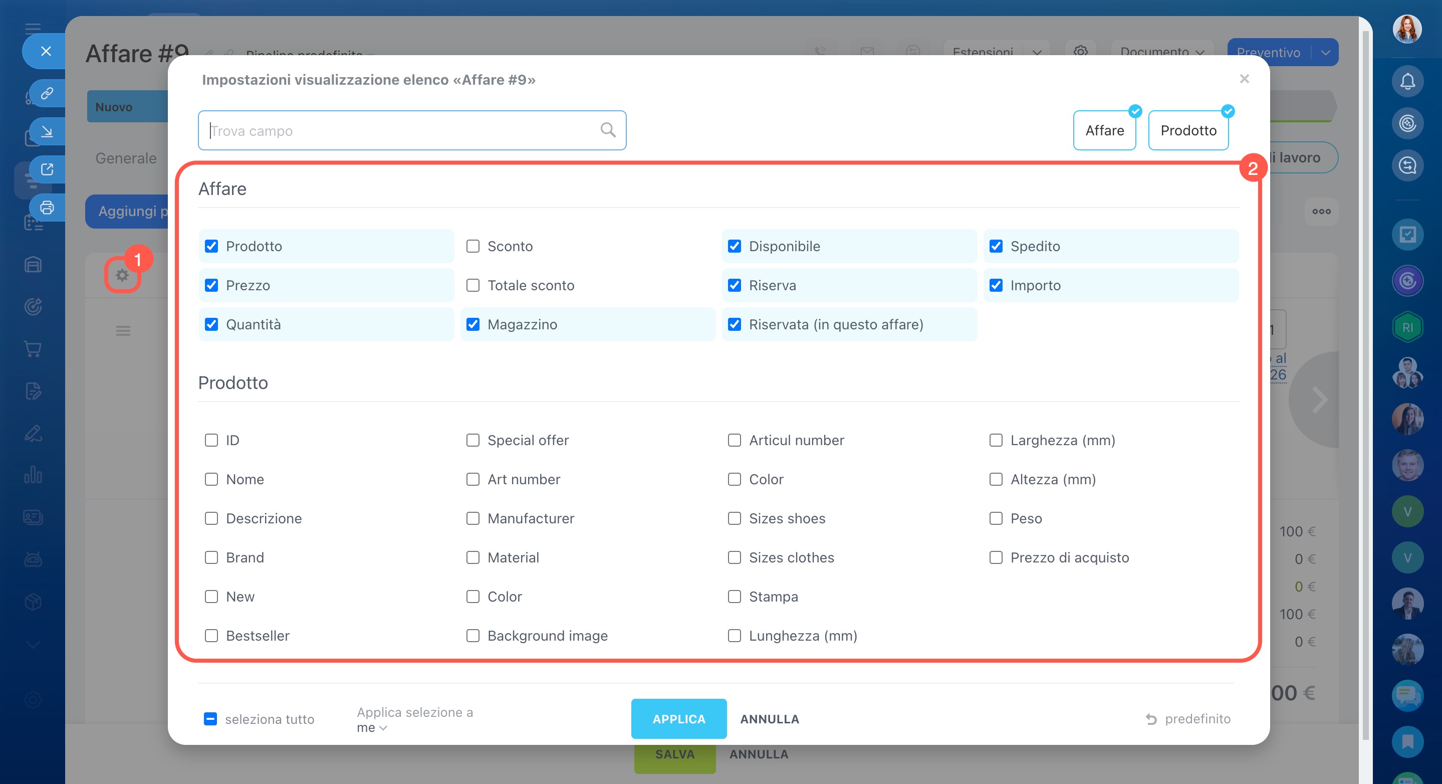 - Seleziona i campi da visualizzare nell’elenco: apri le impostazioni dell’elenco, scegli le proprietà necessarie e fai clic su Applica.