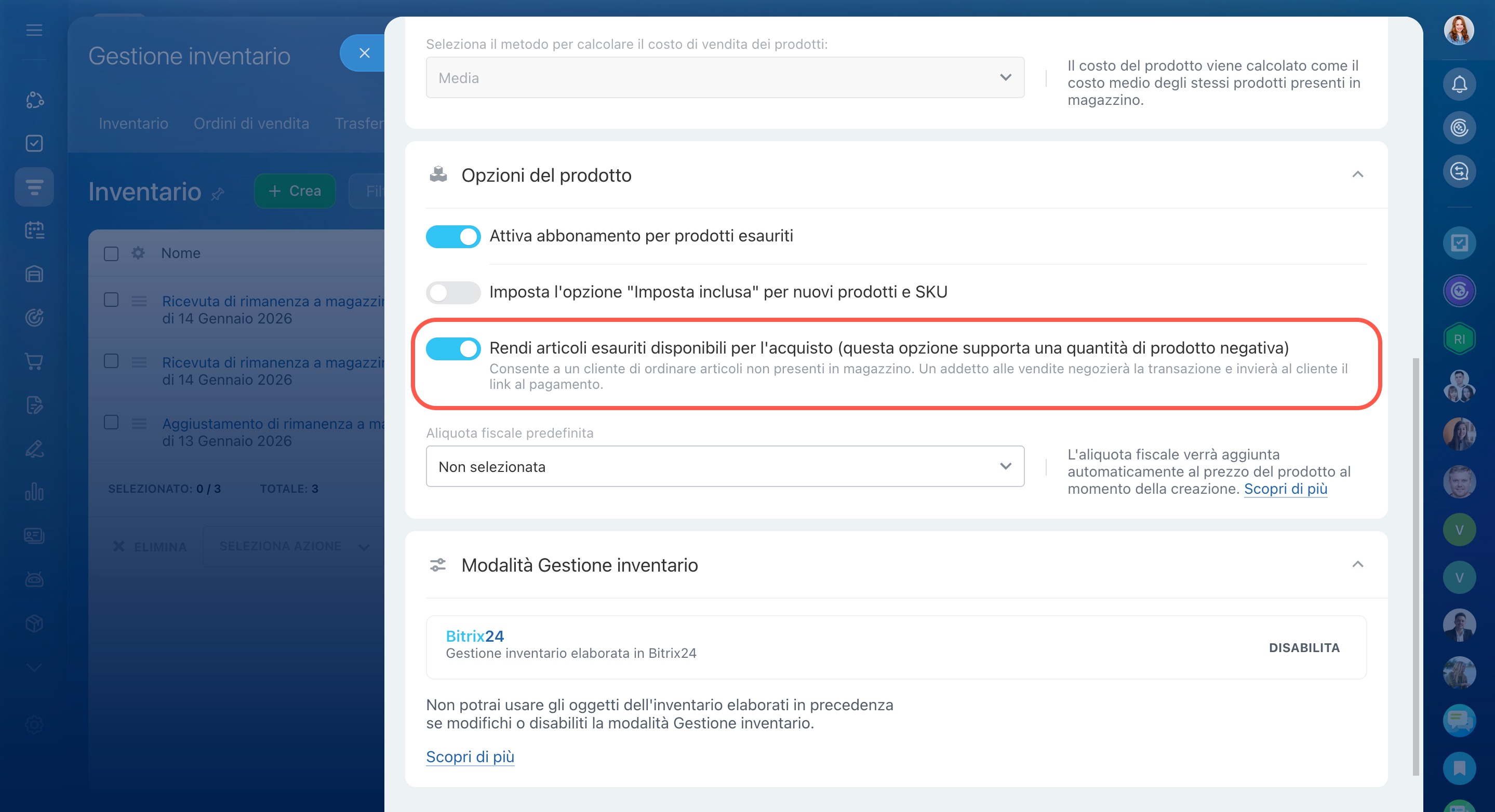 Per disattivare la Gestione inventario, vai su Gestione inventario > Impostazioni > Parametri comuni e fai clic su Disattiva.