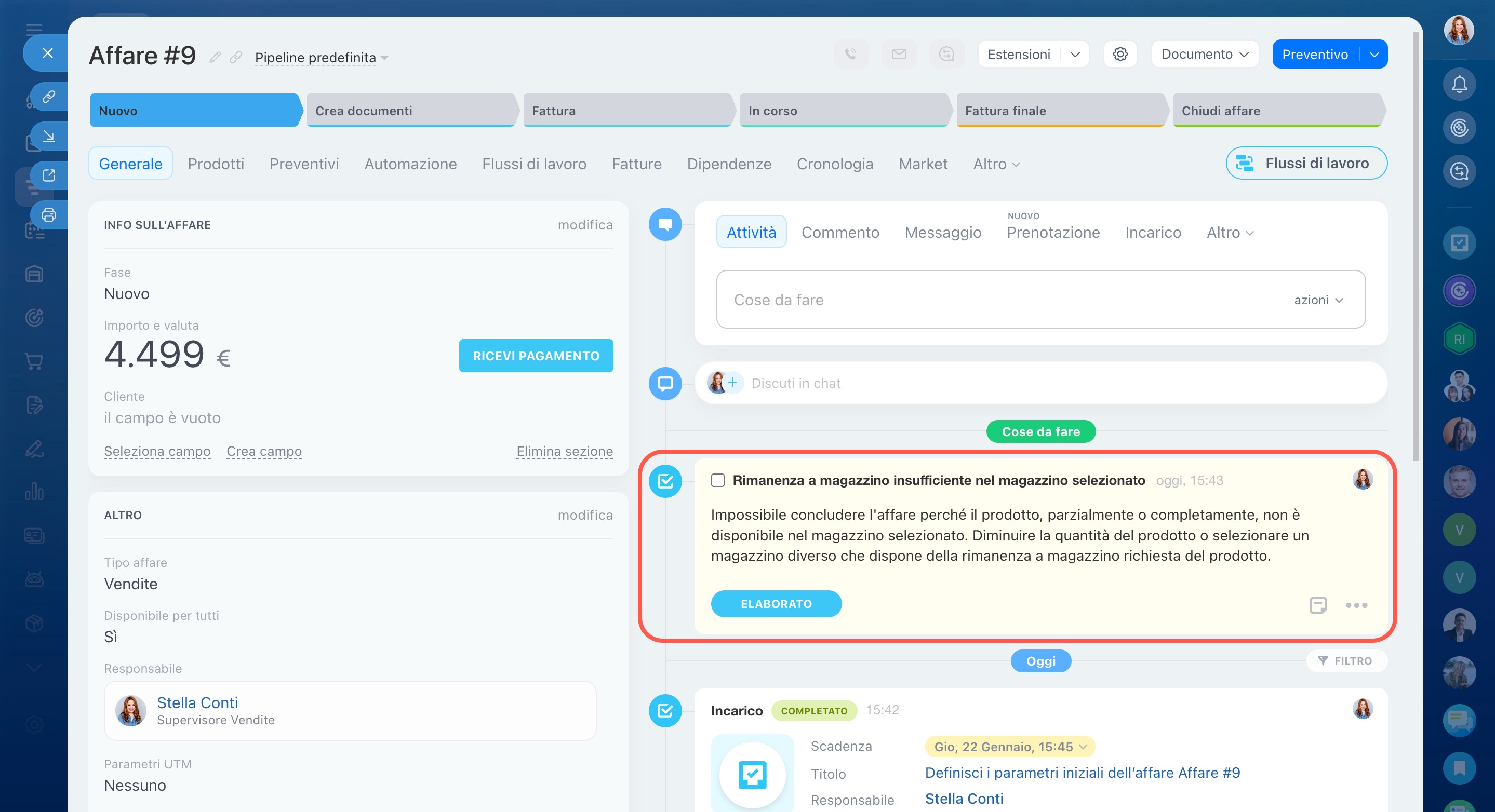 Alla chiusura di un affare, Bitrix24 controlla le scorte disponibili in magazzino e crea un documento di vendita. Se il prodotto non è disponibile, l’affare non viene chiuso e compare un avviso di mancanza di scorte.