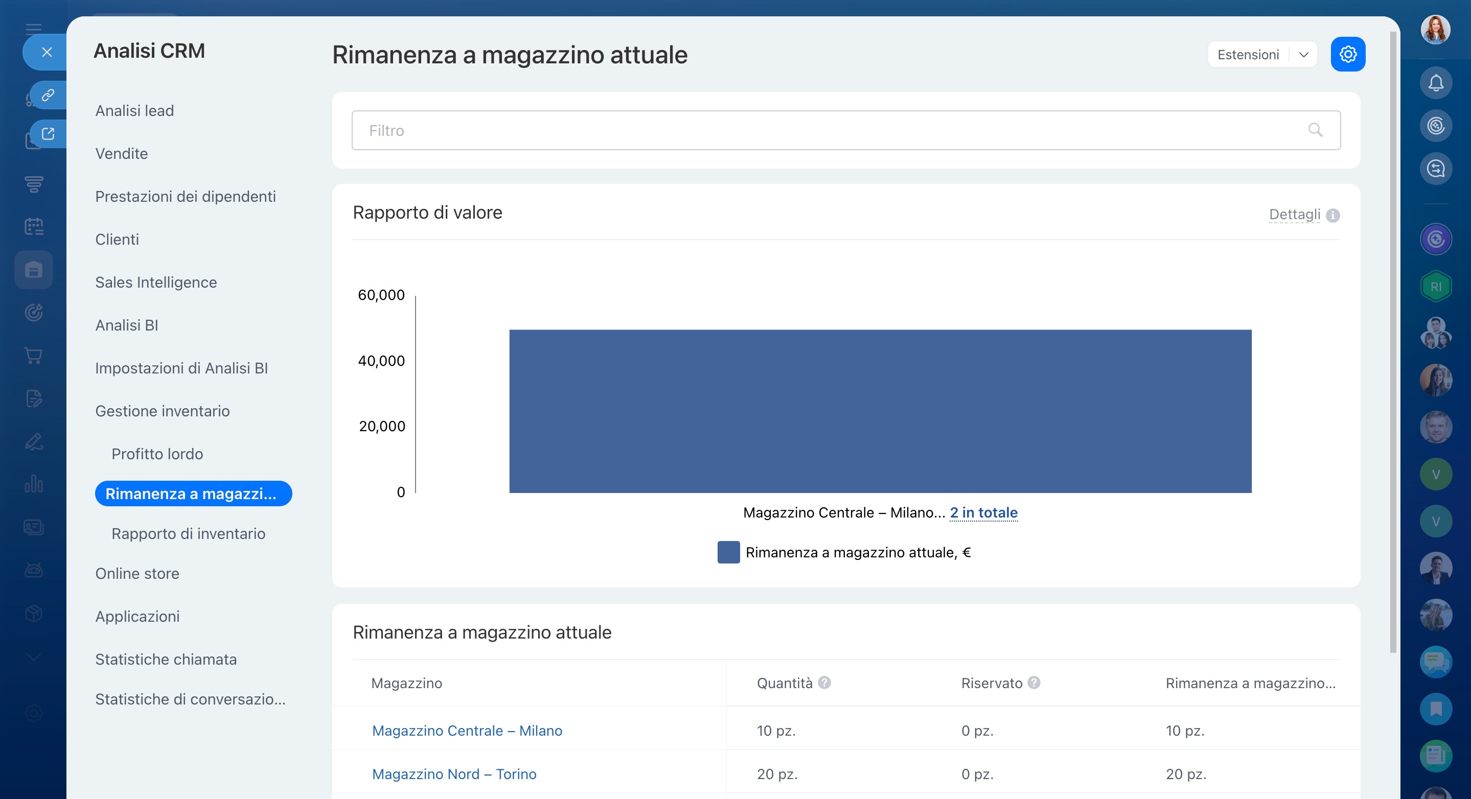 Vai su Gestione inventario > Analisi > Rimanenza a magazzino attuale. Nella parte superiore del rapporto è indicato il valore totale delle scorte, calcolato in base ai prezzi di acquisto. Più in basso trovi una tabella con le scorte suddivise per magazzino.