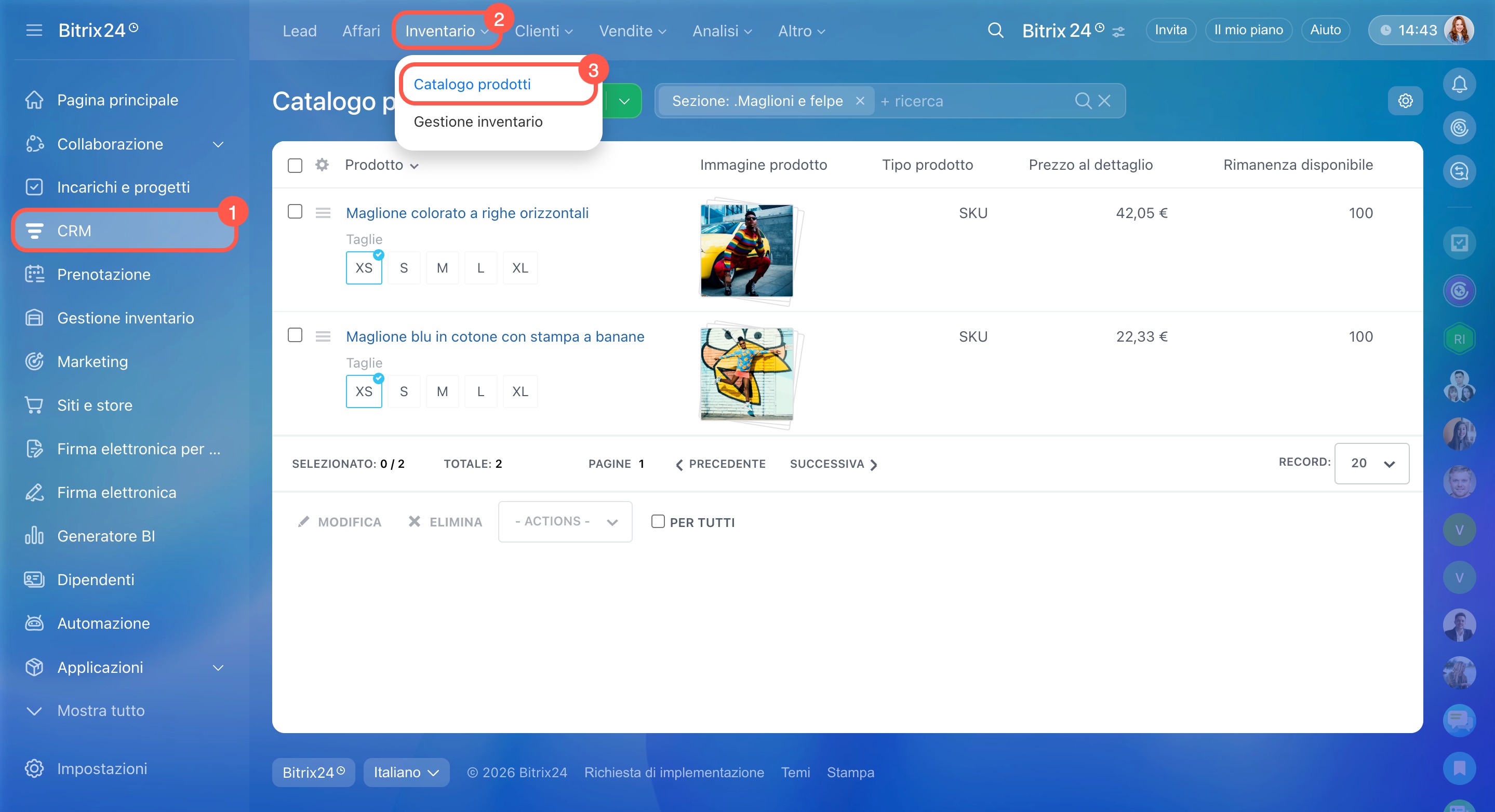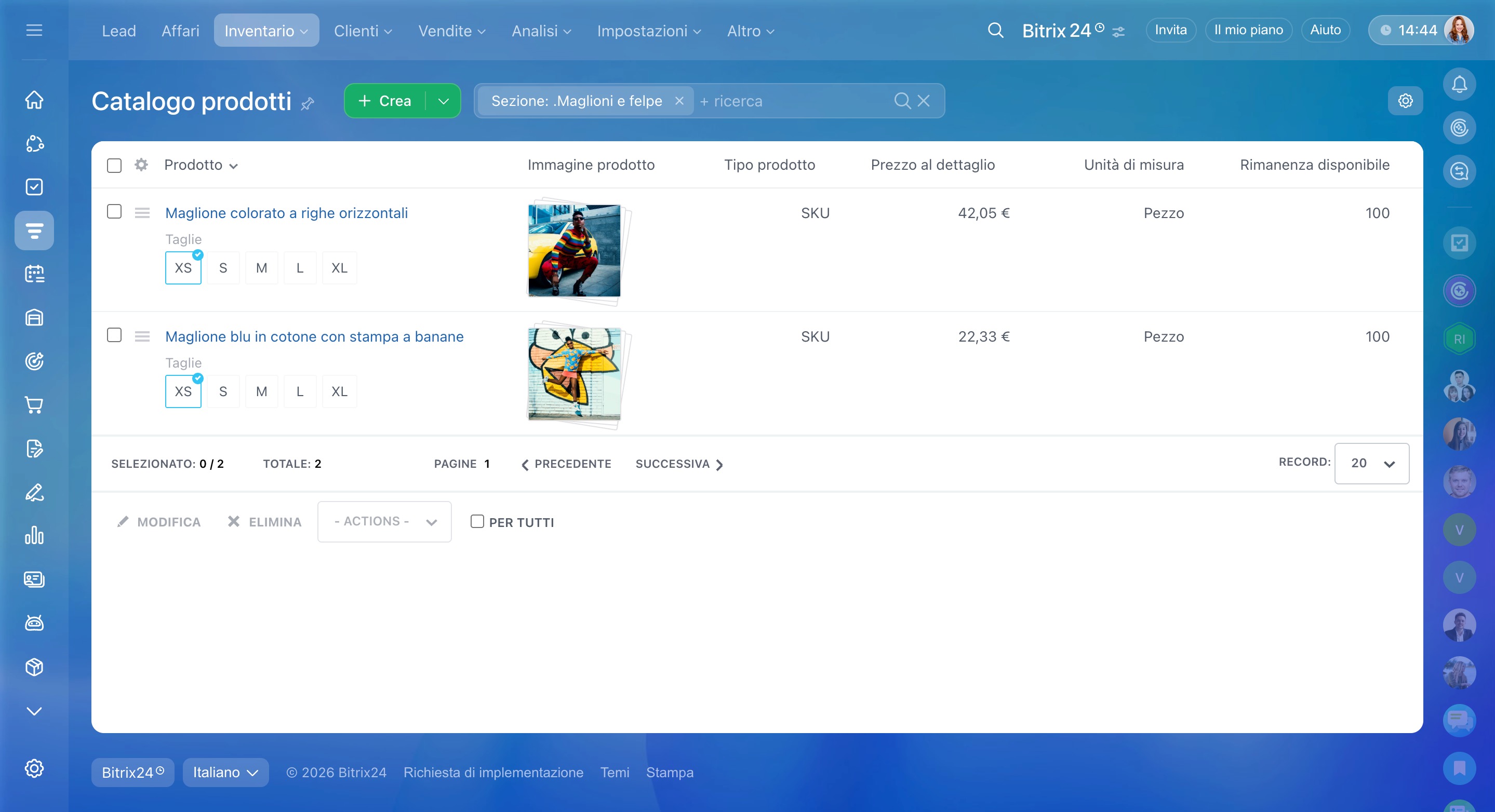 In Bitrix24 è disponibile un catalogo unico per il CRM e per i negozi online. Se colleghi un negozio online, i prodotti del catalogo vengono pubblicati automaticamente sul sito.