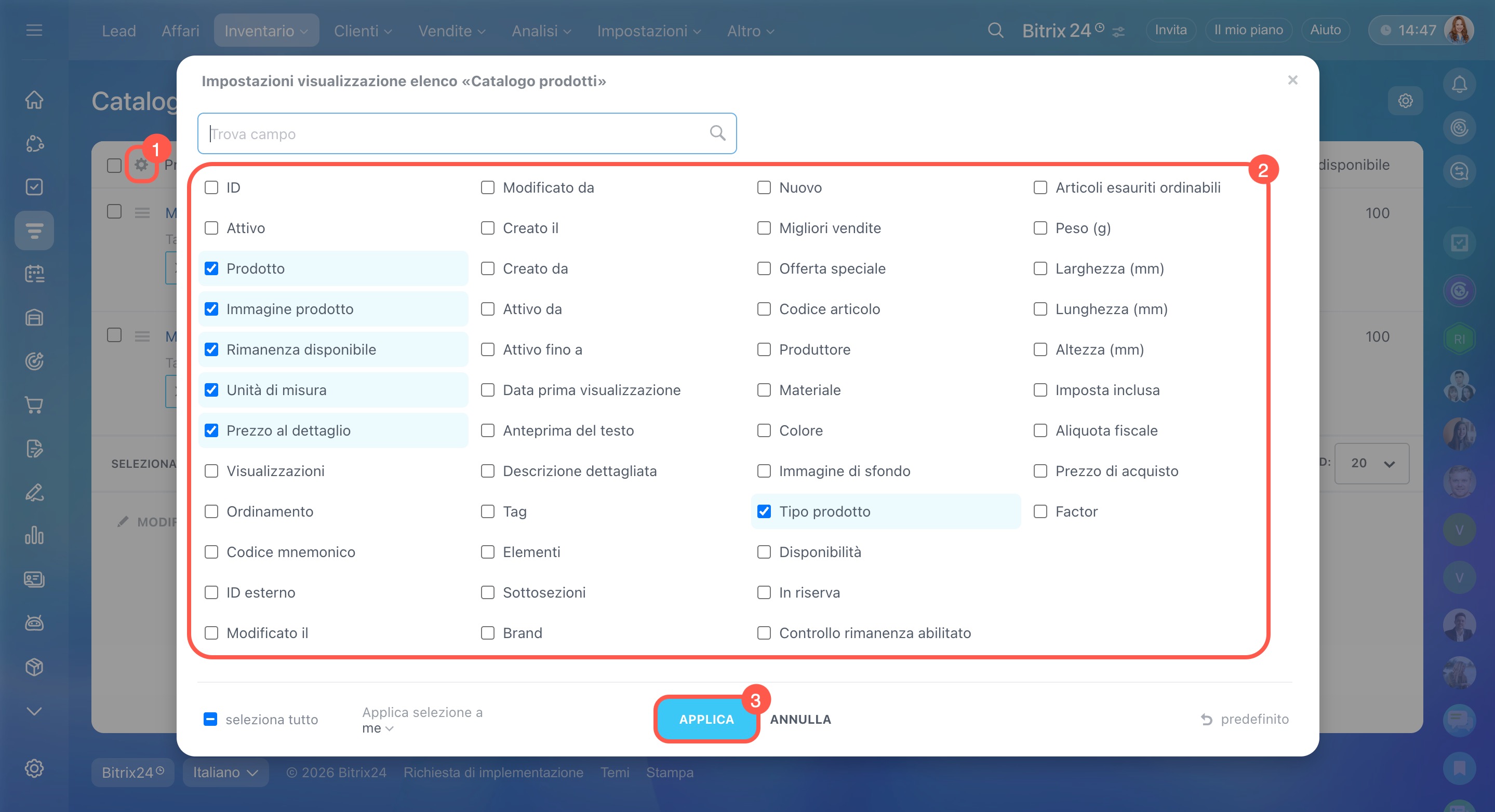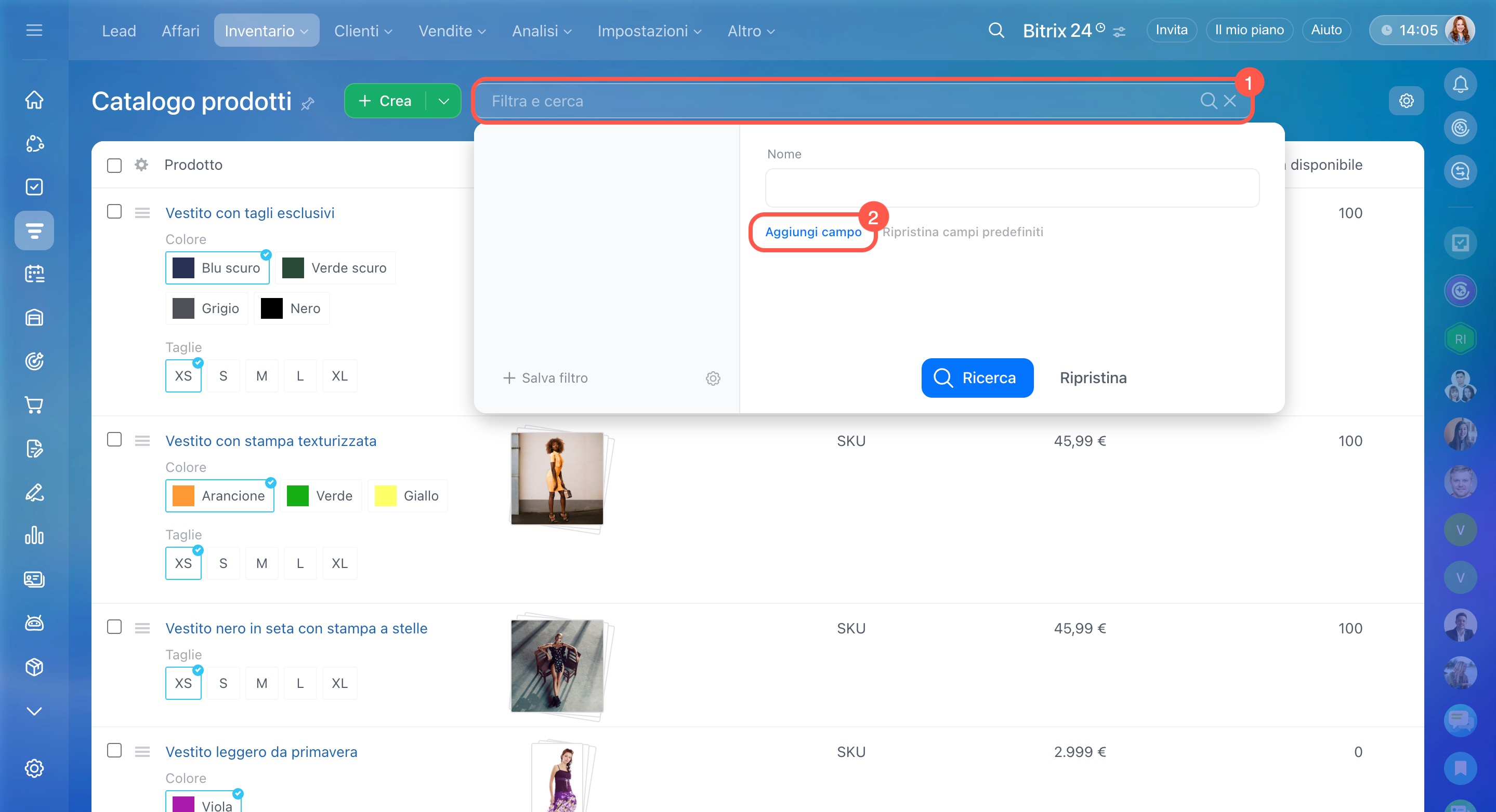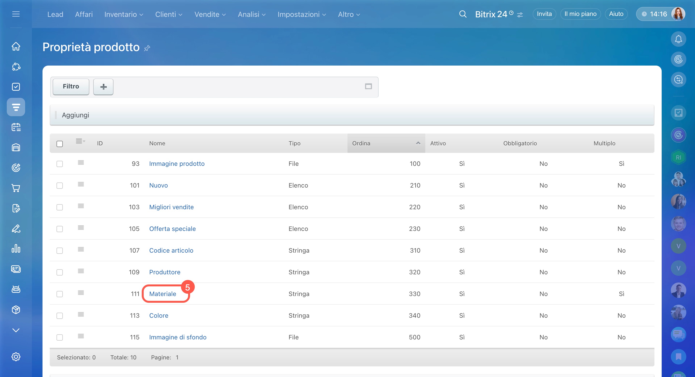 Se un campo utile non è disponibile nell’elenco dei filtri, puoi aggiungerlo dalle impostazioni delle proprietà dei prodotti. Questa operazione può essere eseguita dall’amministratore di Bitrix24 o del CRM.