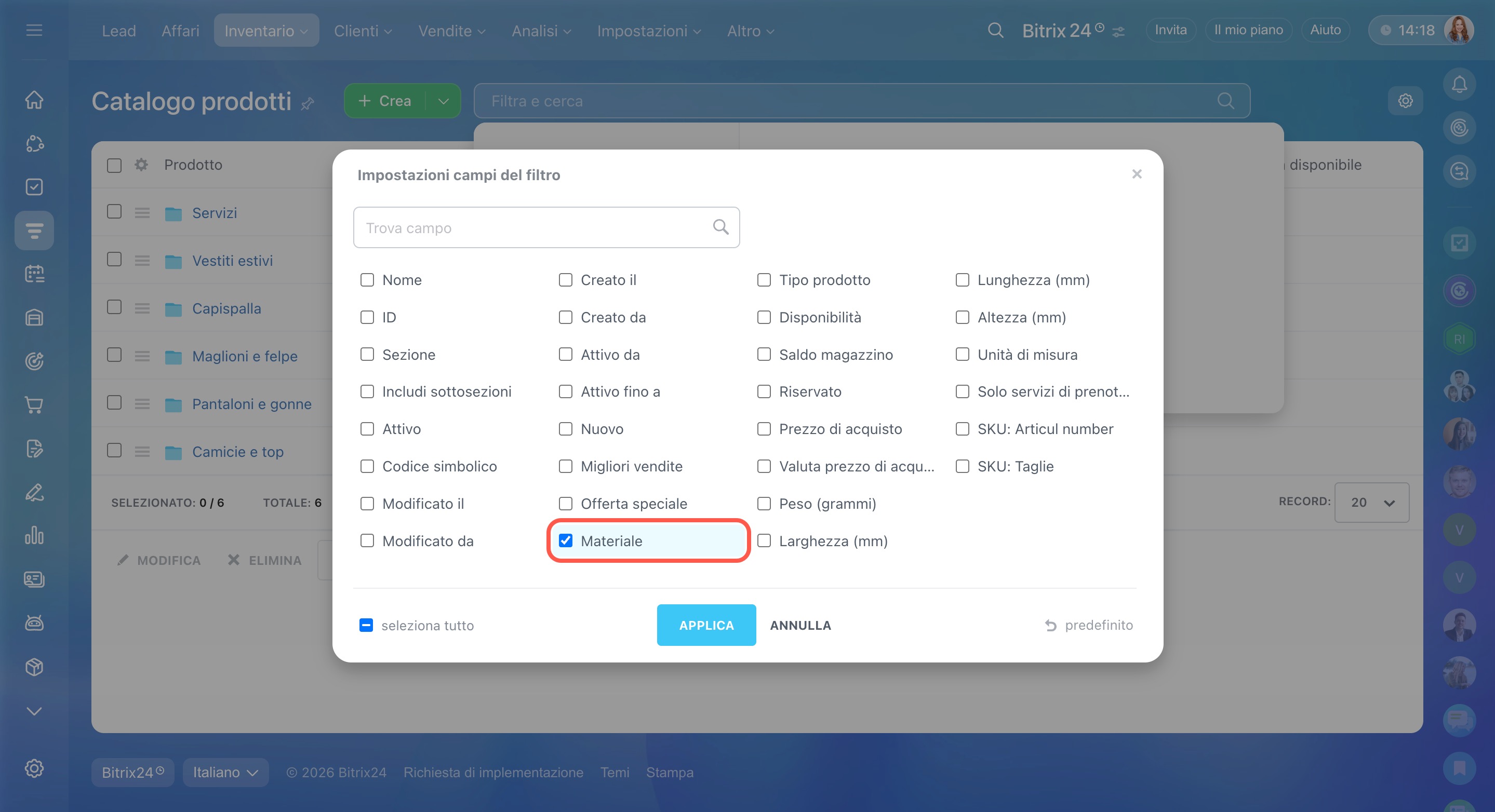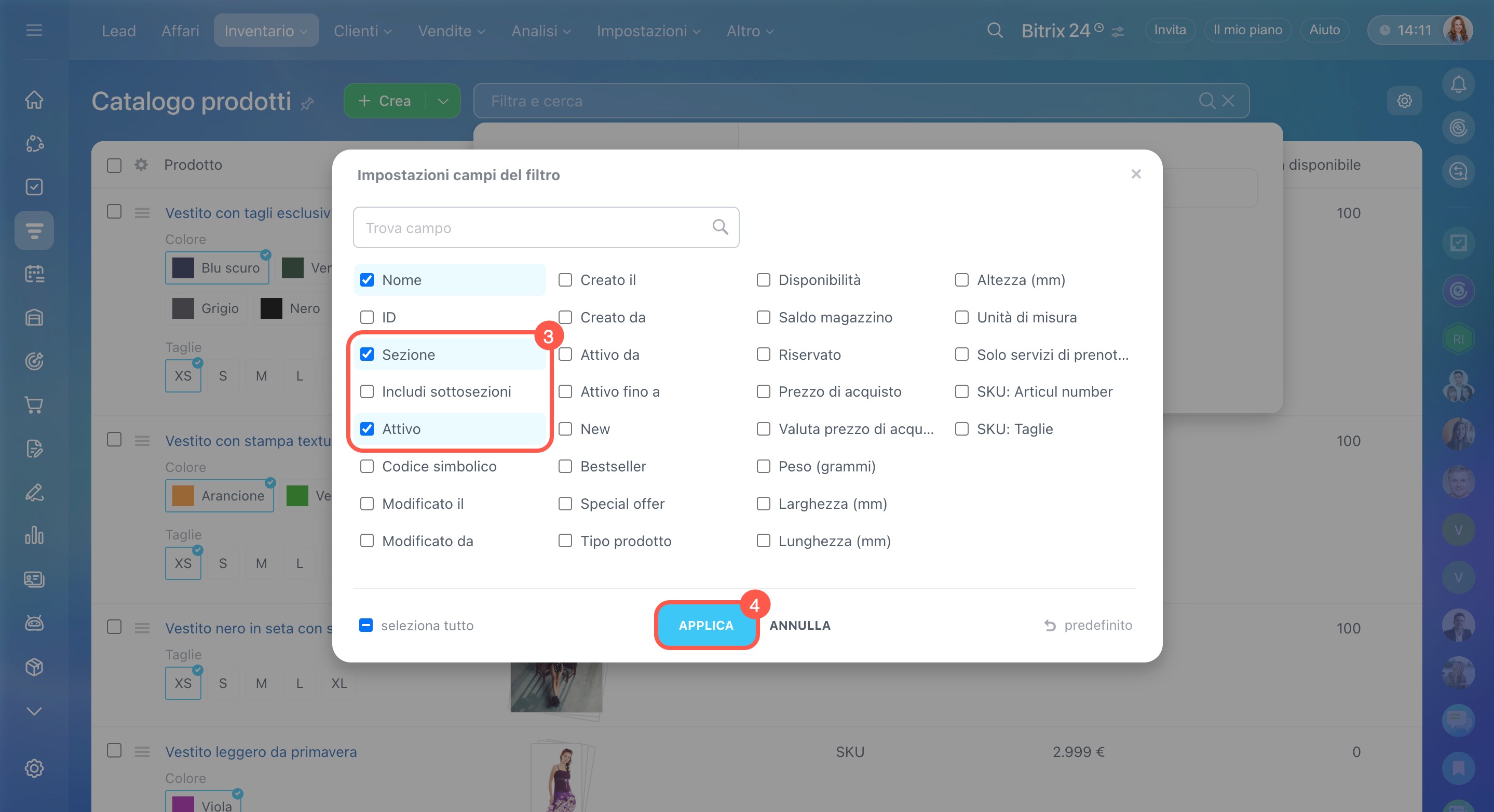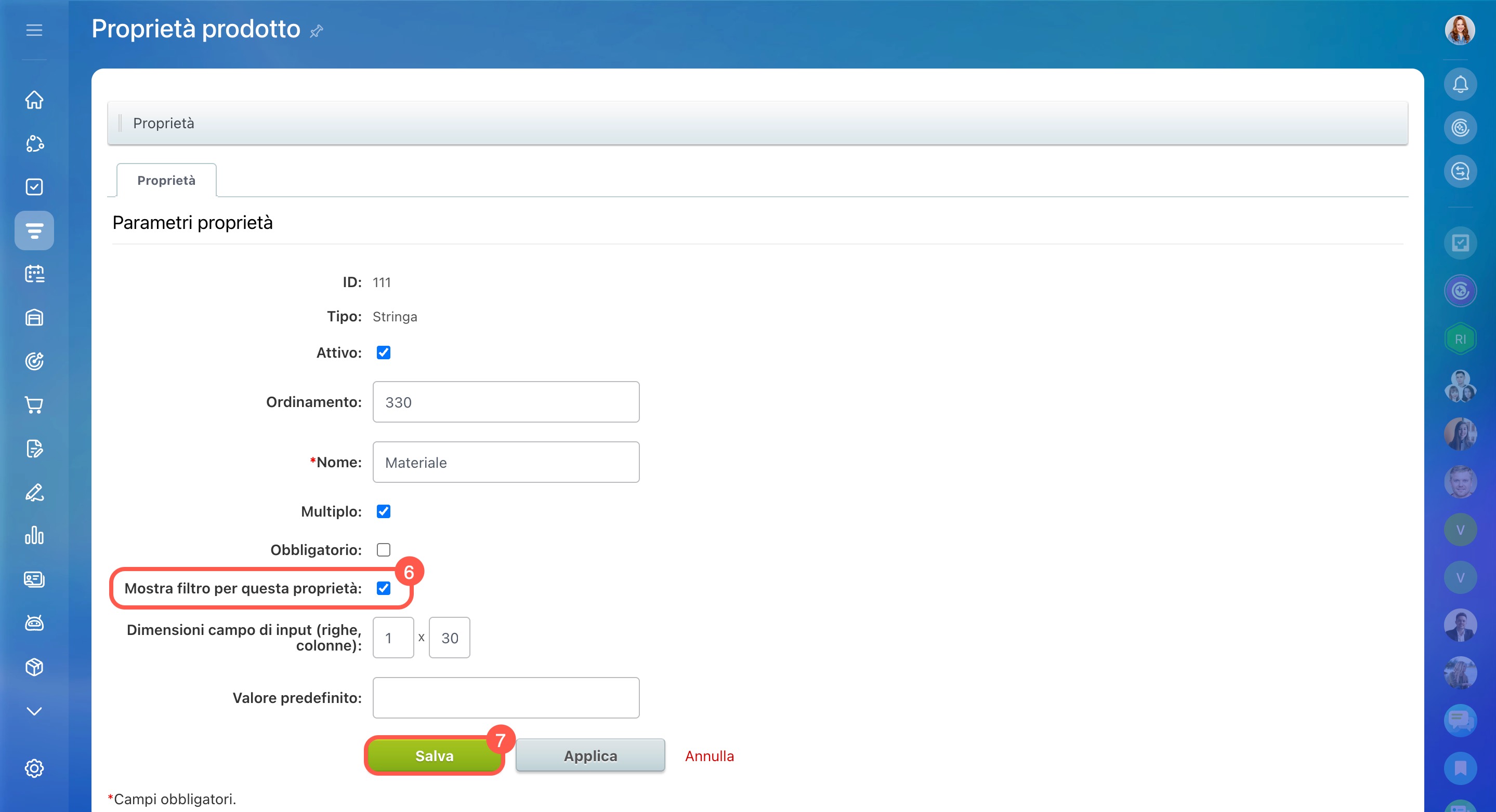 Se un campo utile non è disponibile nell’elenco dei filtri, puoi aggiungerlo dalle impostazioni delle proprietà dei prodotti. Questa operazione può essere eseguita dall’amministratore di Bitrix24 o del CRM.