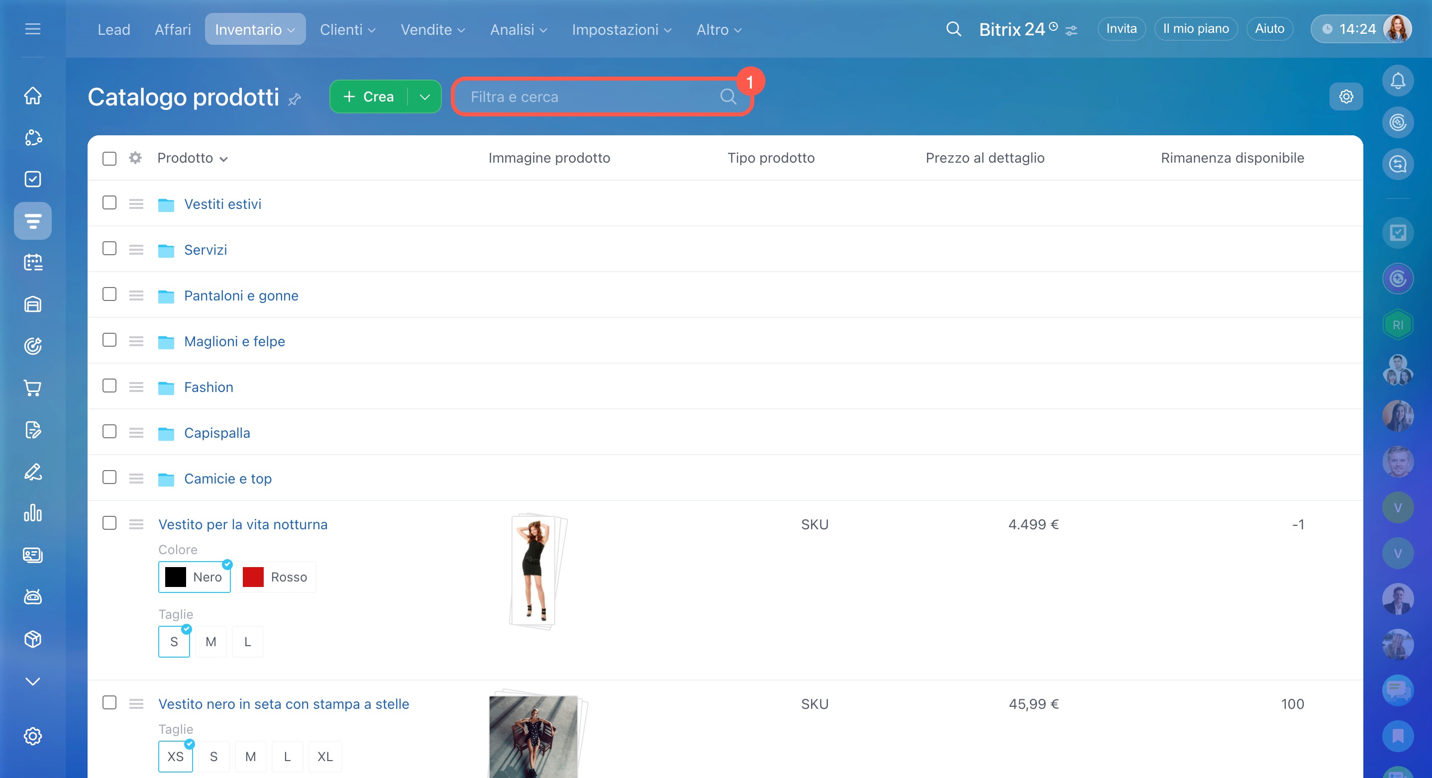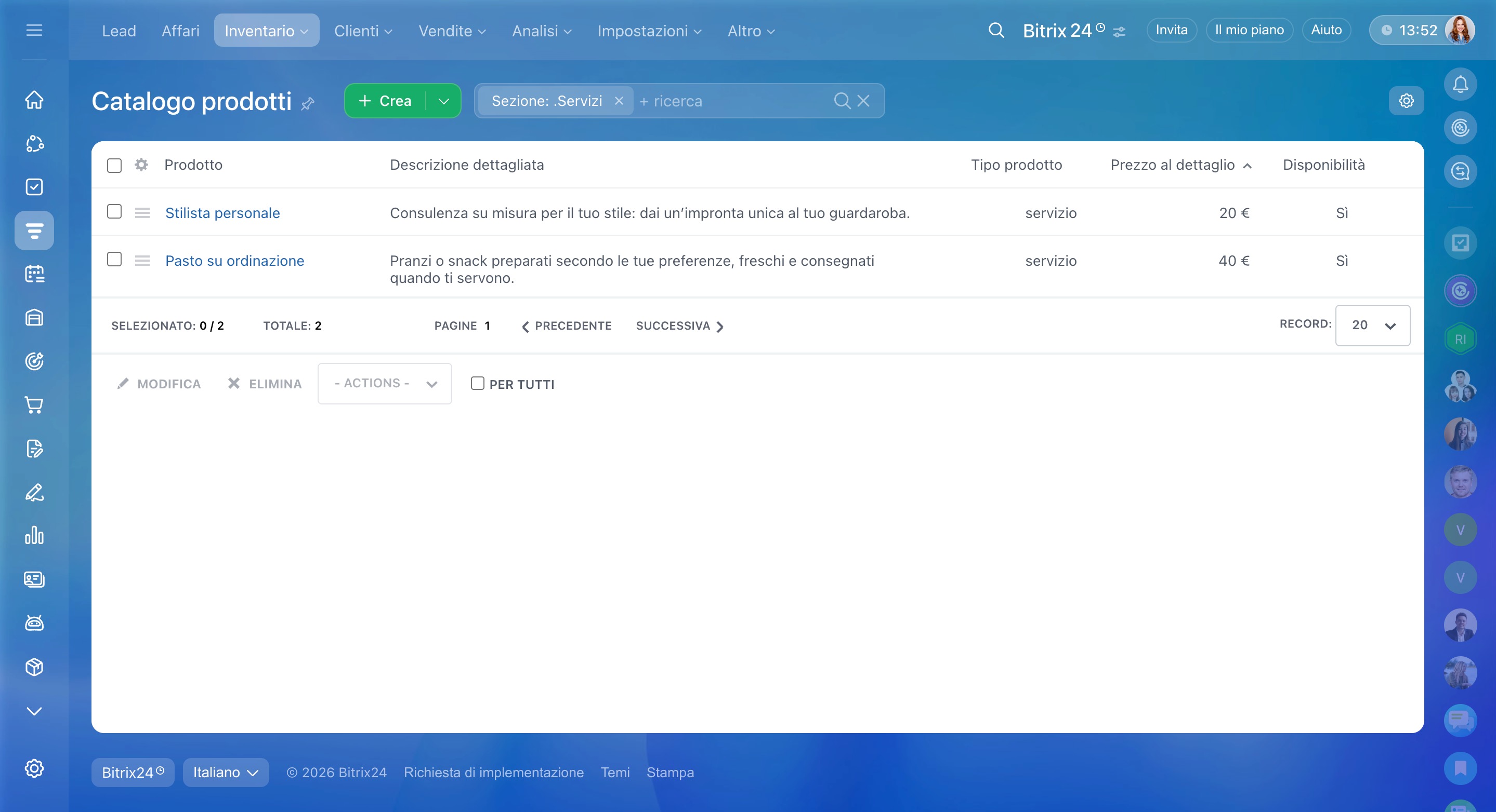 - Grazie al catalogo, puoi trovare facilmente le voci necessarie e aggiungerle ai lead, agli affari, alle fatture e ai preventivi.