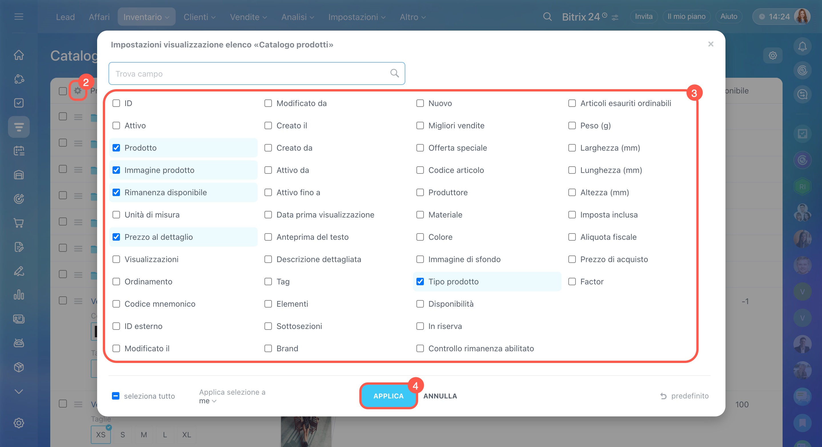 Puoi anche personalizzare l’elenco di prodotti e servizi in base alle tue esigenze, scegliendo quali informazioni visualizzare. Fai clic su Impostazioni (⚙️), seleziona le colonne da mostrare e poi fai clic su Applica.