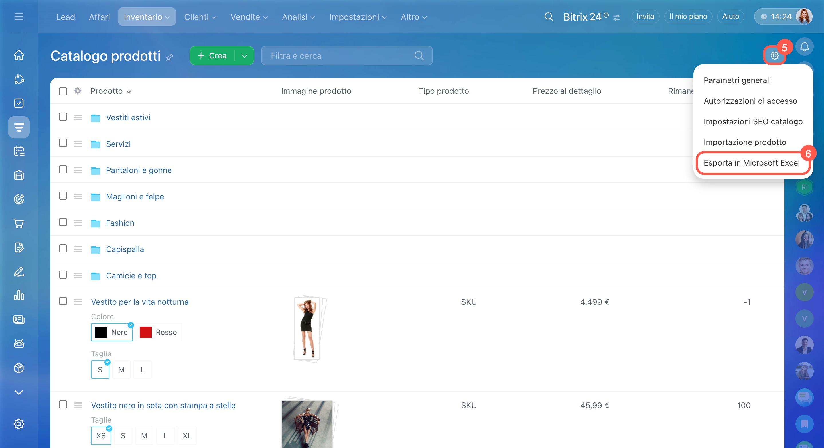 - Prodotti e servizi possono essere importati ed esportati: puoi caricare un elenco esistente in Bitrix24 o esportarlo in Excel per aggiornare i prezzi o preparare un listino prezzi.