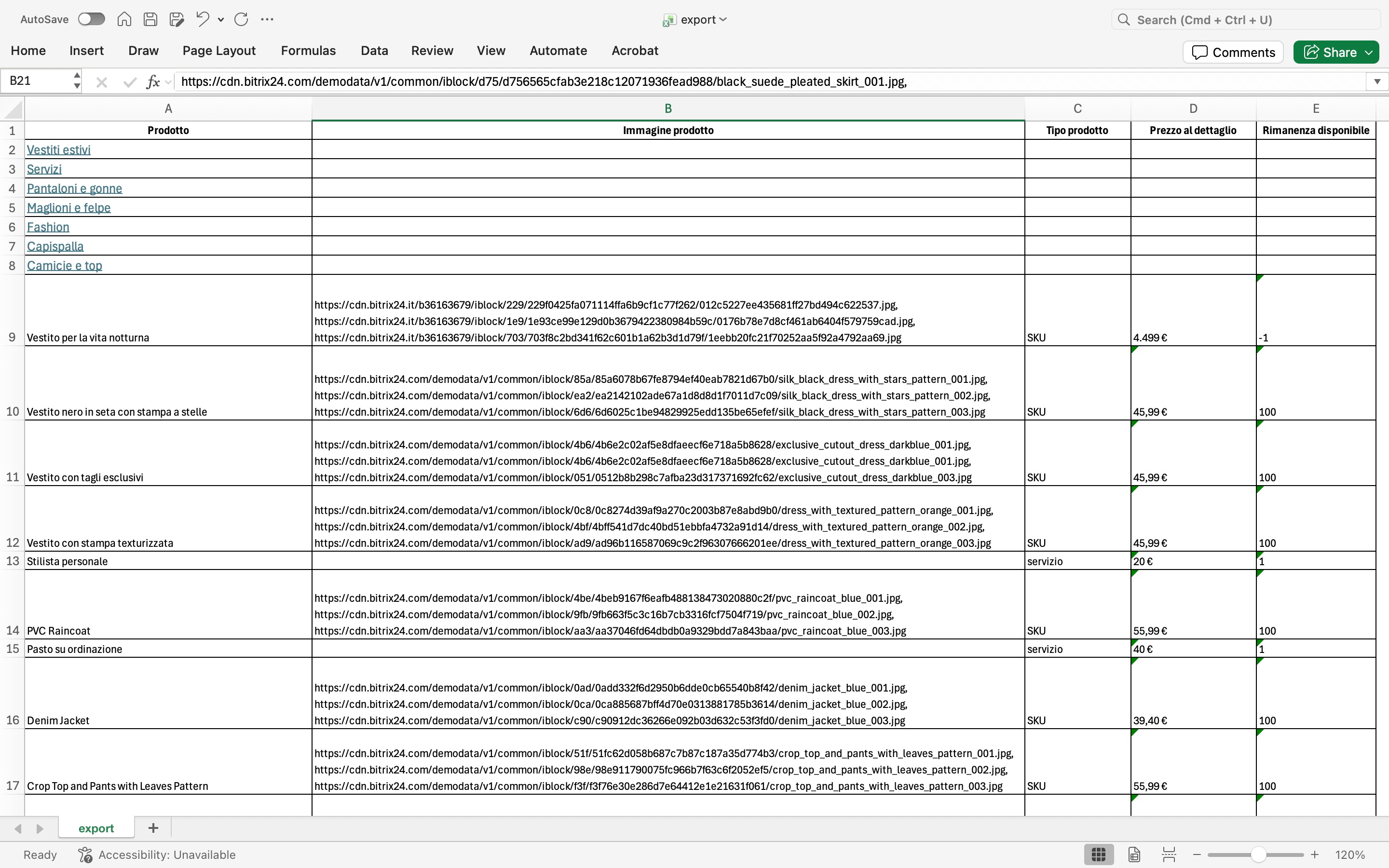 Quando esporti l’intero catalogo, i prodotti vengono inseriti in un unico elenco senza mantenere la struttura delle sezioni.
