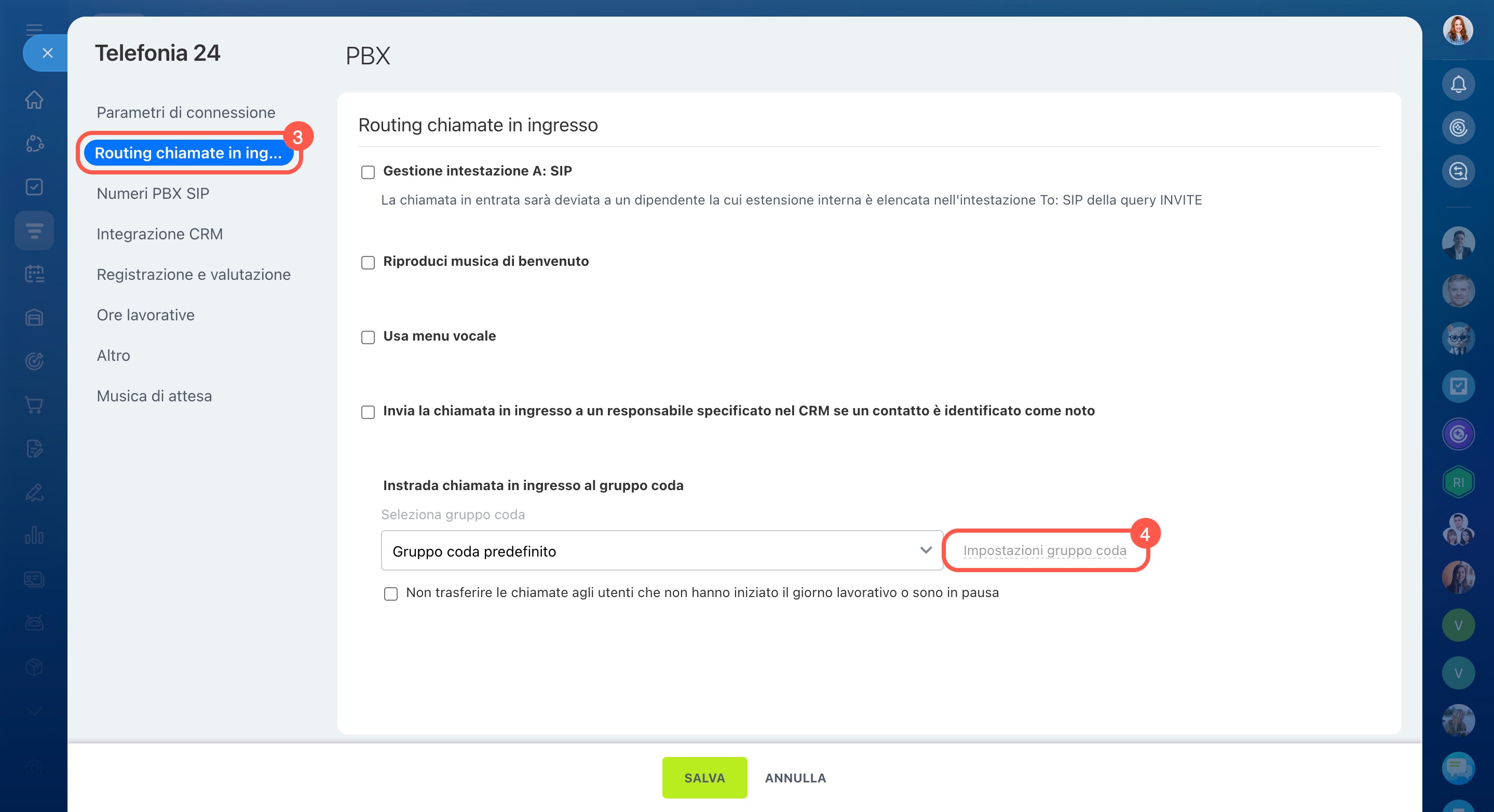 Le chiamate avviate da un modulo CRM vengono indirizzate ai dipendenti definiti nelle impostazioni del numero, nella sezione Telefonia > Configura numeri > Routing chiamate in ingresso > Impostazioni gruppo coda, e non al responsabile del modulo.