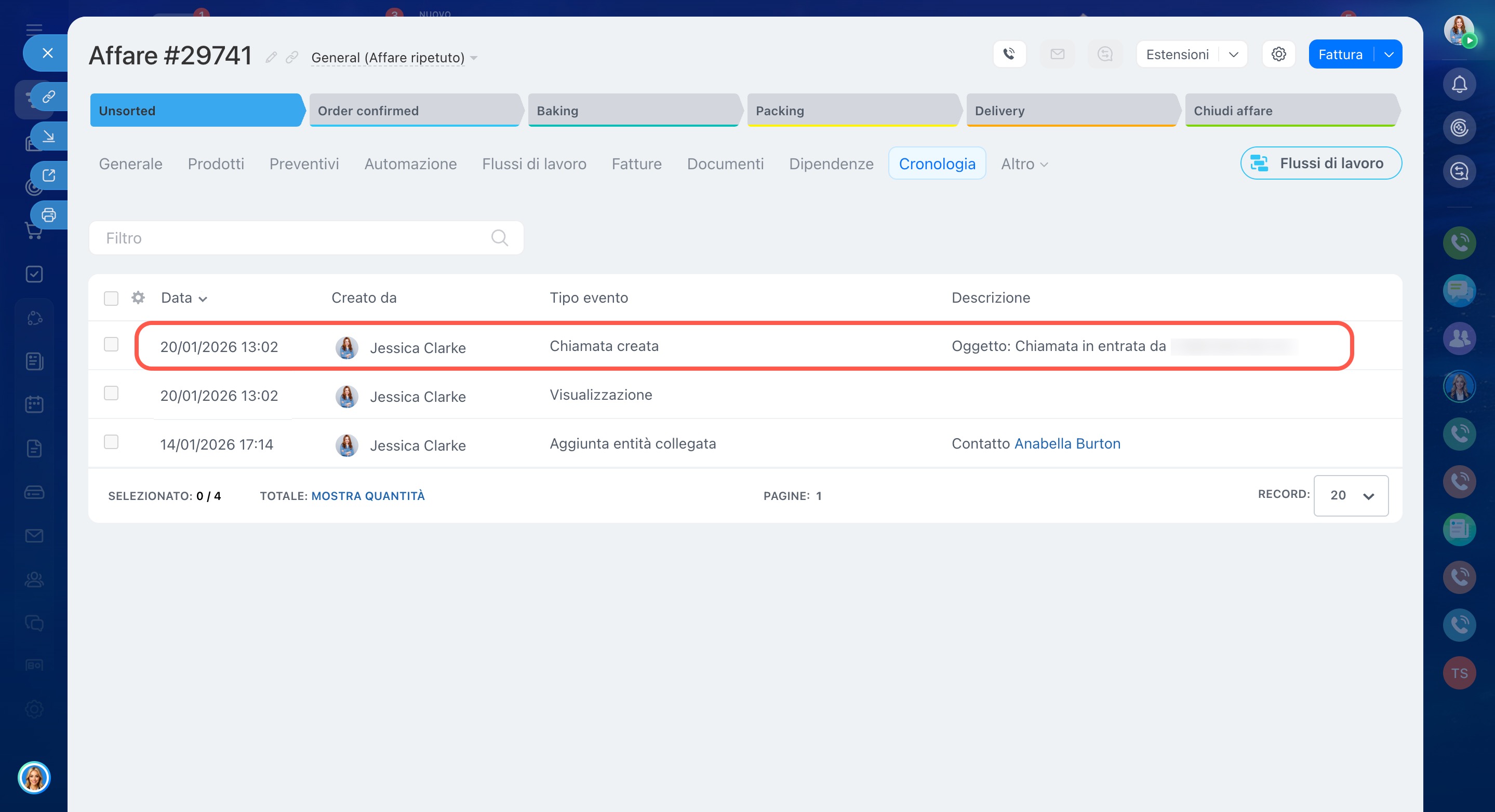 Per visualizzare la data e l’ora reali della chiamata, apri la cronologia della scheda CRM: troverai l’evento Chiamata creata con l’orario corretto.