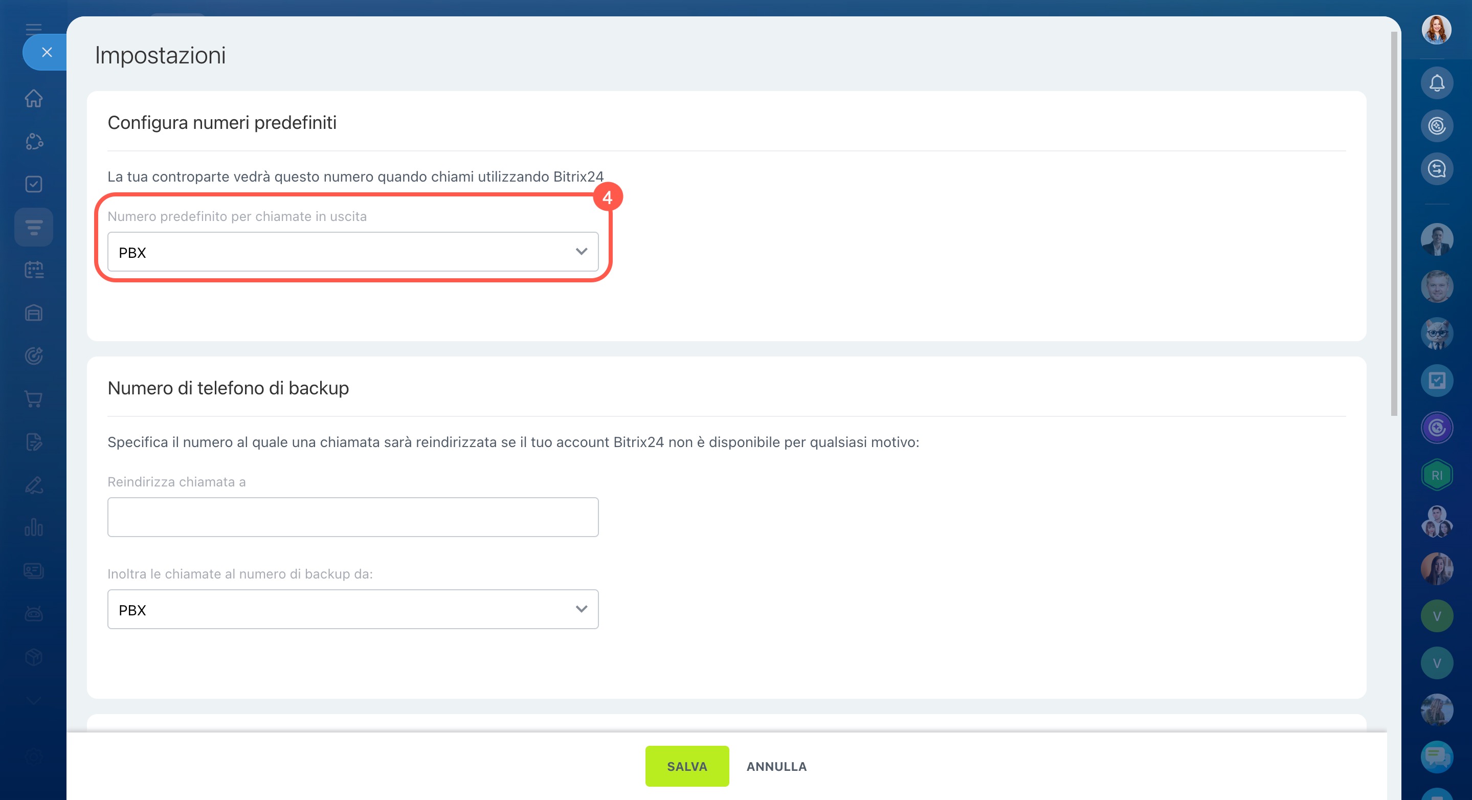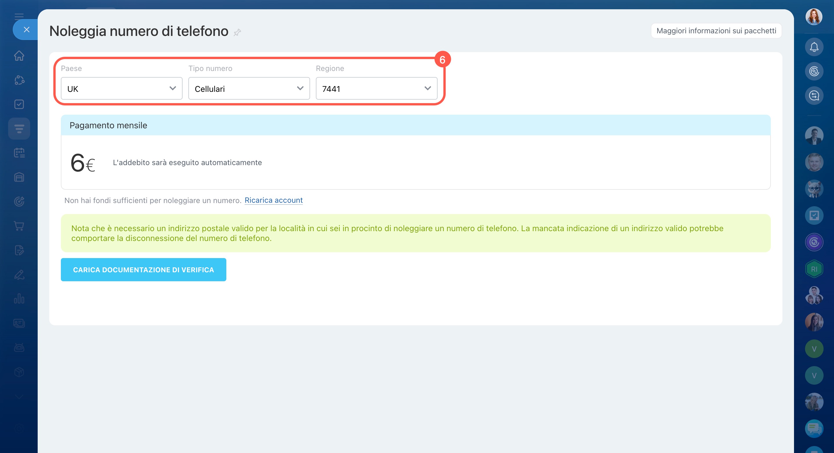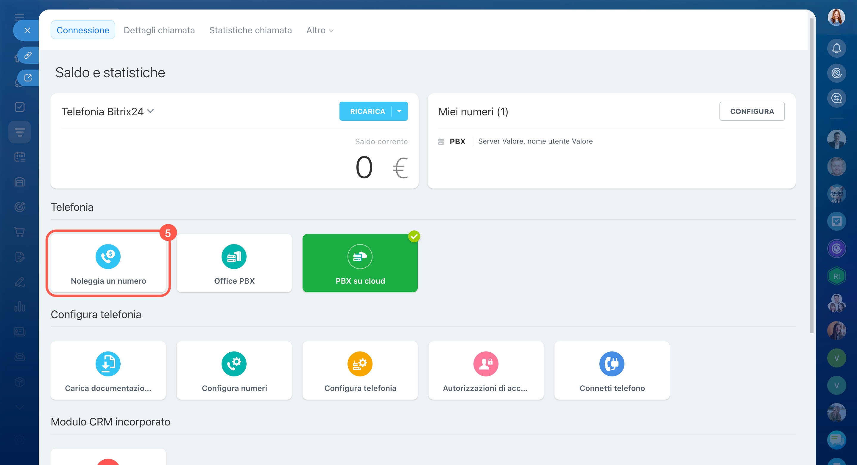 In Bitrix24 non ci sono limiti al numero di numeri che puoi noleggiare. La disponibilità dei numeri dipende dall’operatore e dal paese, dalla regione e dal tipo di numero richiesti.