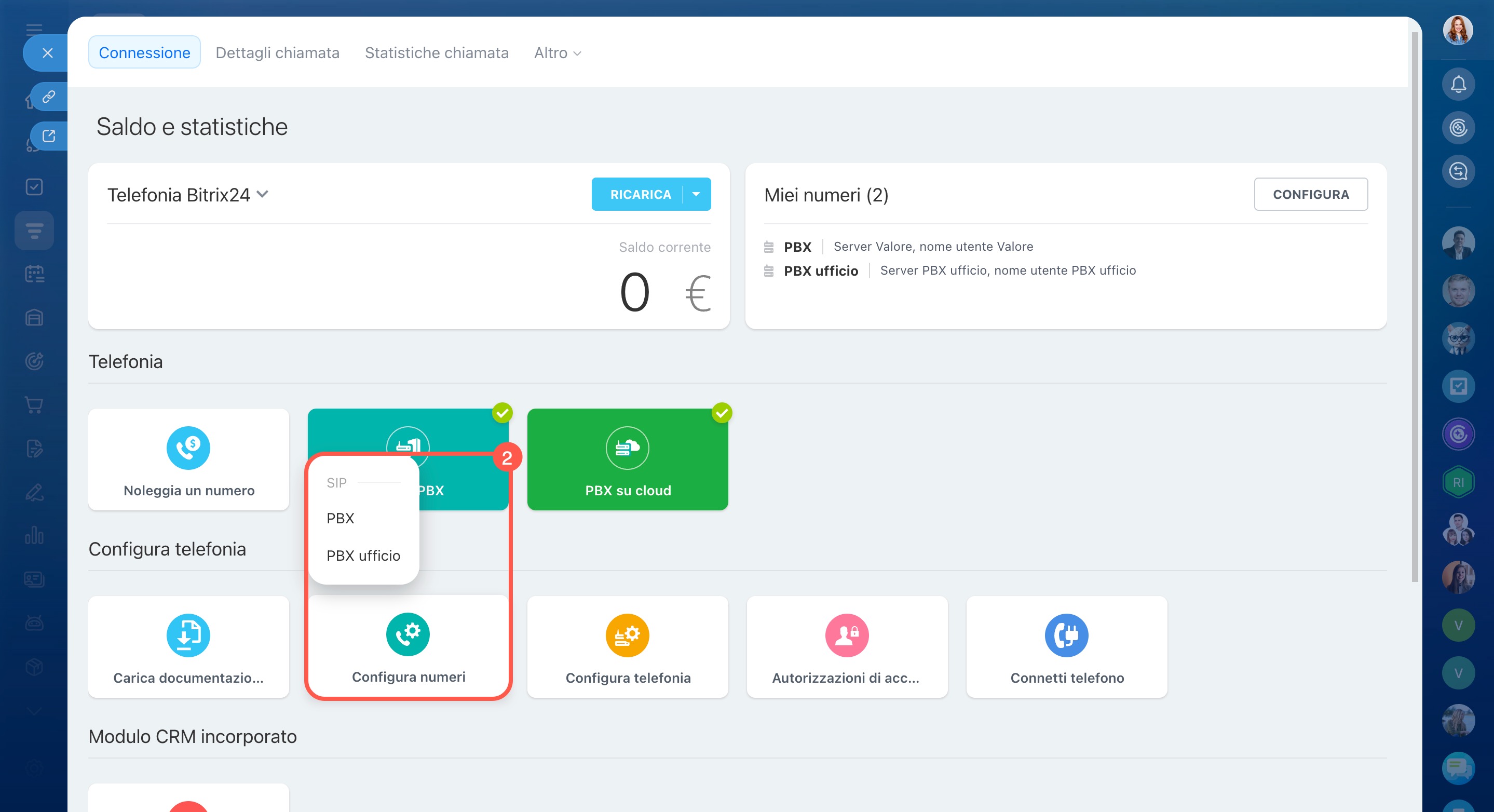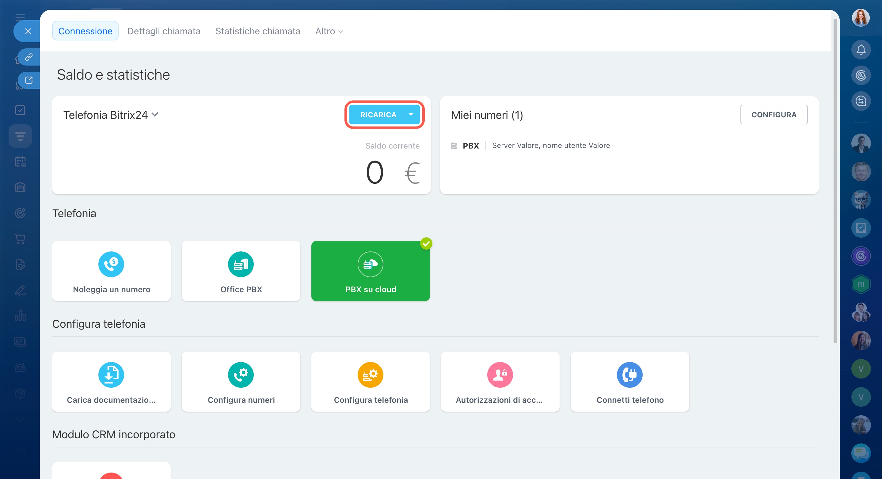 Quando colleghi la telefonia tramite il connettore SIP, i costi delle chiamate vengono pagati direttamente all’operatore del SIP PBX. Non è necessario ricaricare il saldo della telefonia in Bitrix24.