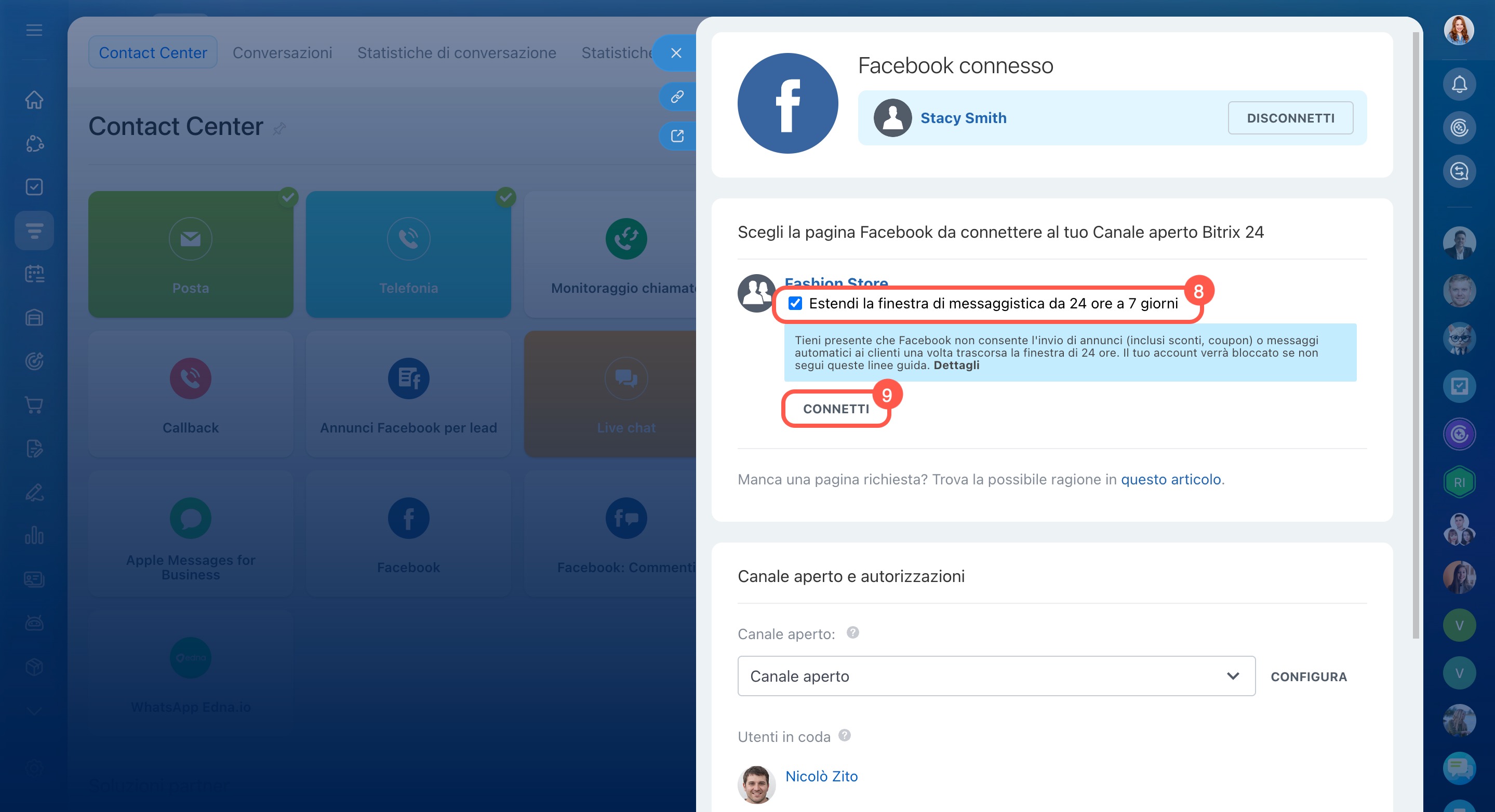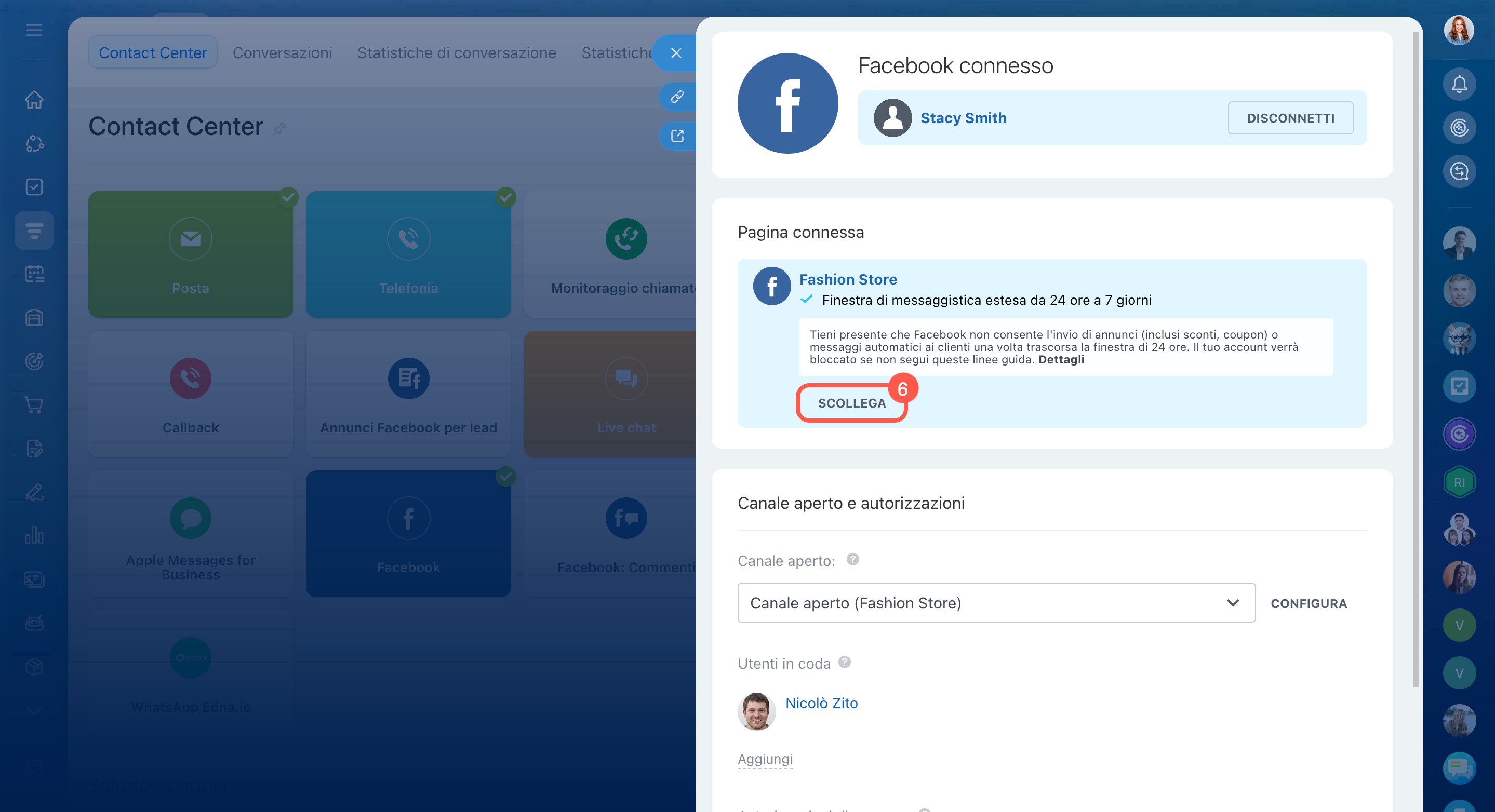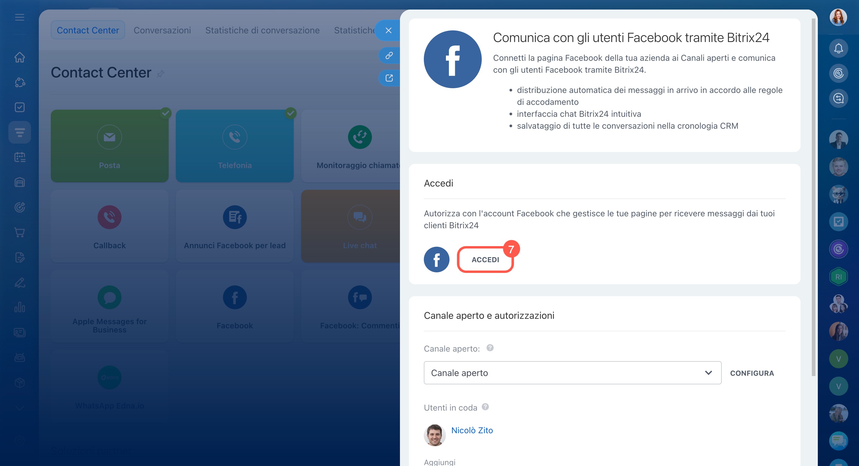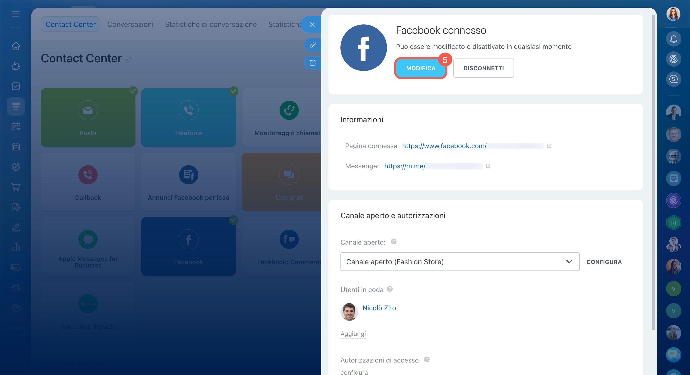 - Vai su CRM > Clienti > Contact Center > Facebook o Instagram Direct.