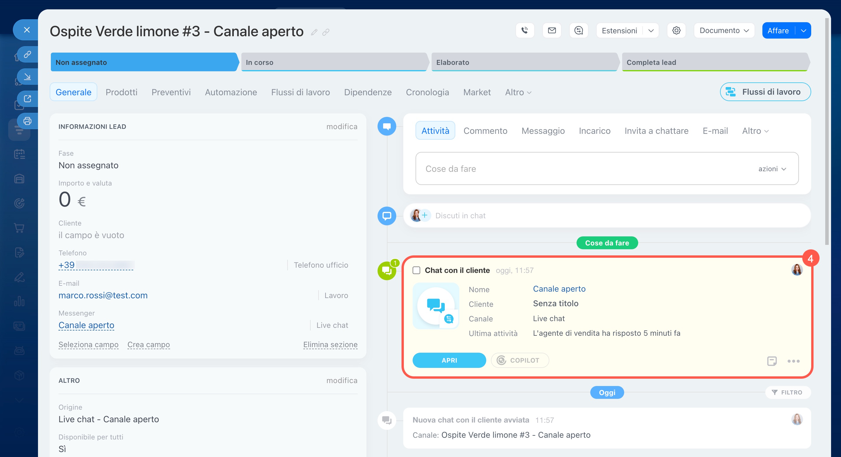 - Utente — il profilo automatico del visitatore, creato per collegare la chat al CRM senza bisogno di accesso.