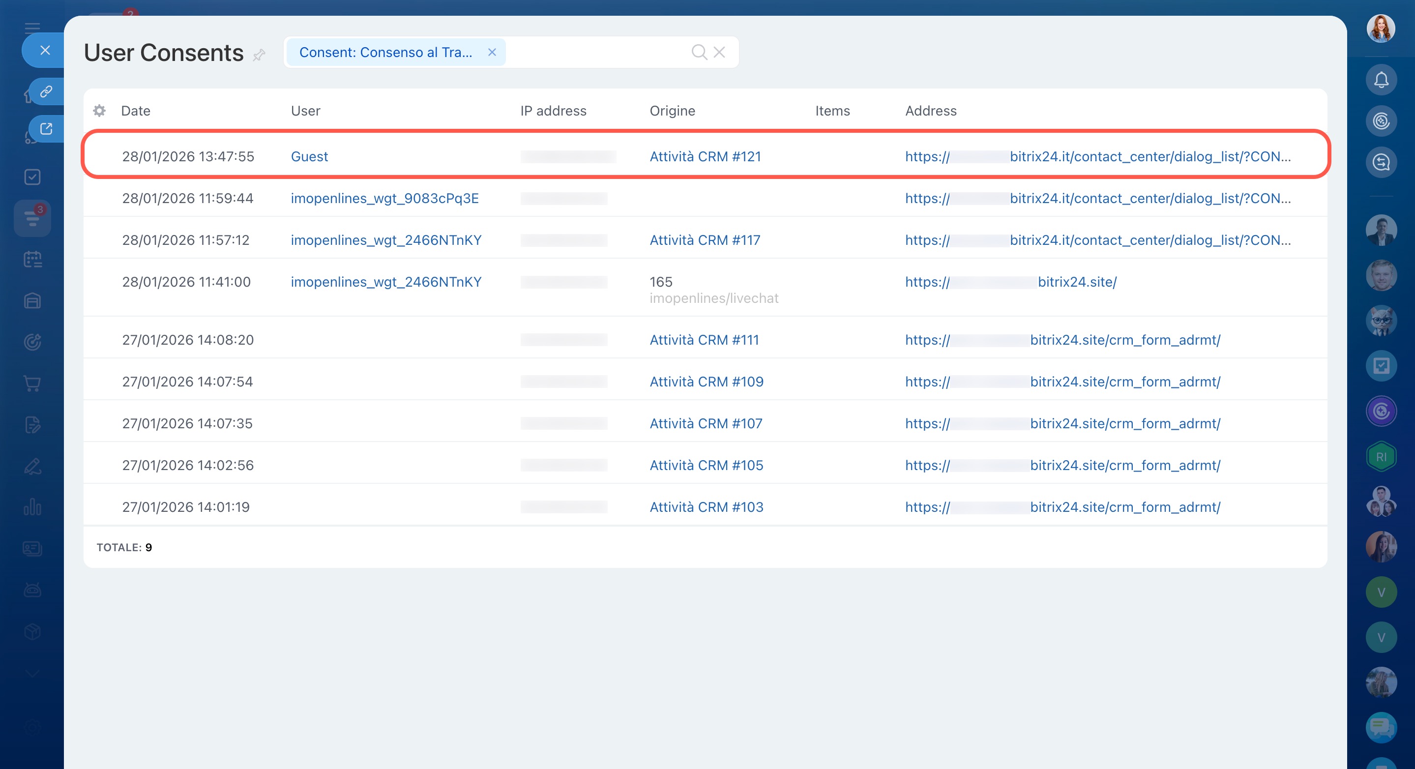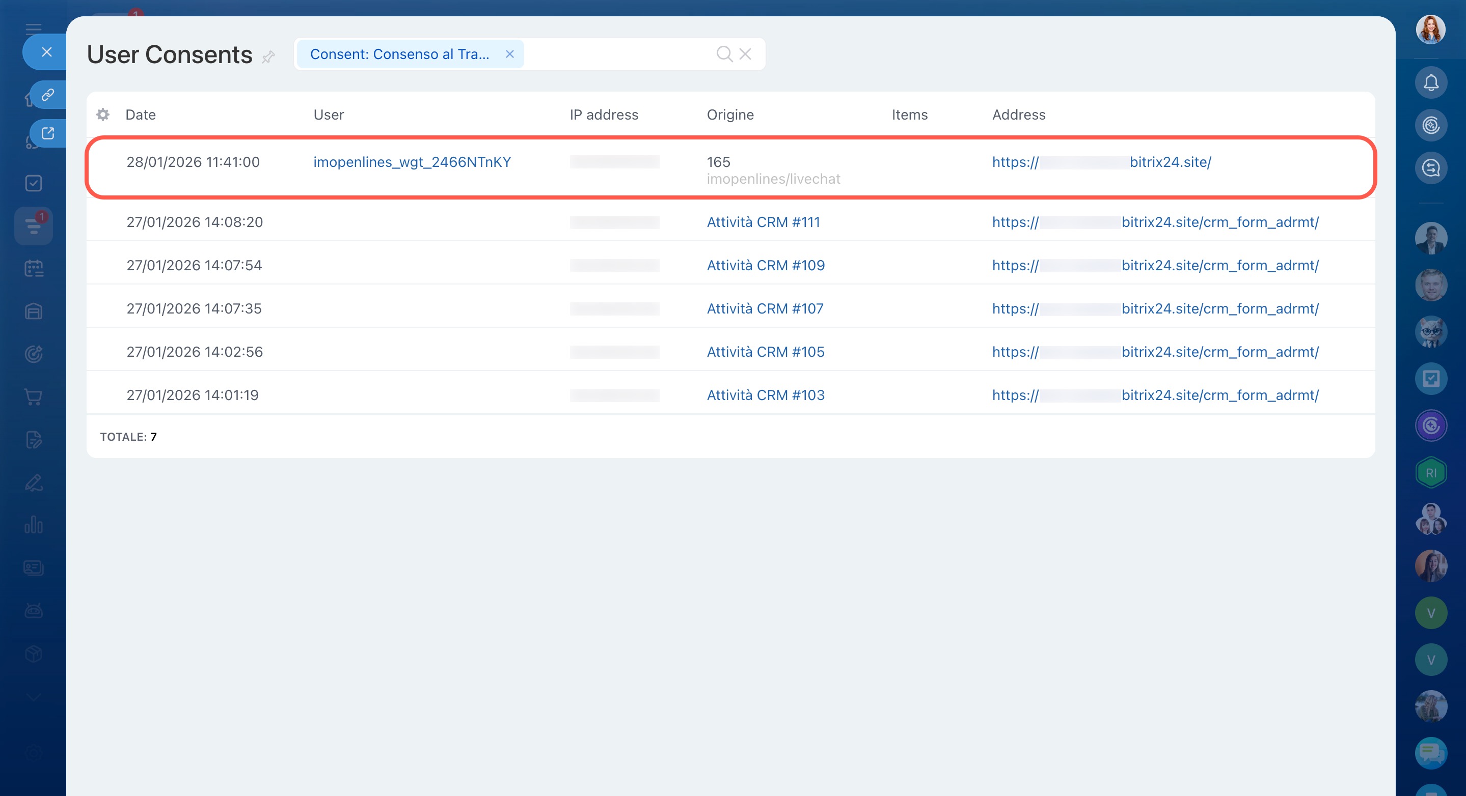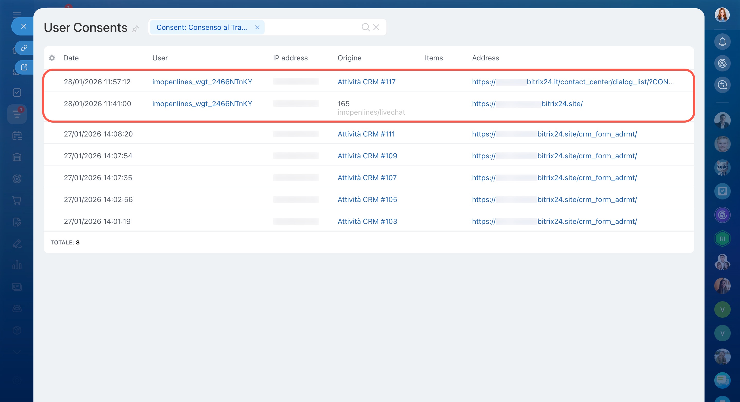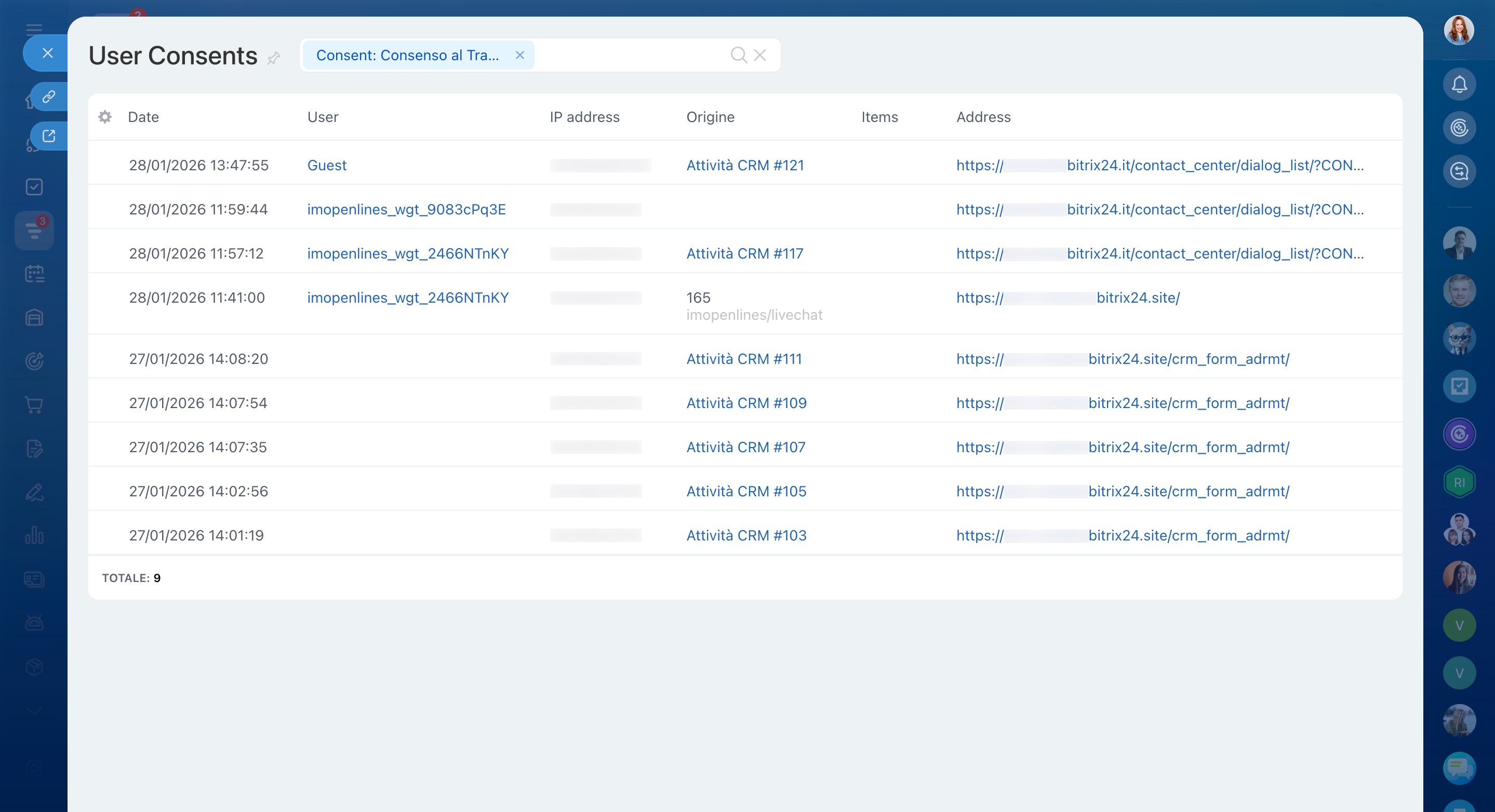 La legge richiede il consenso per trattare i dati personali, come previsto nell’Unione Europea. Bitrix24 consente di raccogliere automaticamente il consenso al trattamento dei dati personali tramite canali aperti, come chat live o app di messaggistica.