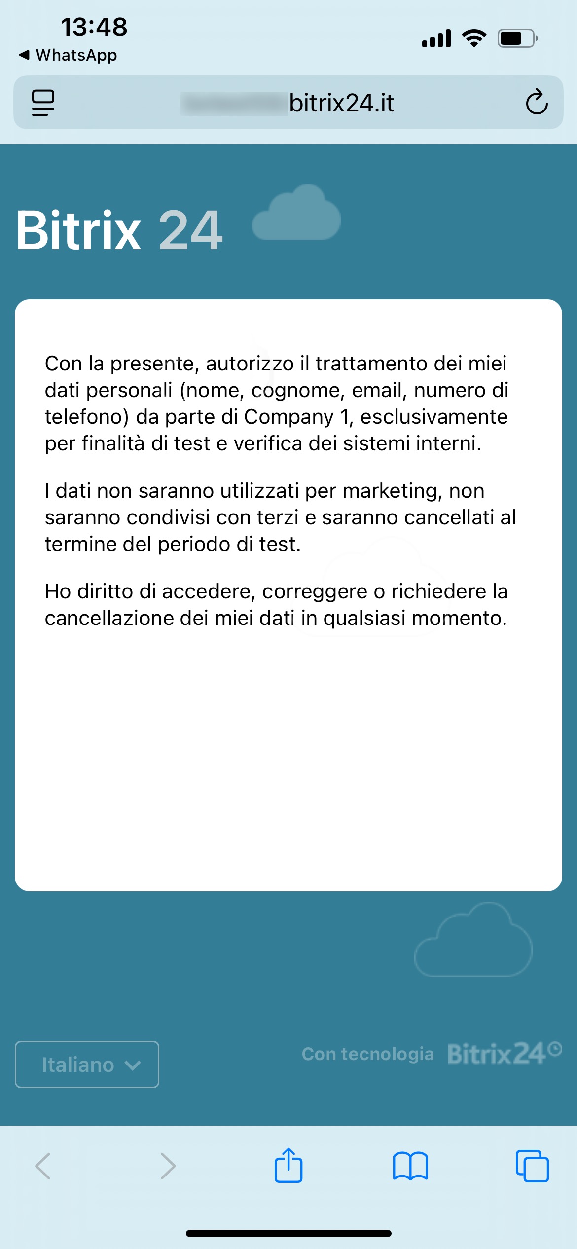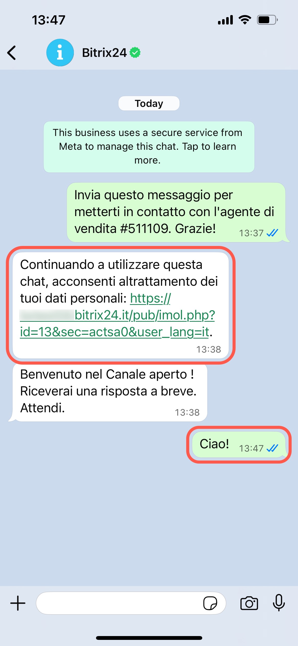 - Accetto — in Bitrix24 si apre una nuova conversazione e il consenso del cliente viene salvato nel CRM.