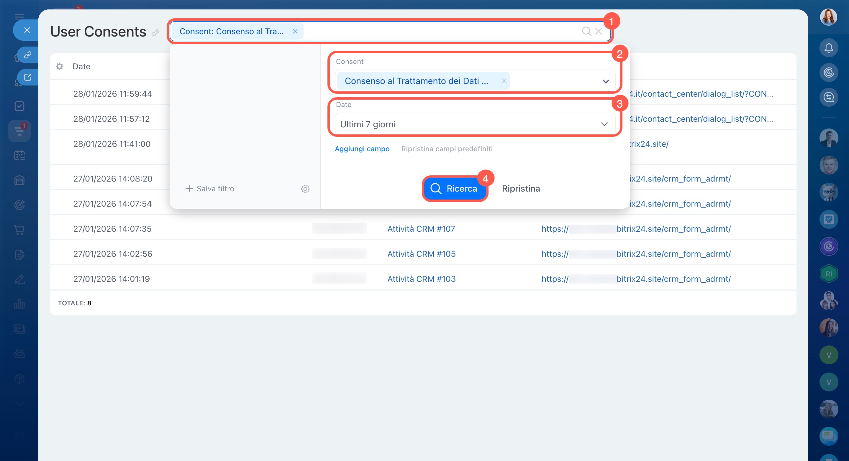 Puoi ordinare e filtrare i consensi in base ai parametri desiderati, ad esempio per visualizzare tutti i consensi al trattamento dei dati personali ottenuti nell’ultima settimana.