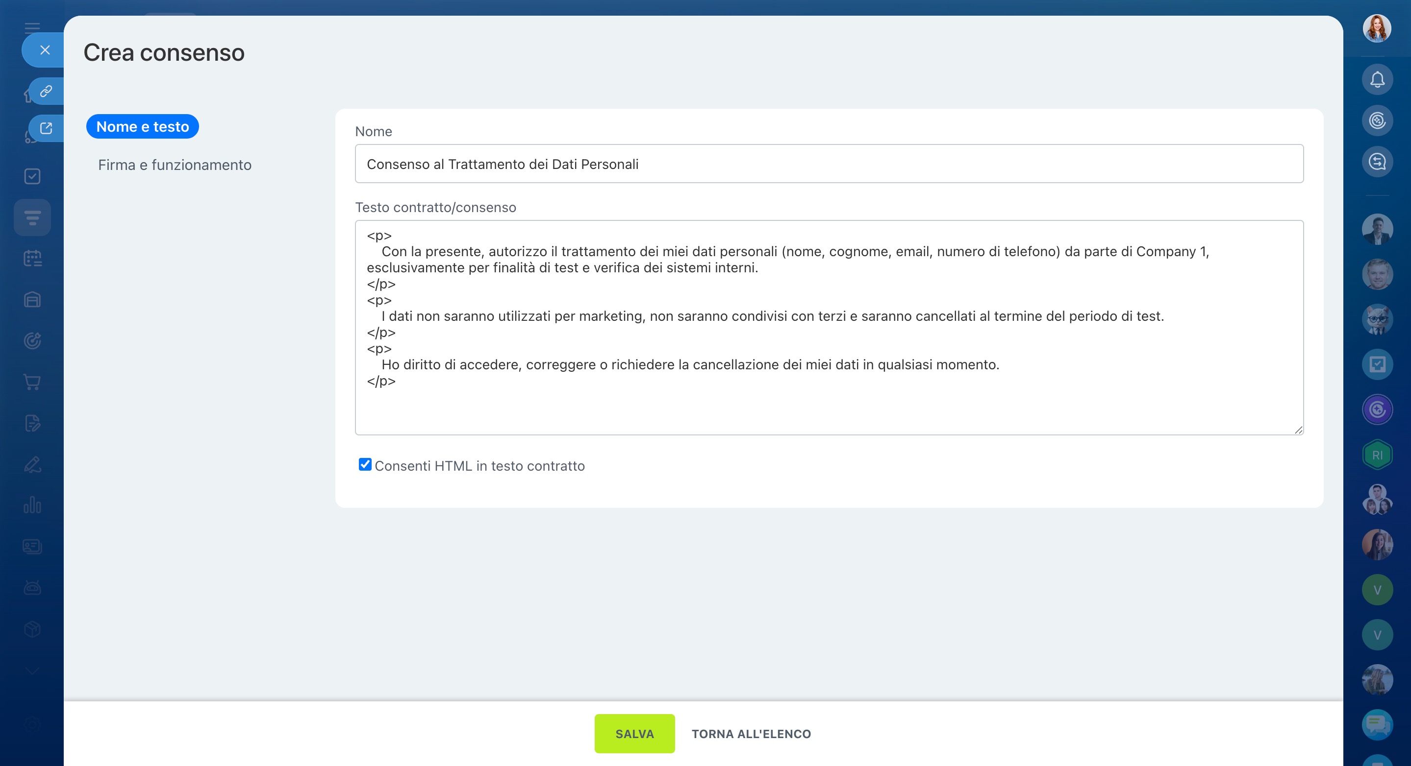 Testo contratto/consenso — puoi scriverlo da zero e formattarlo con HTML, ad esempio per evidenziare i titoli o aggiungere link. Per visualizzare correttamente il testo con i tag, seleziona l’opzione Consenti HTML in testo contratto.