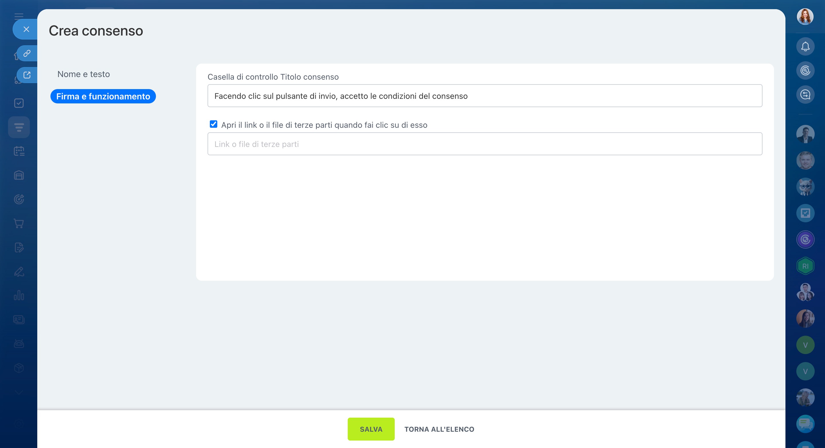 - invia un messaggio, il consenso è considerato confermato e viene salvato nel CRM;
