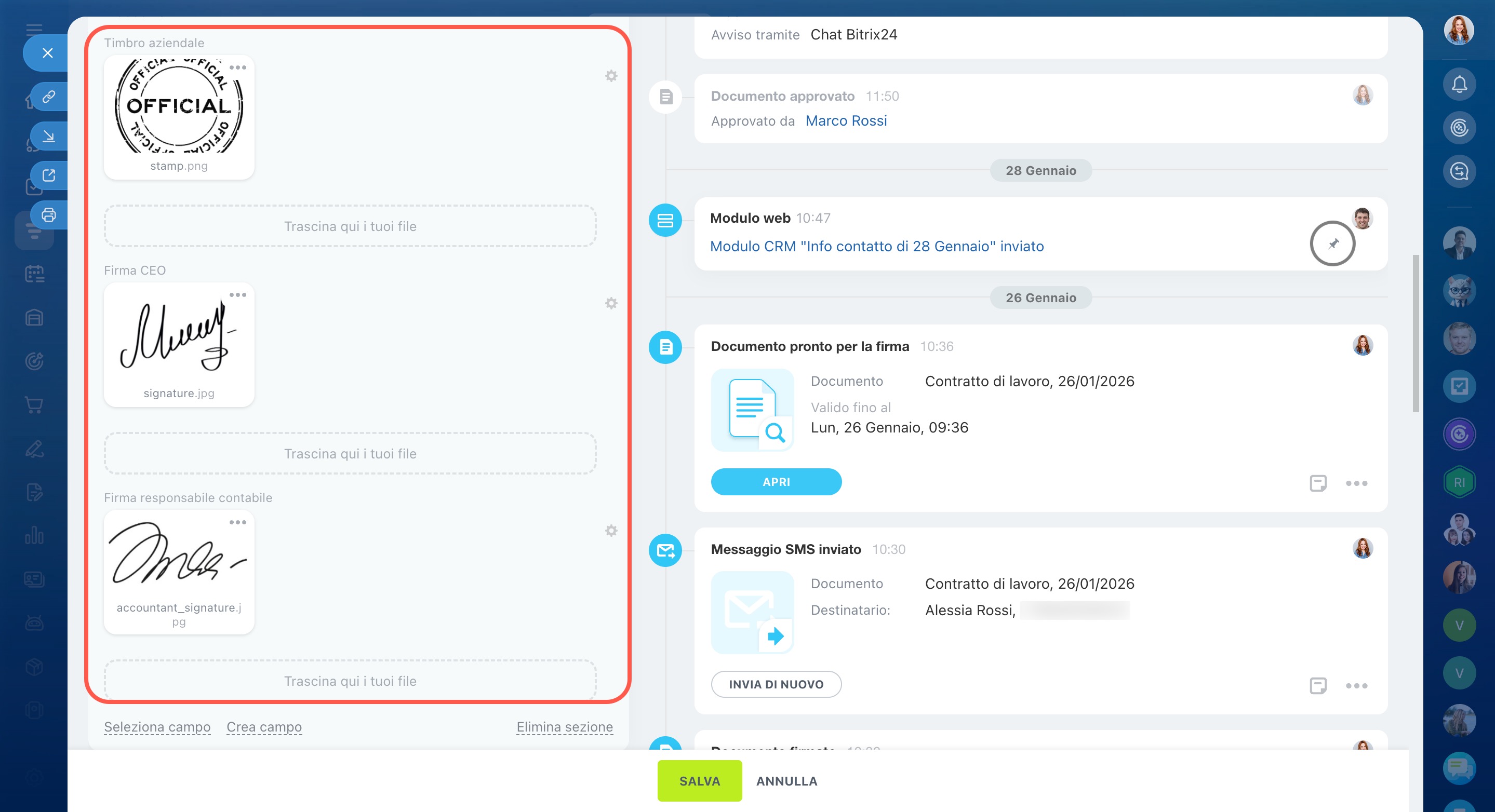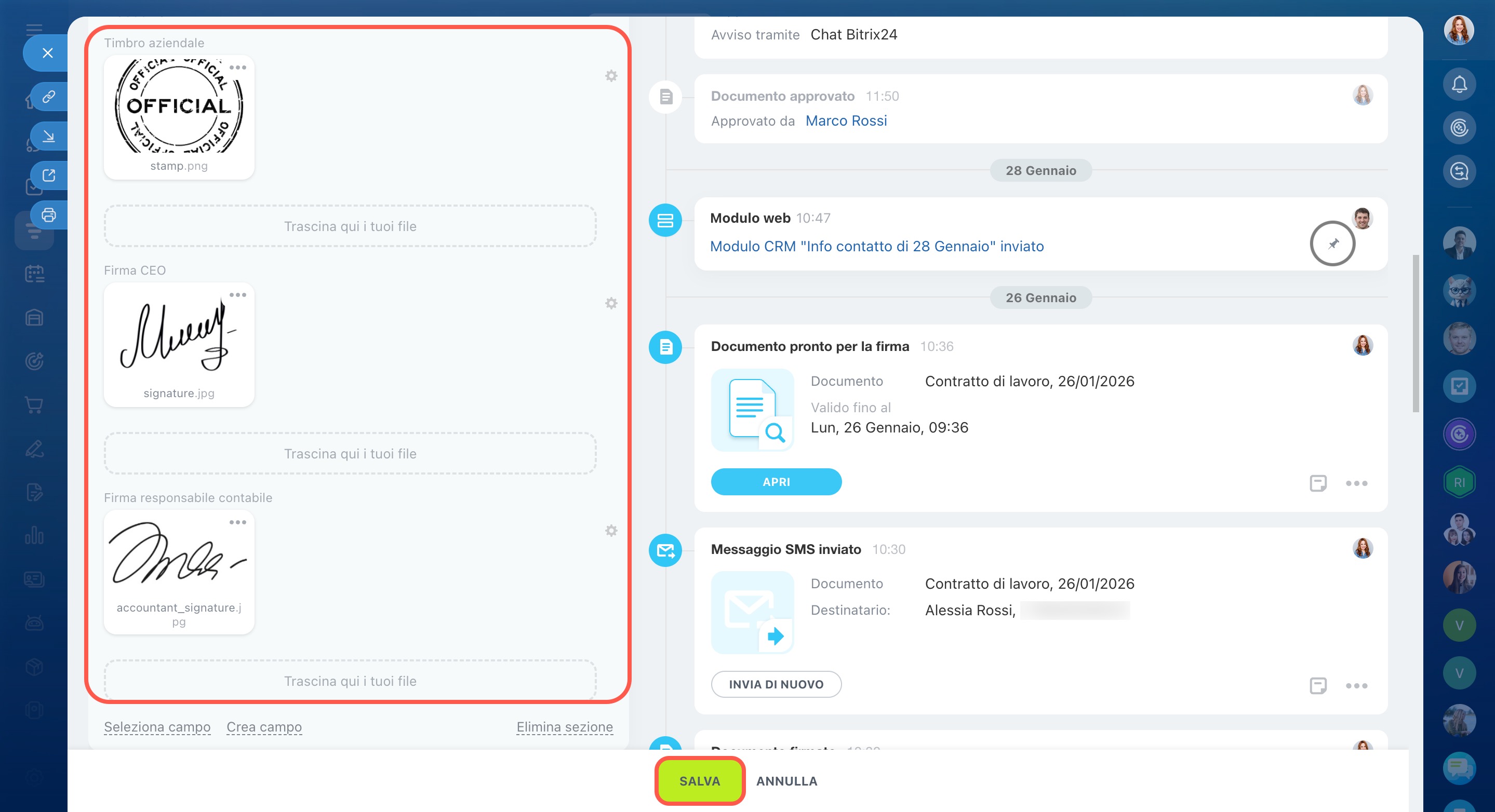 - Oltre alle funzionalità principali, puoi firmare il documento con Bitrix24 Firma elettronica e aggiungere la tua firma e il timbro.