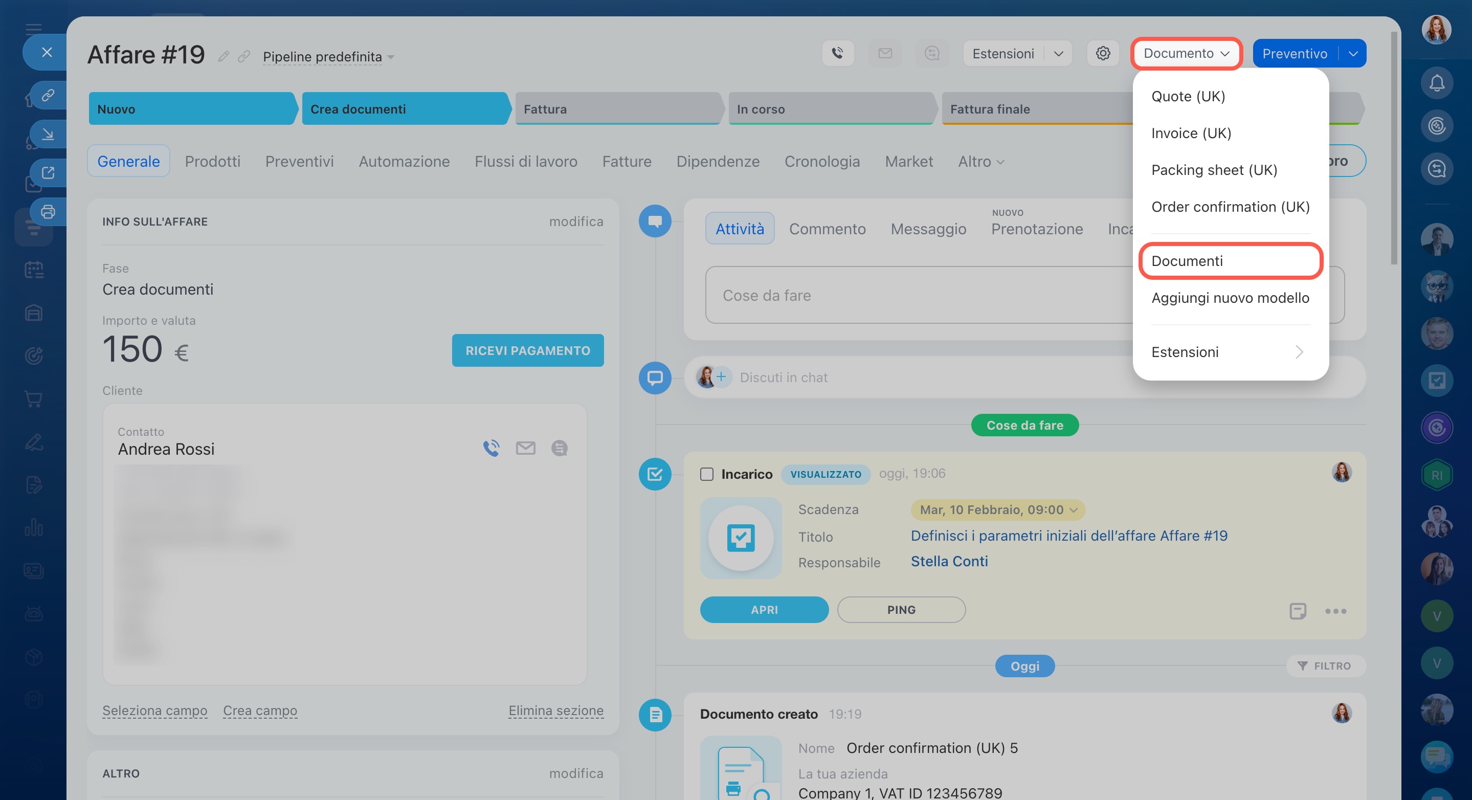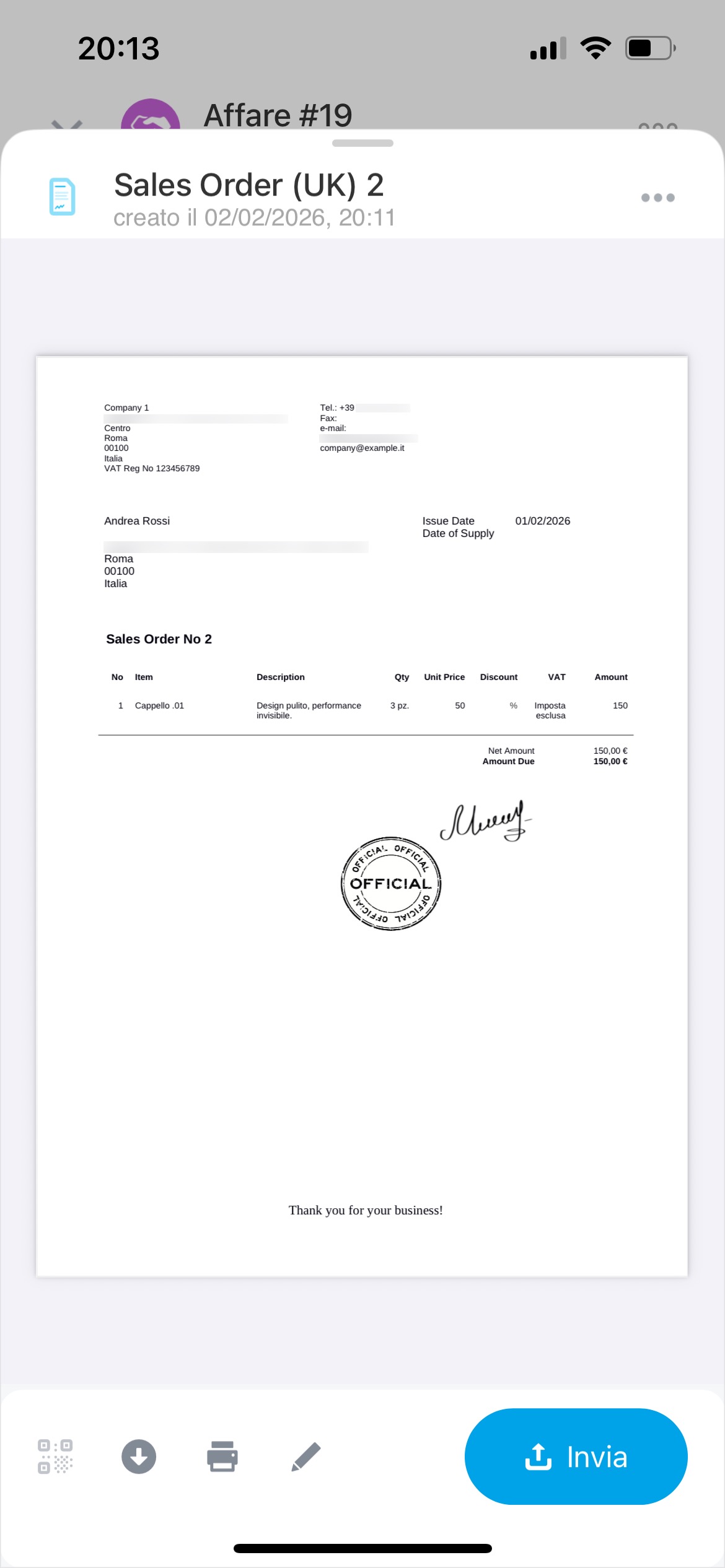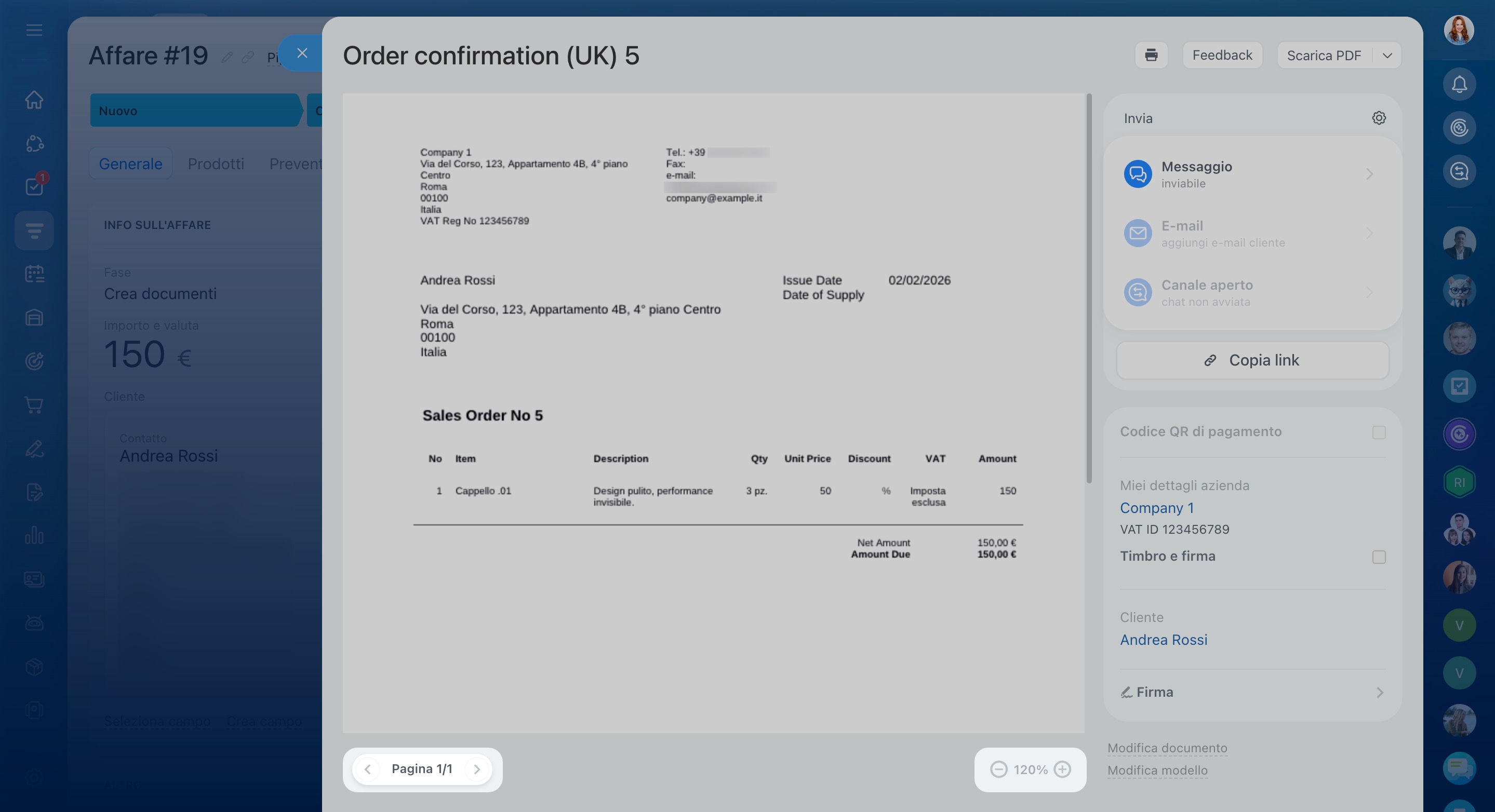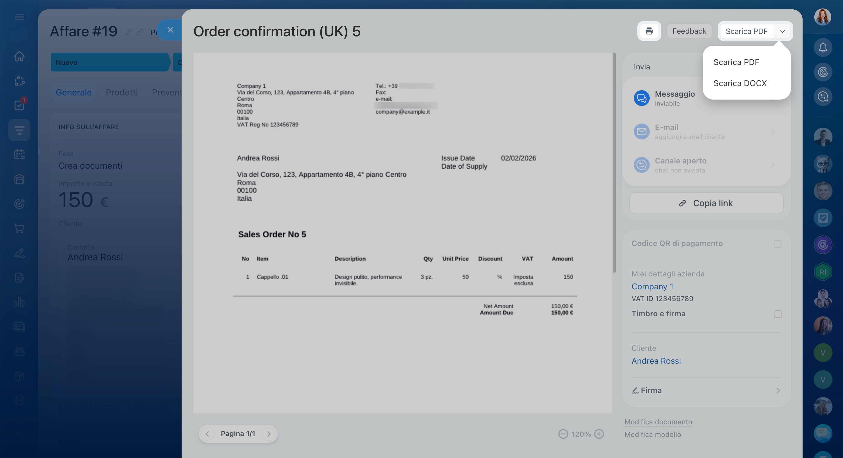 Il CRM genererà automaticamente il documento e inserirà i dati dell’affare, insieme ai dettagli della tua azienda.