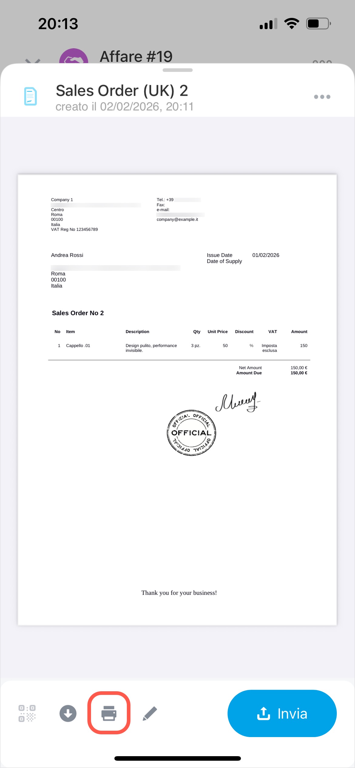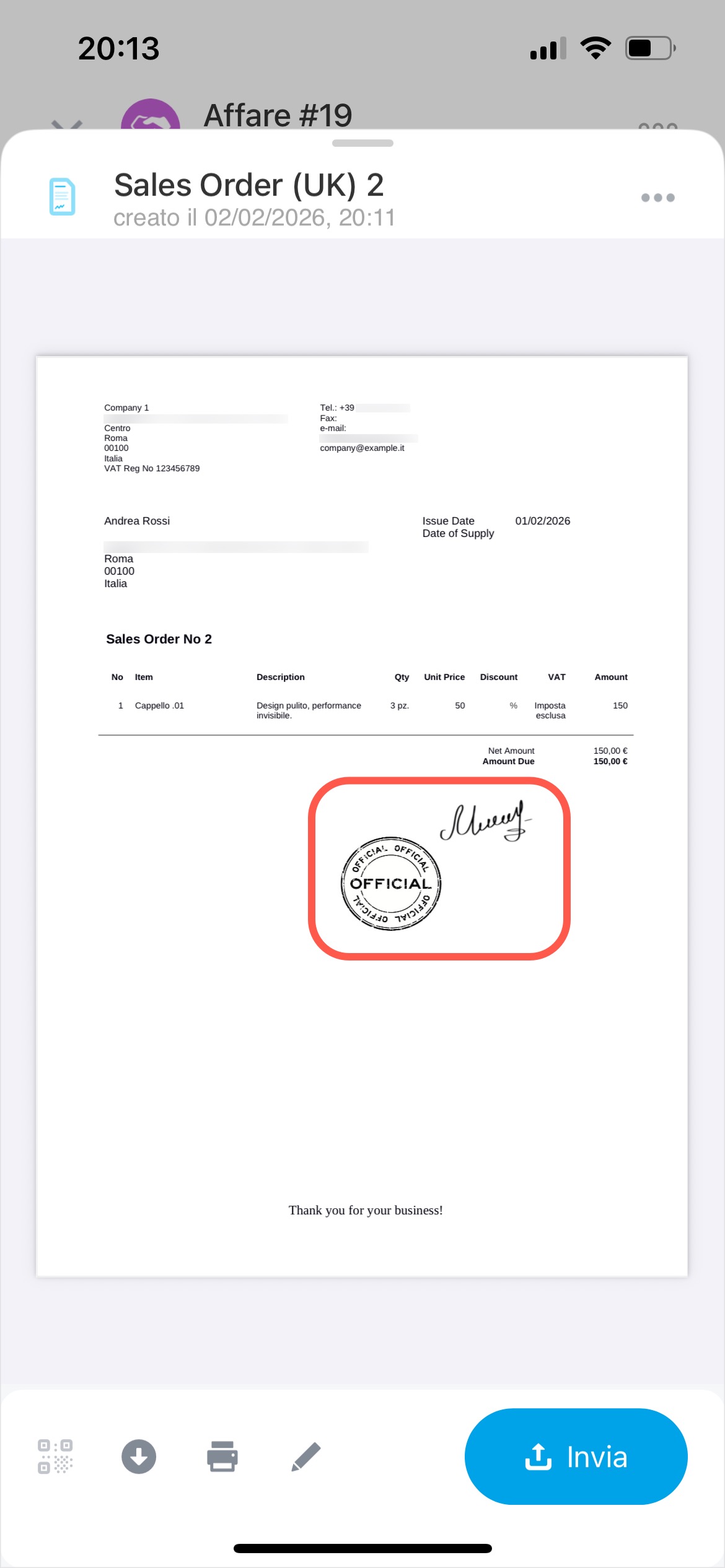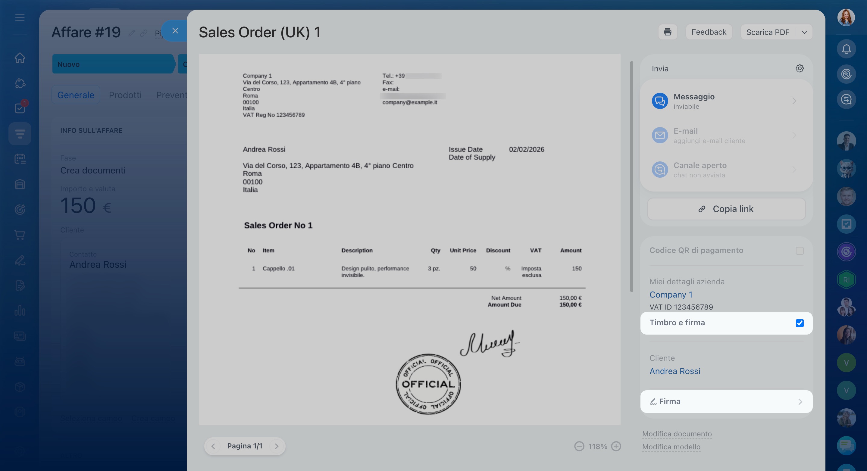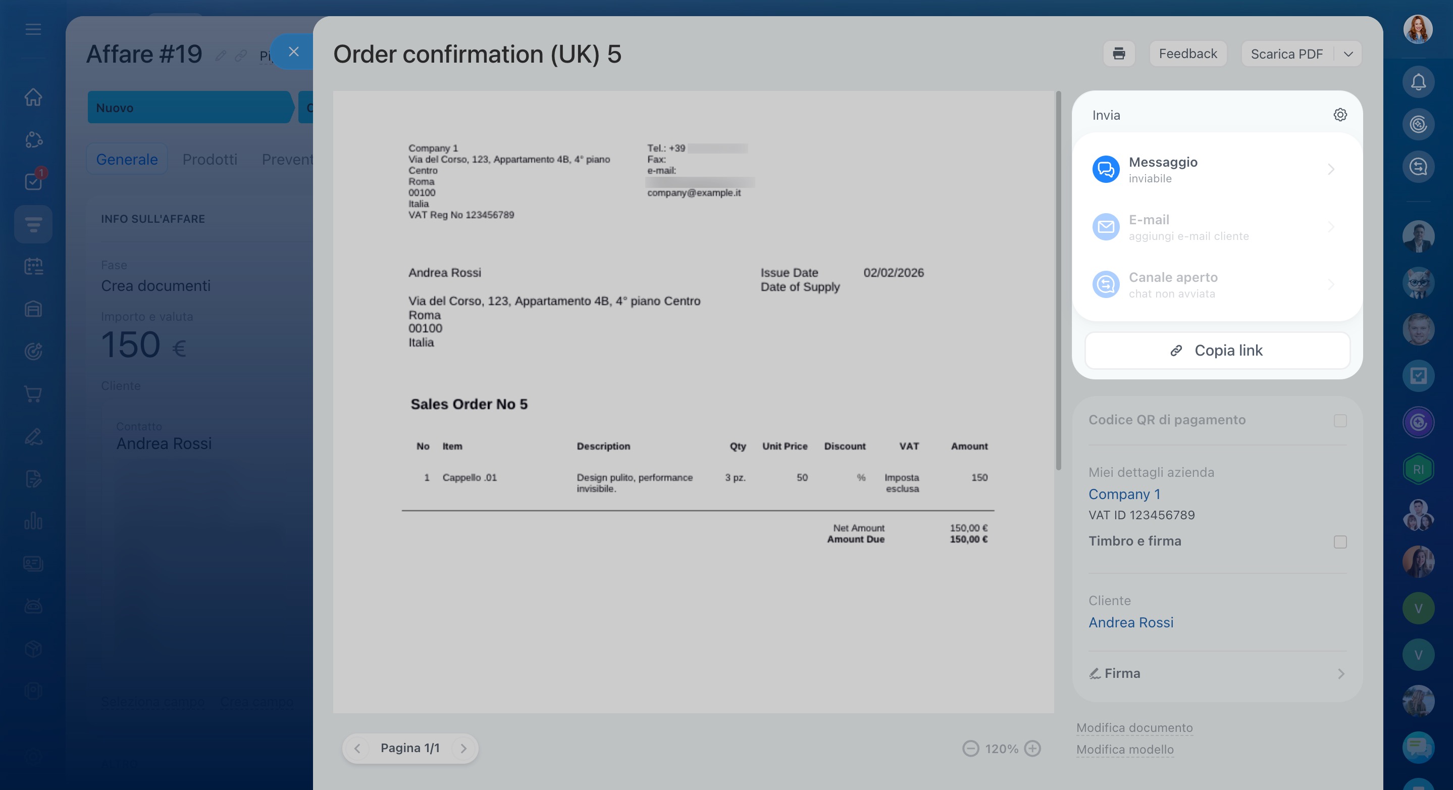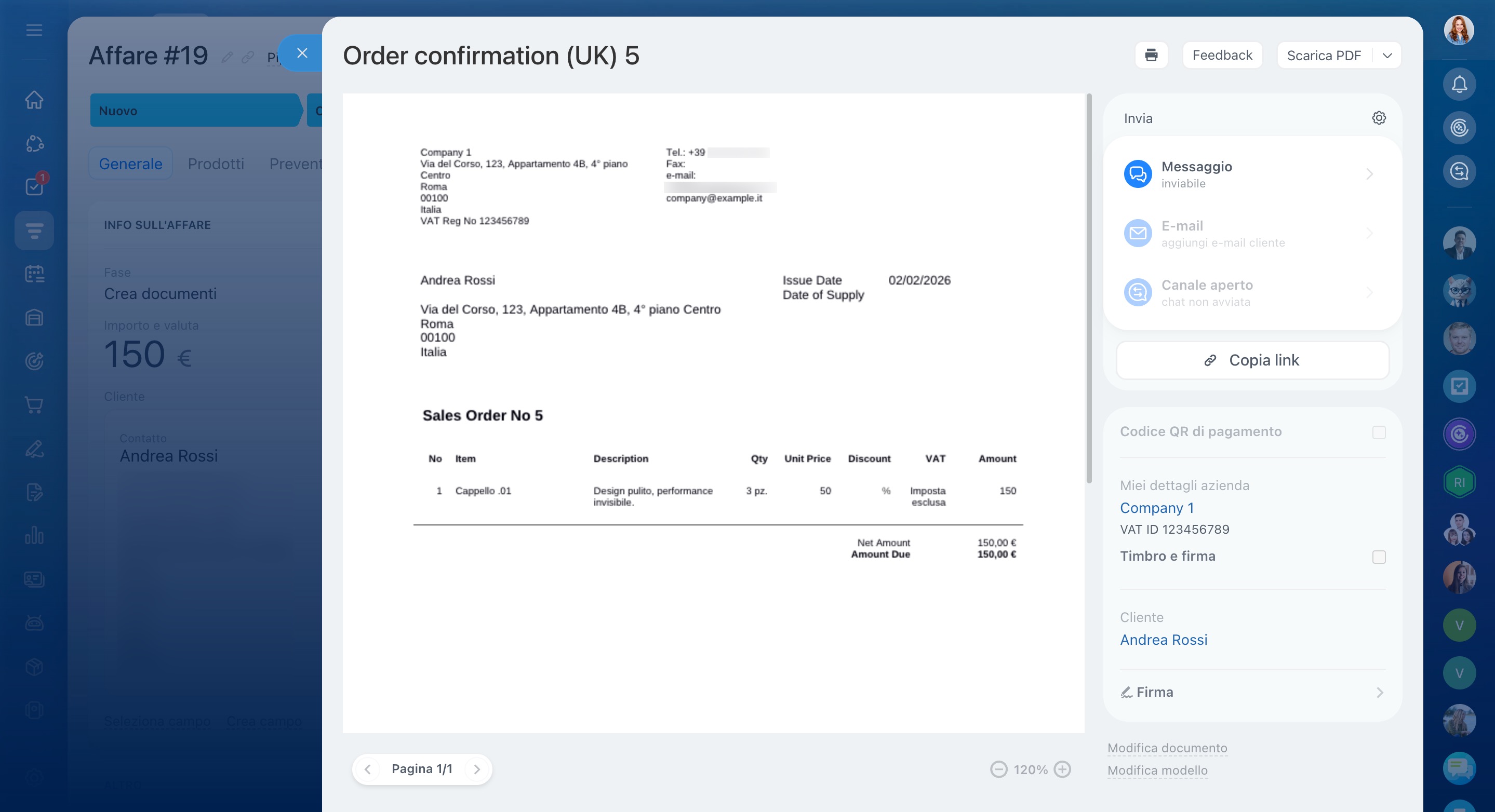 Il CRM genererà automaticamente il documento e inserirà i dati dell’affare, insieme ai dettagli della tua azienda.