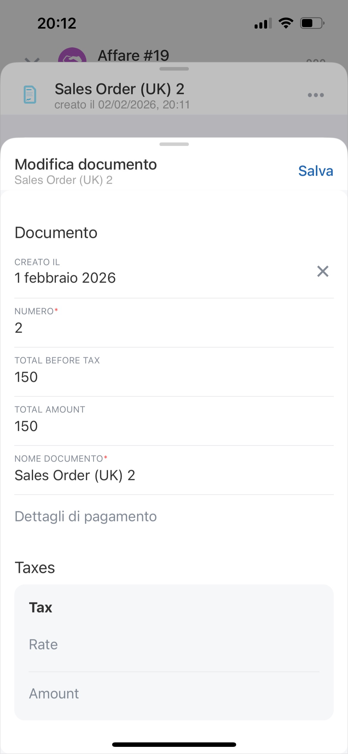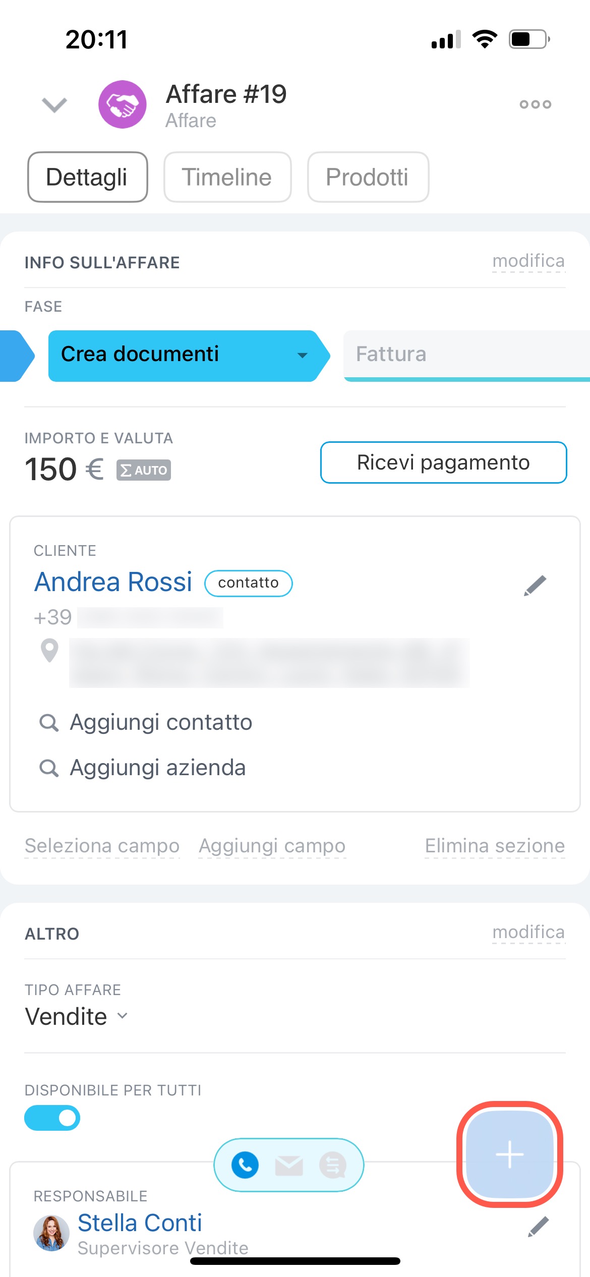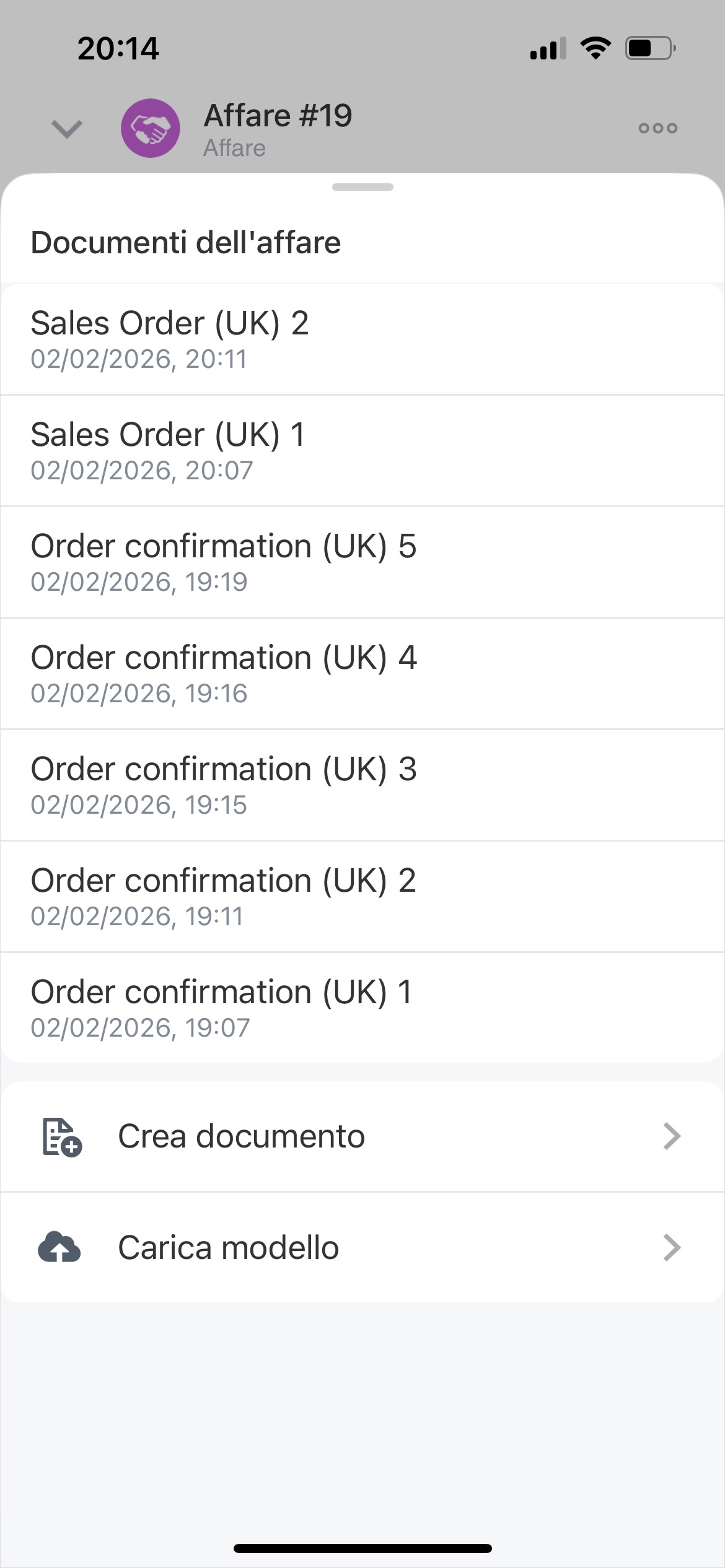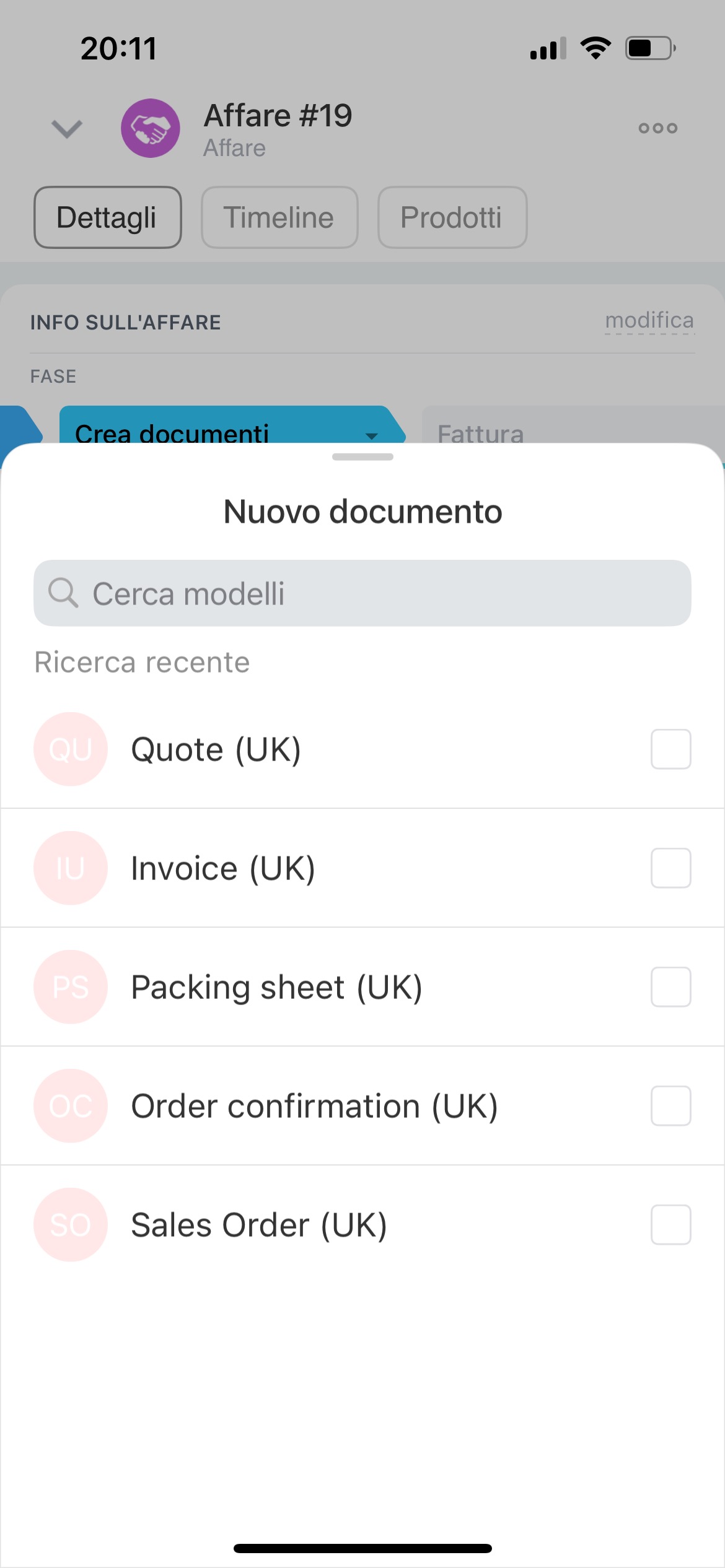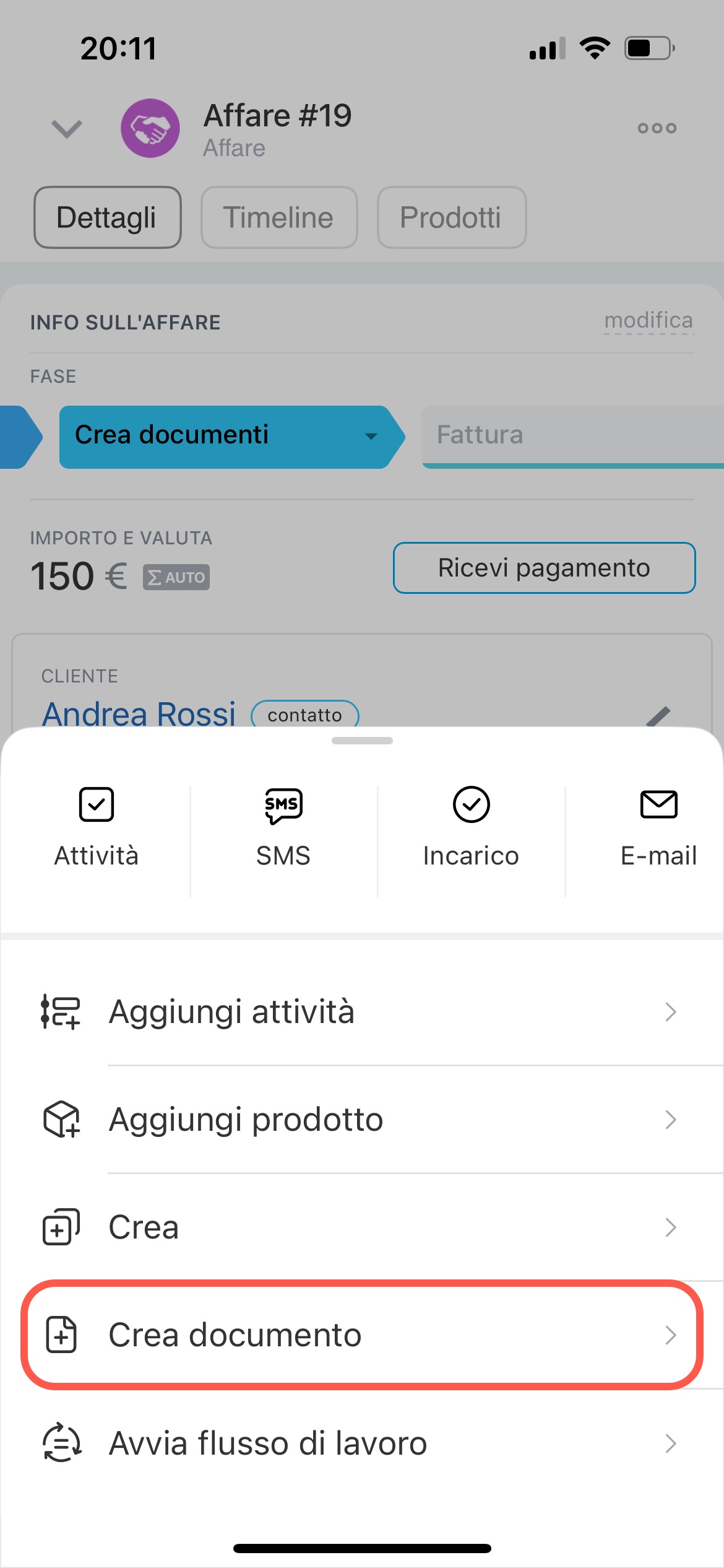 Nella scheda dell’affare, dell’azienda o di un altro elemento, tocca Più (+) in basso a destra e seleziona Crea documento.