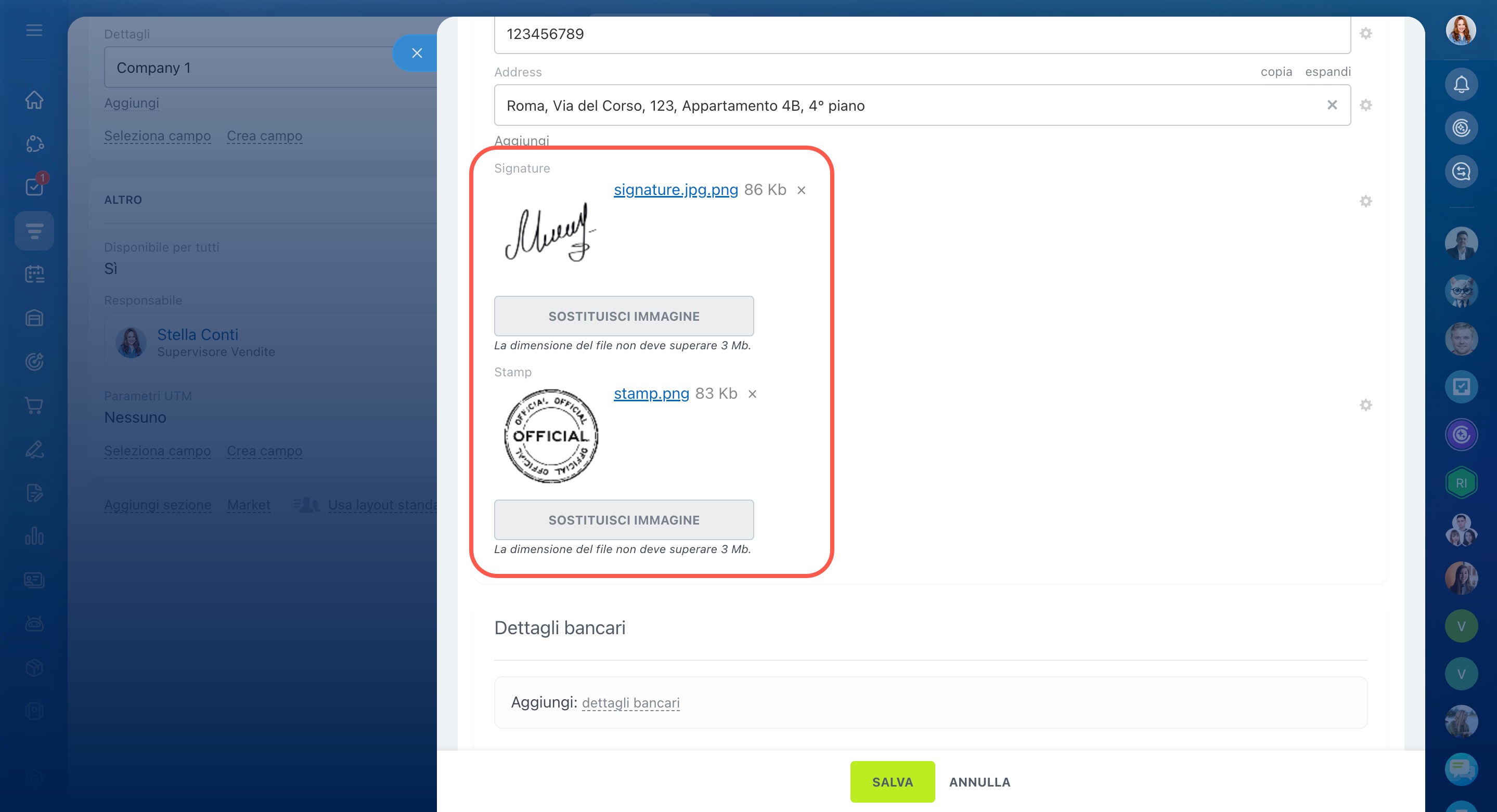 Per inserire automaticamente firma e timbro in un modello di documento, carica le immagini nei dettagli aziendali e nella scheda aziendale. Nei modelli di documento possono essere utilizzati codici di campo diversi, provenienti sia dai dettagli aziendali sia dalla scheda aziendale.