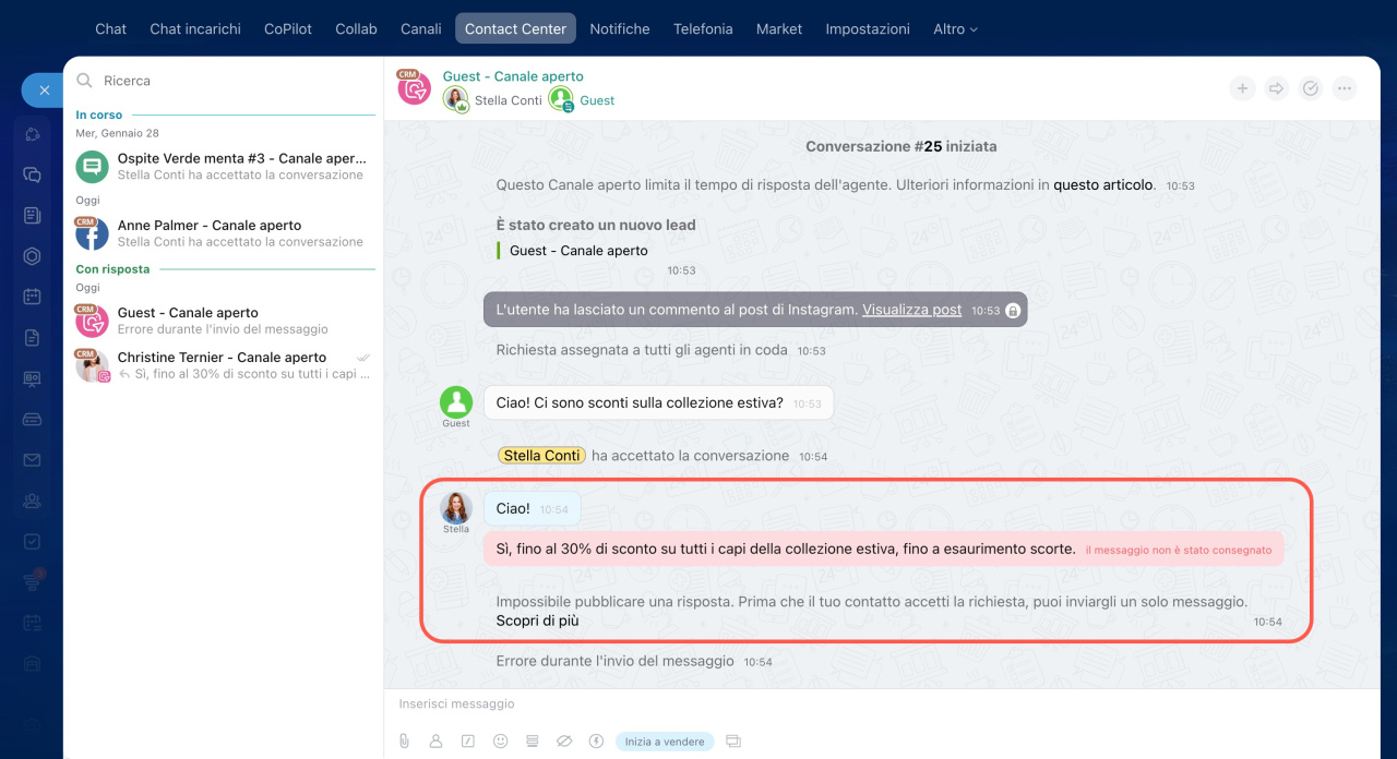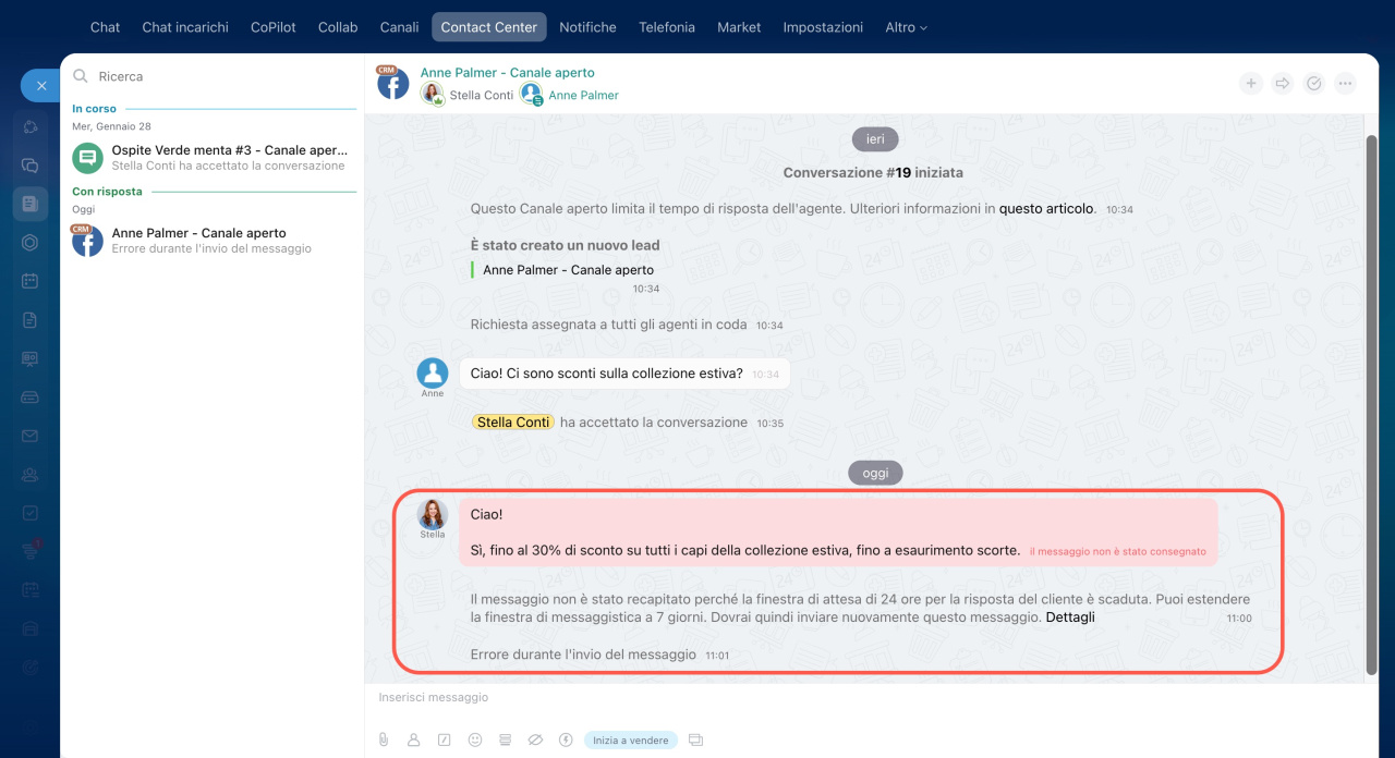 Trascorse le 24 ore, i tuoi messaggi non verranno più consegnati al cliente e in Bitrix24 comparirà la notifica Il messaggio non è stato consegnato. La conversazione riprenderà solo quando il cliente scriverà di nuovo, facendo ripartire il conteggio delle 24 ore. Per evitare di perdere contatti, puoi configurare risposte automatiche per avvisare il cliente in caso di ritardo.