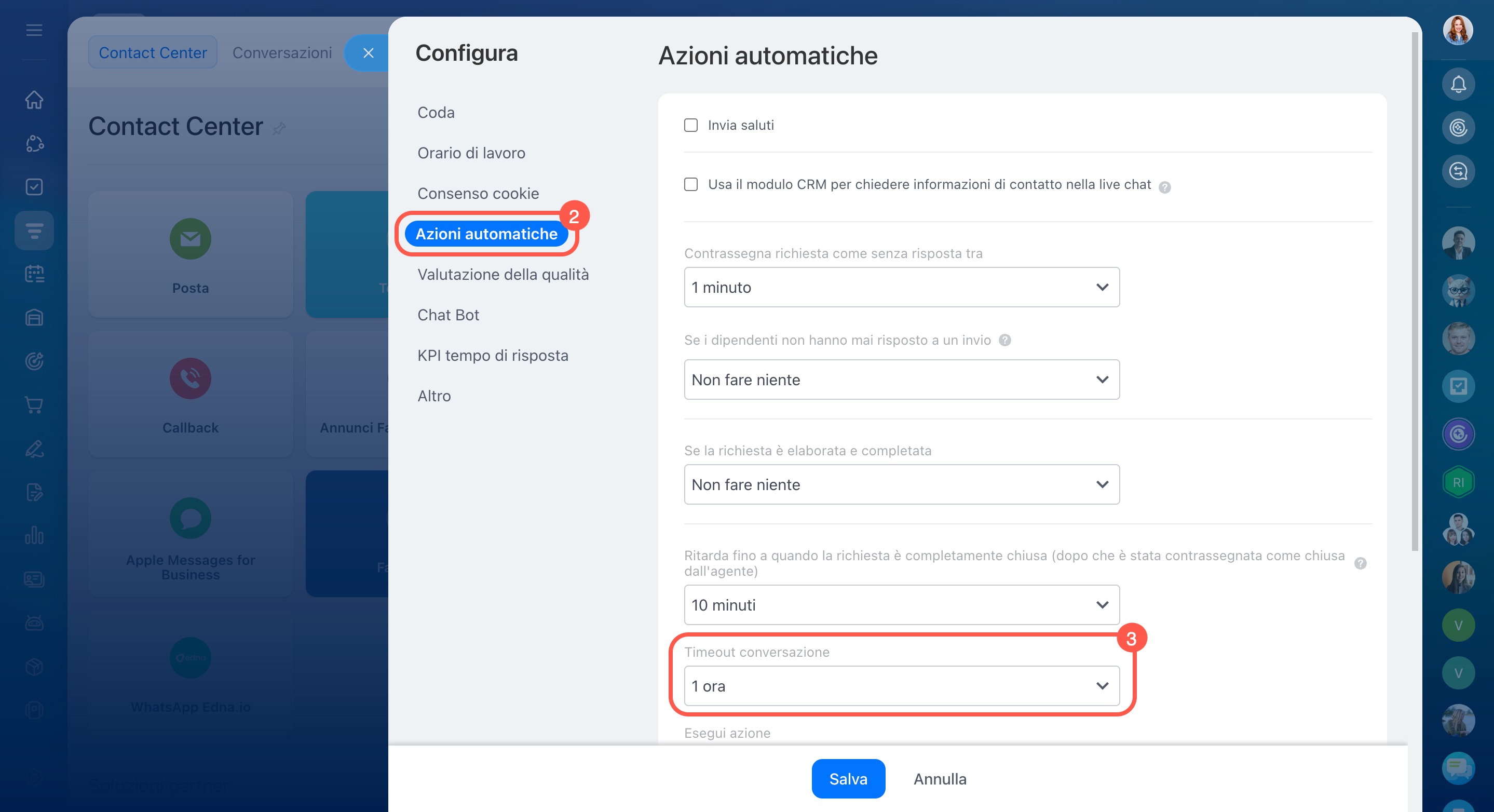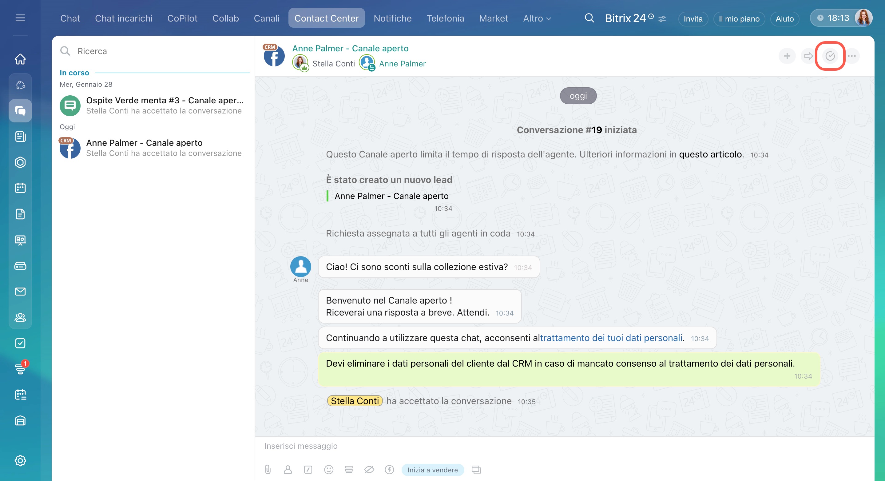 Questa opzione è attiva per impostazione predefinita, ma l’amministratore e i dipendenti con i diritti di gestione dei canali aperti possono modificarne la durata. In questo modo è possibile chiudere rapidamente le conversazioni inattive e assegnare senza ritardi le nuove richieste ai dipendenti.