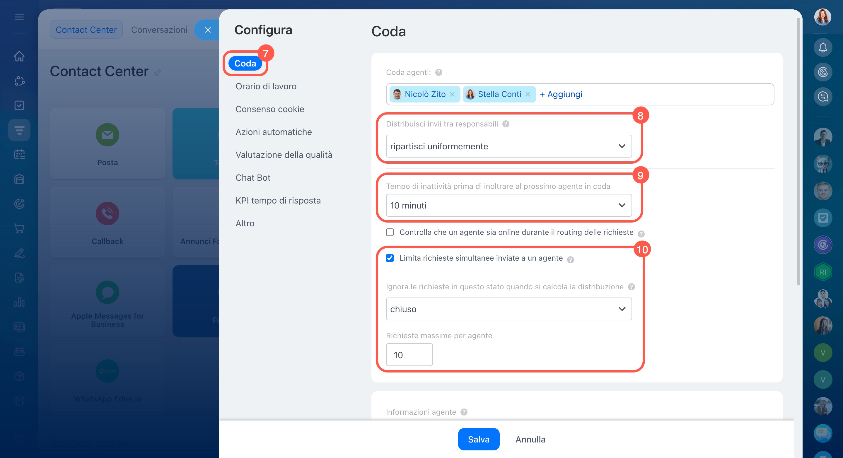 - Nella scheda Coda agenti, scegli il metodo di distribuzione delle richieste in entrata: