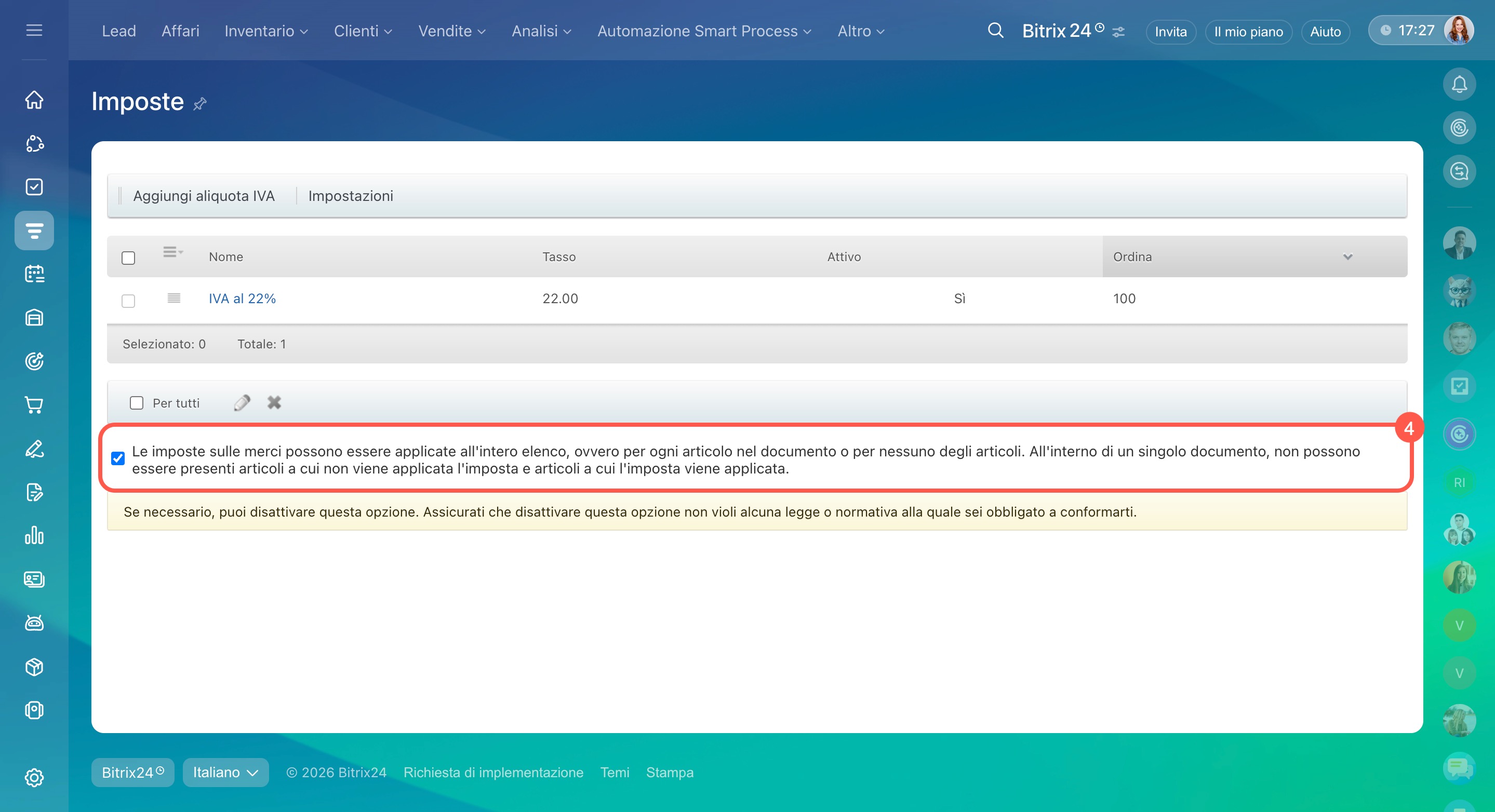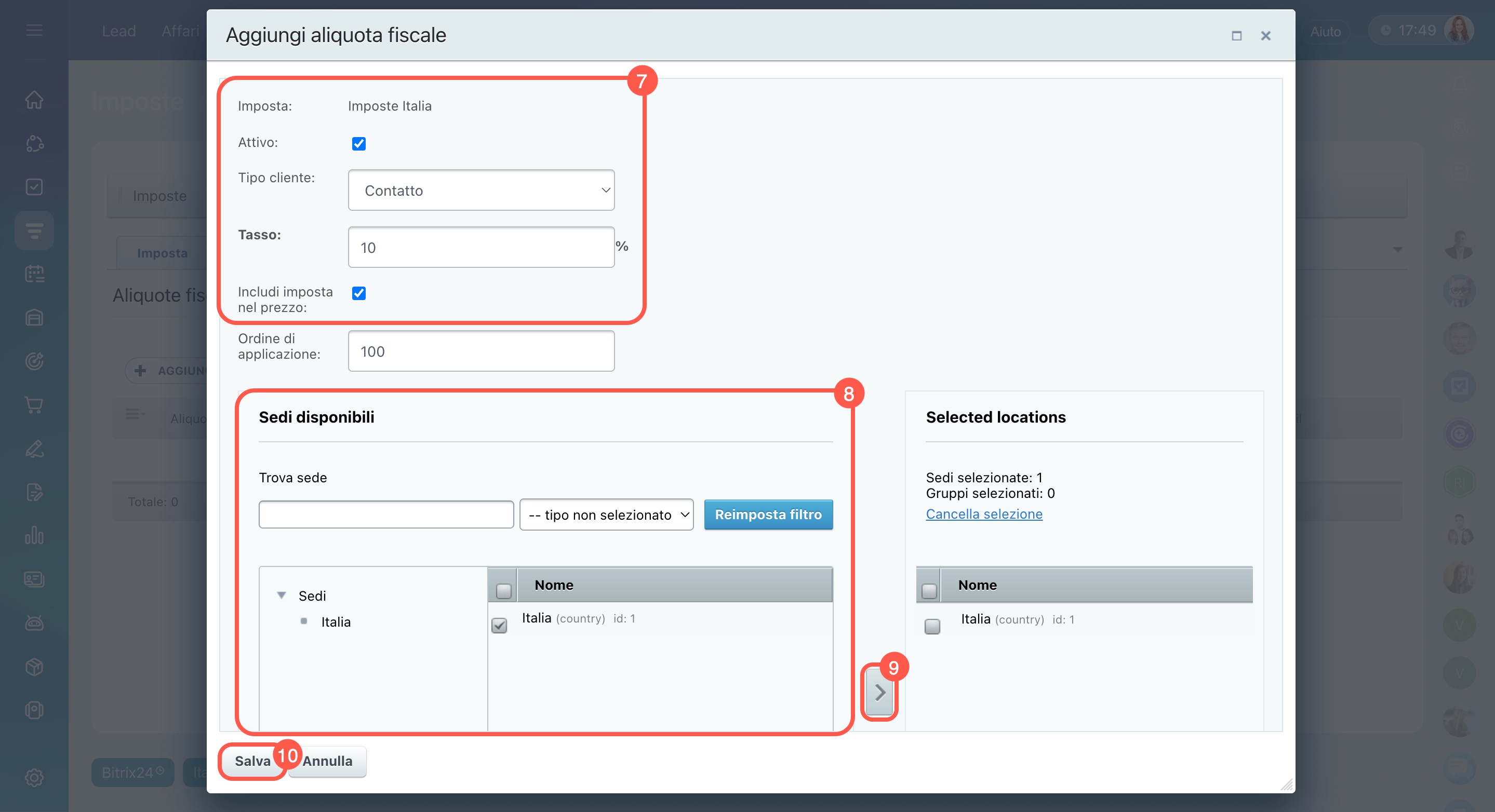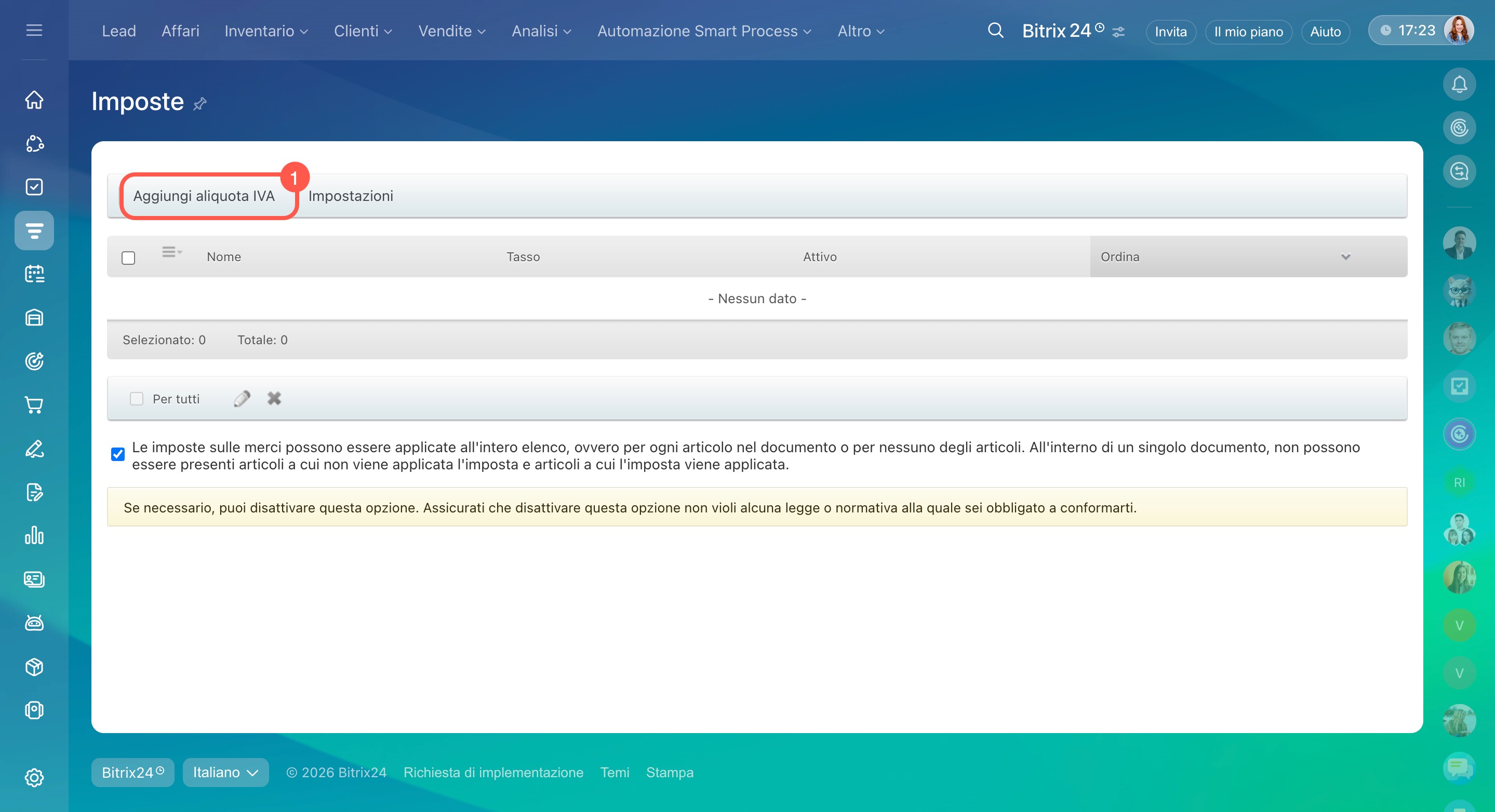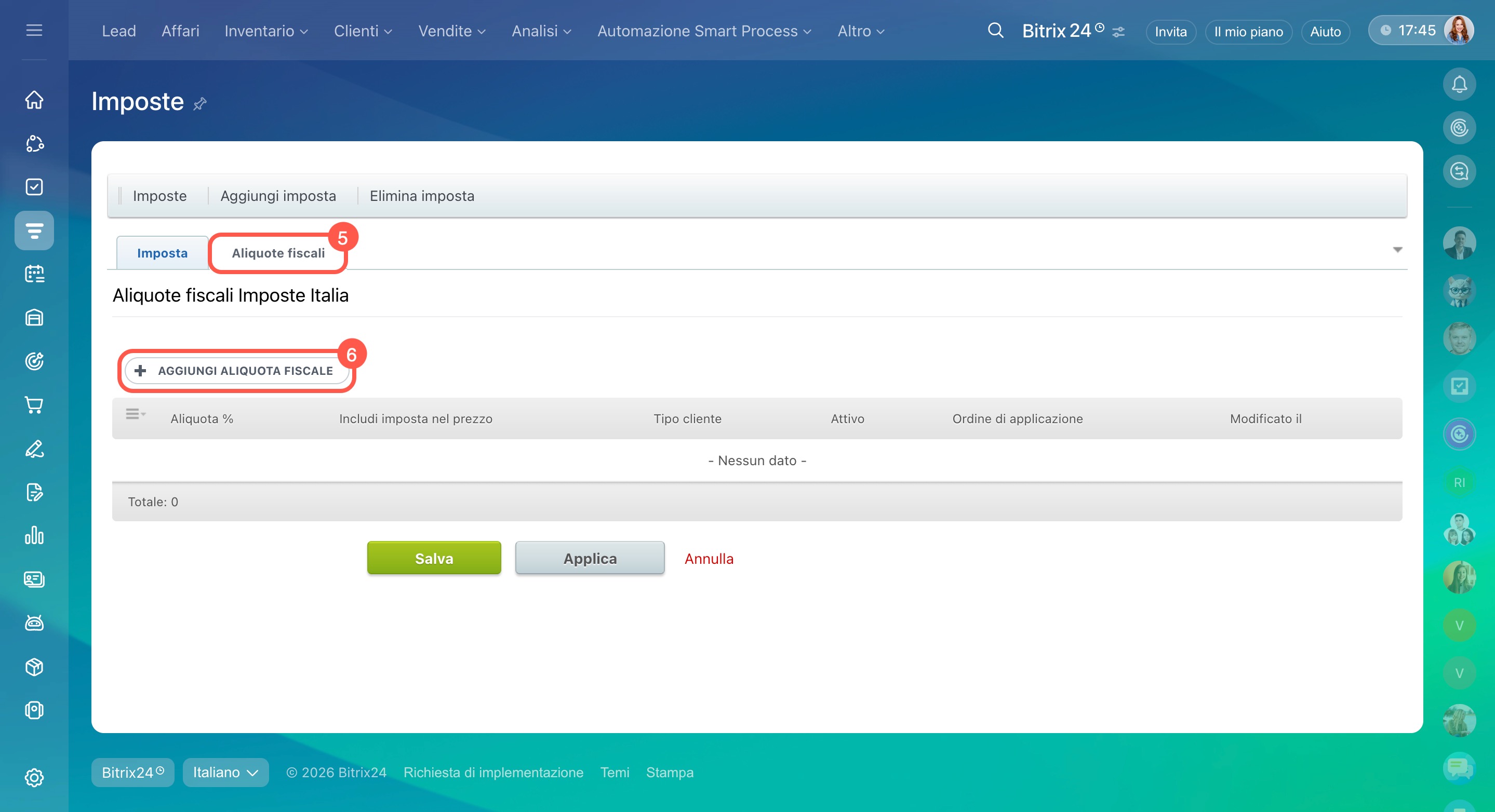 - Solo l’amministratore di Bitrix24 e i dipendenti con l’autorizzazione di modificare le impostazioni CRM possono aggiungere o modificare le aliquote fiscali.