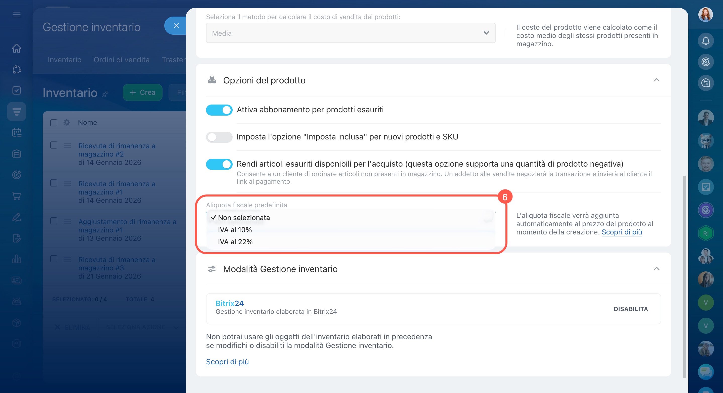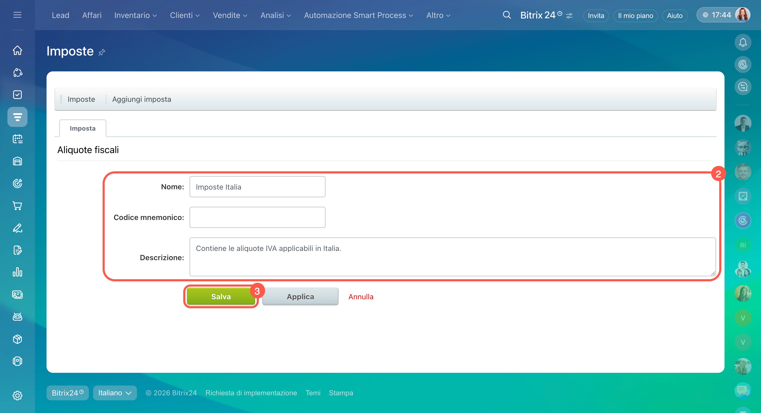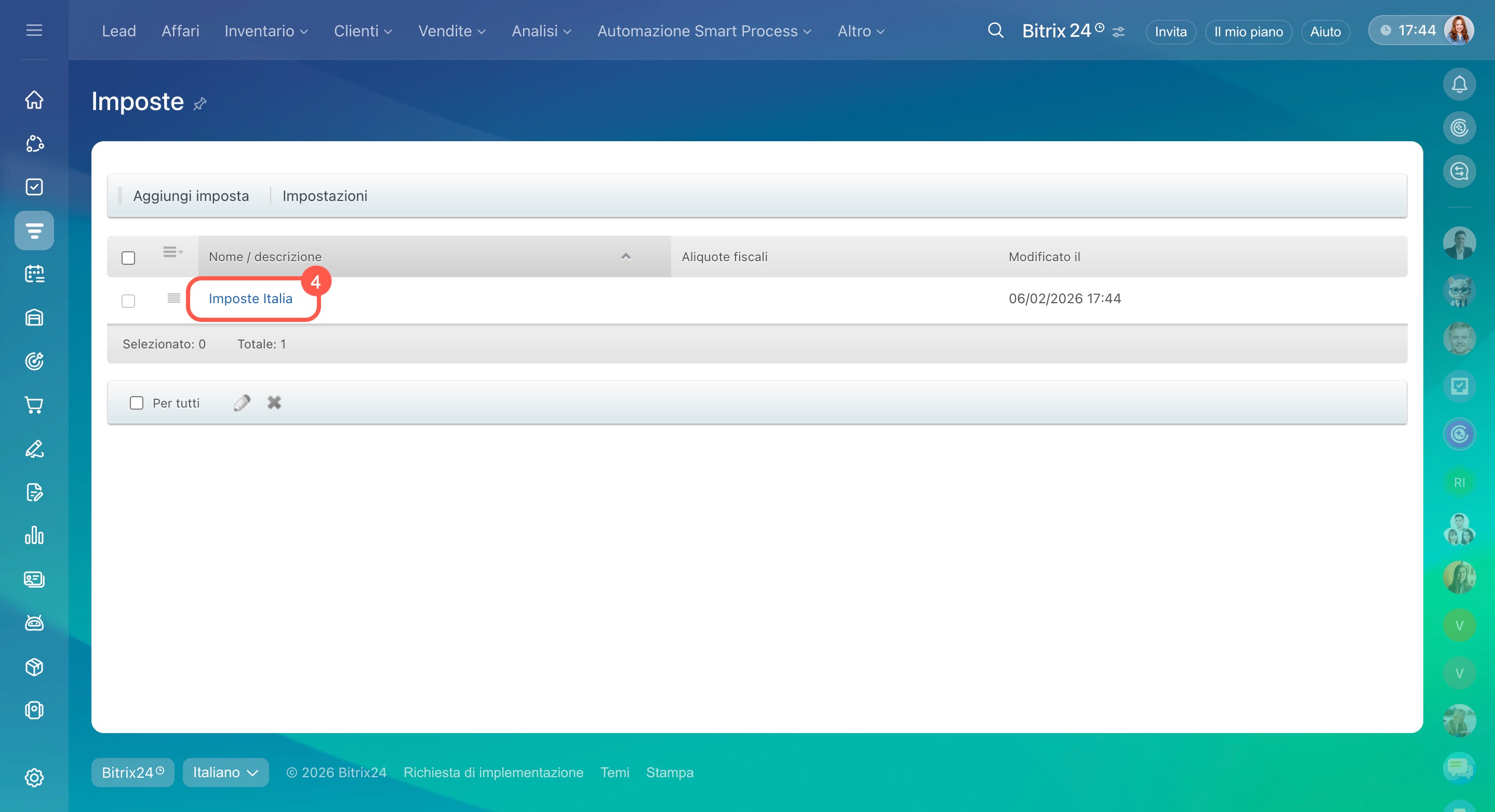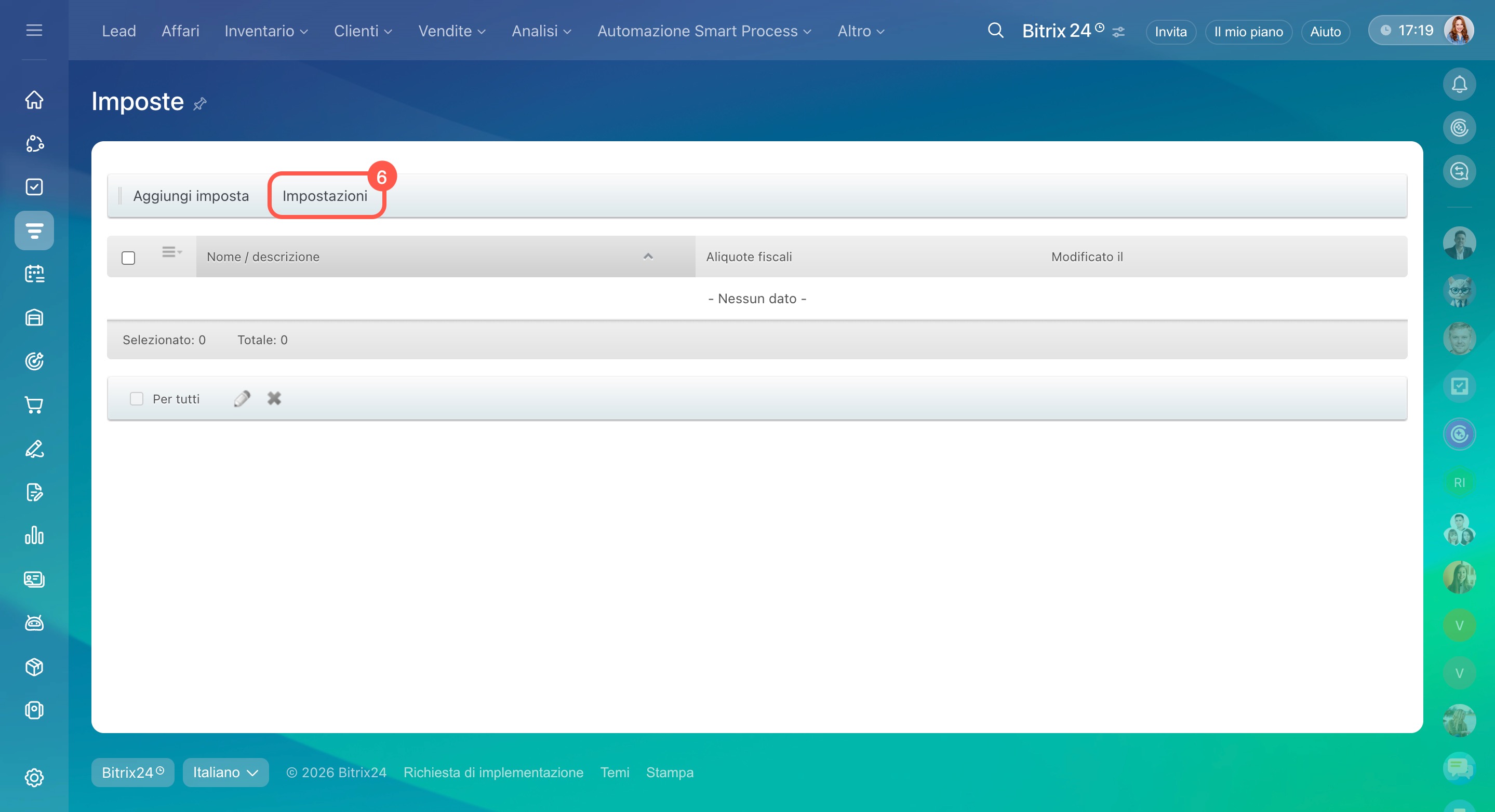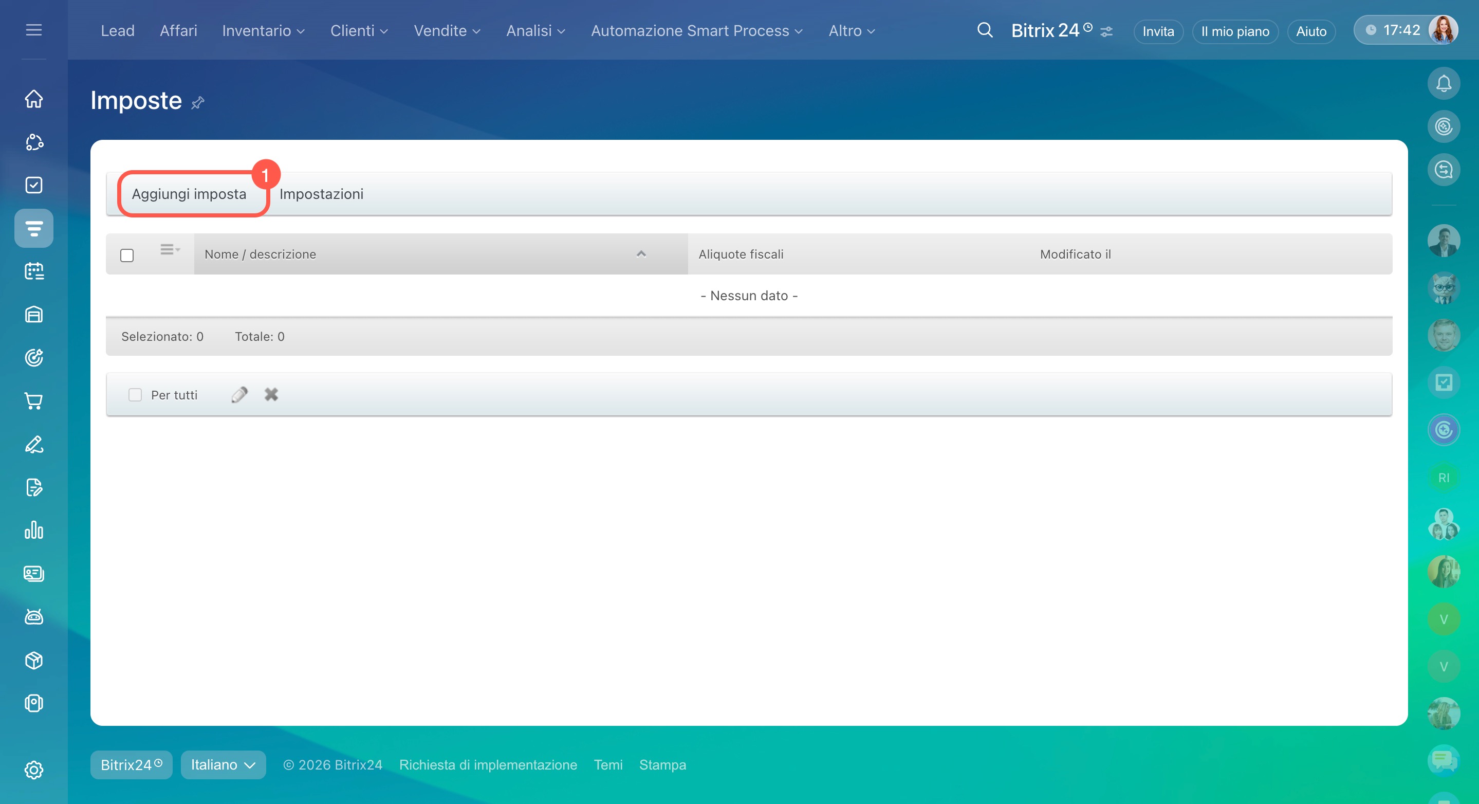 - Solo l’amministratore di Bitrix24 e i dipendenti con l’autorizzazione di modificare le impostazioni CRM possono aggiungere o modificare le aliquote fiscali.