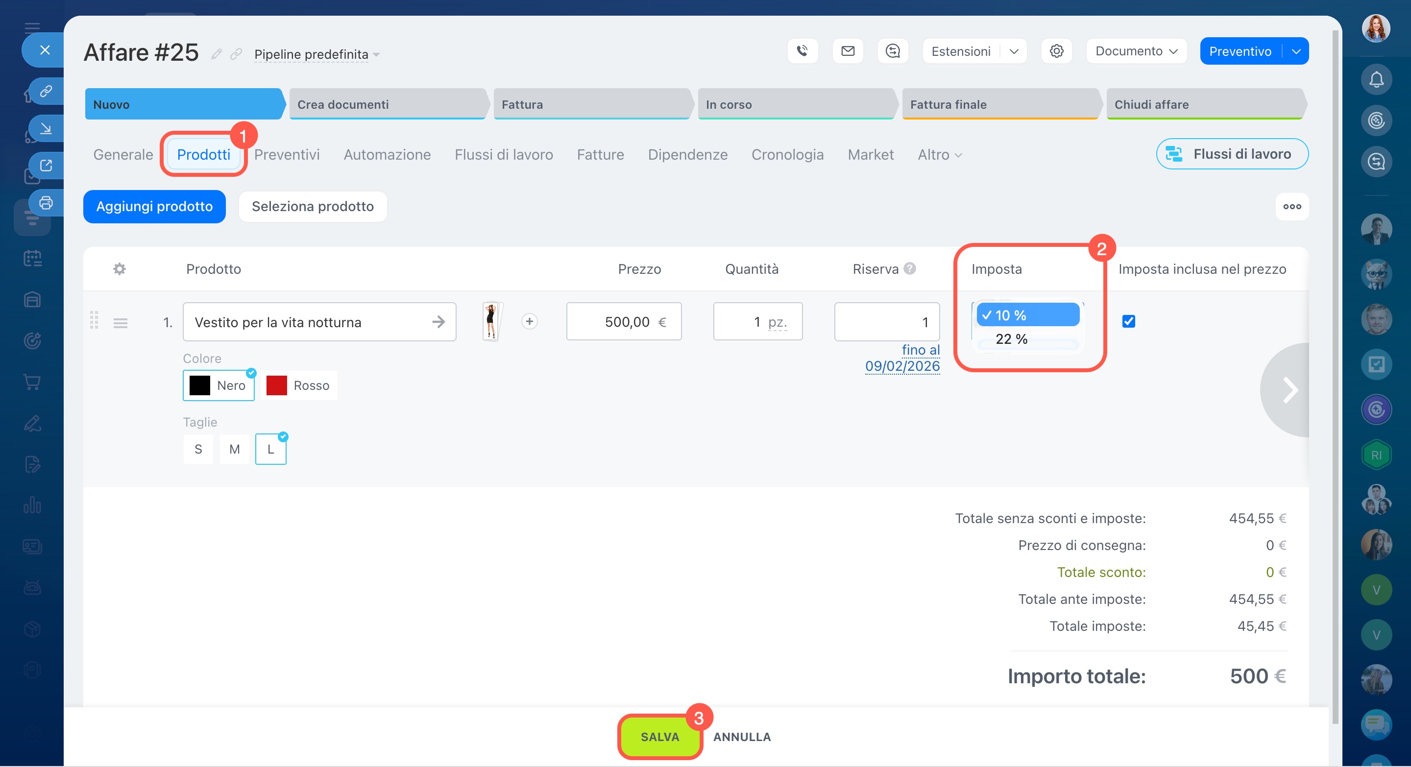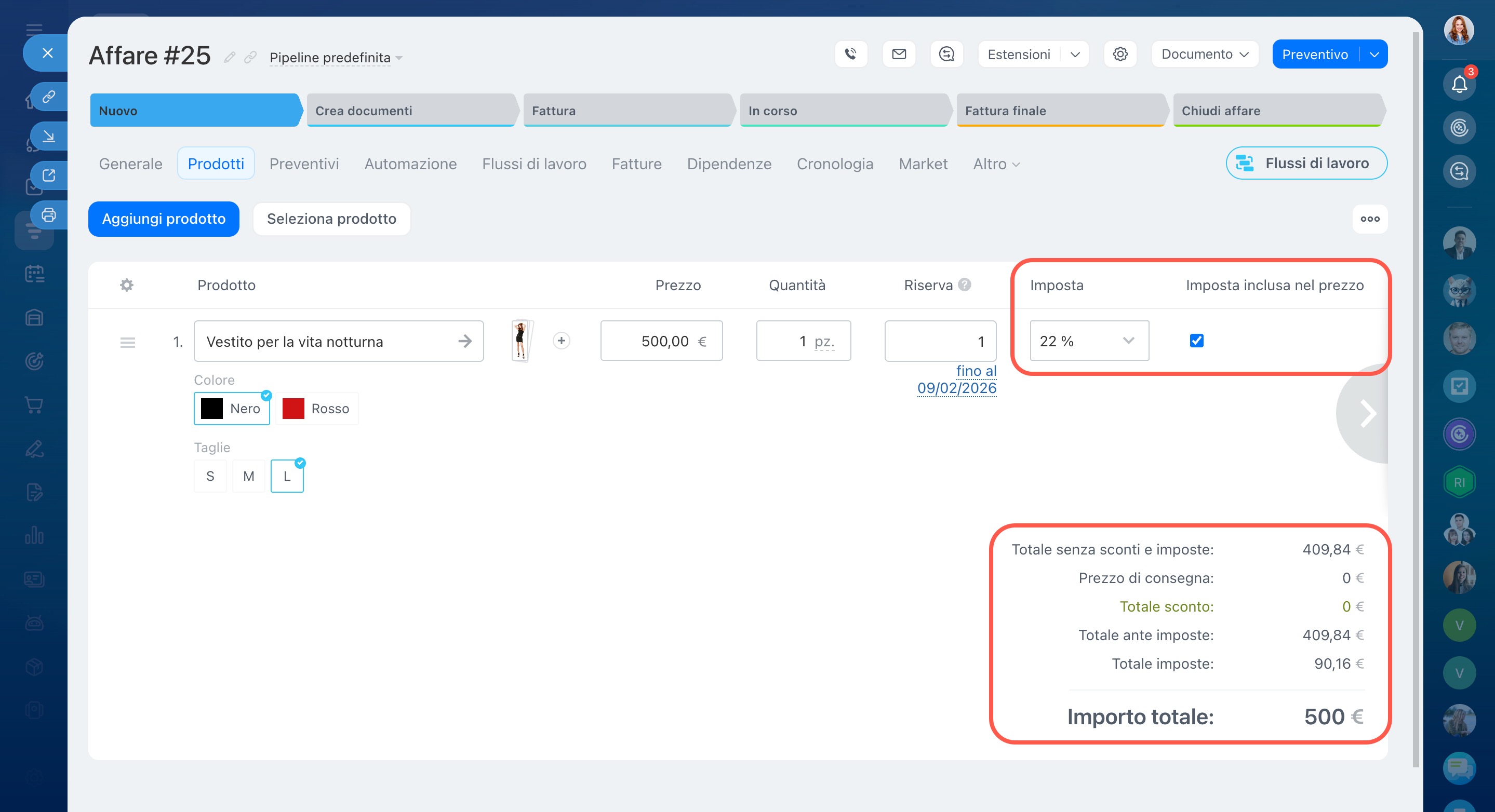 Nella scheda dell’affare. Nell’affare viene mostrata l’aliquota IVA predefinita oppure quella impostata nella scheda del singolo prodotto. Se necessario, puoi modificarla manualmente.