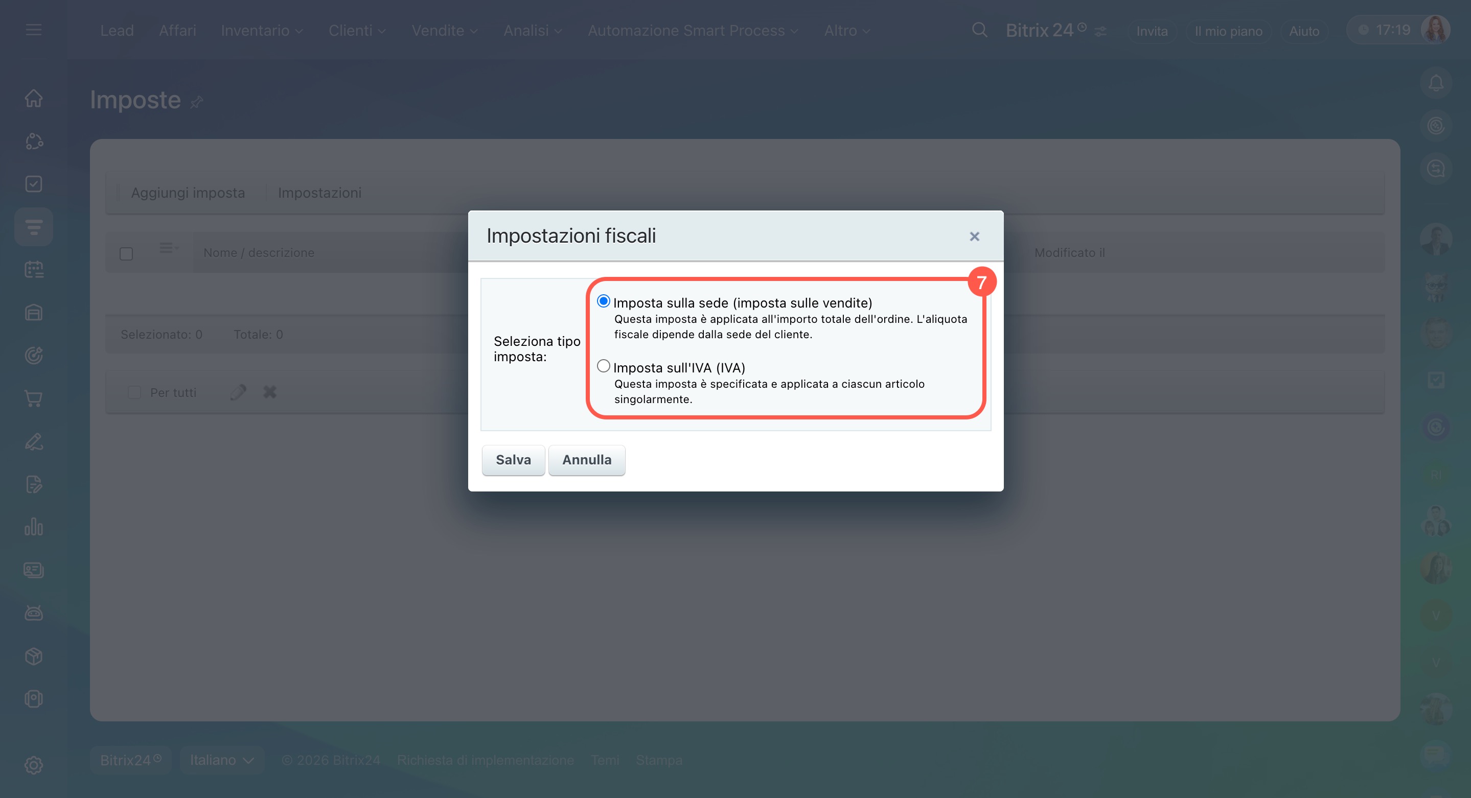 Vai su CRM > Altro > Impostazioni > Impostazioni CRM > Imposte. Fai clic su Impostazioni e scegli il tipo di imposta da utilizzare: