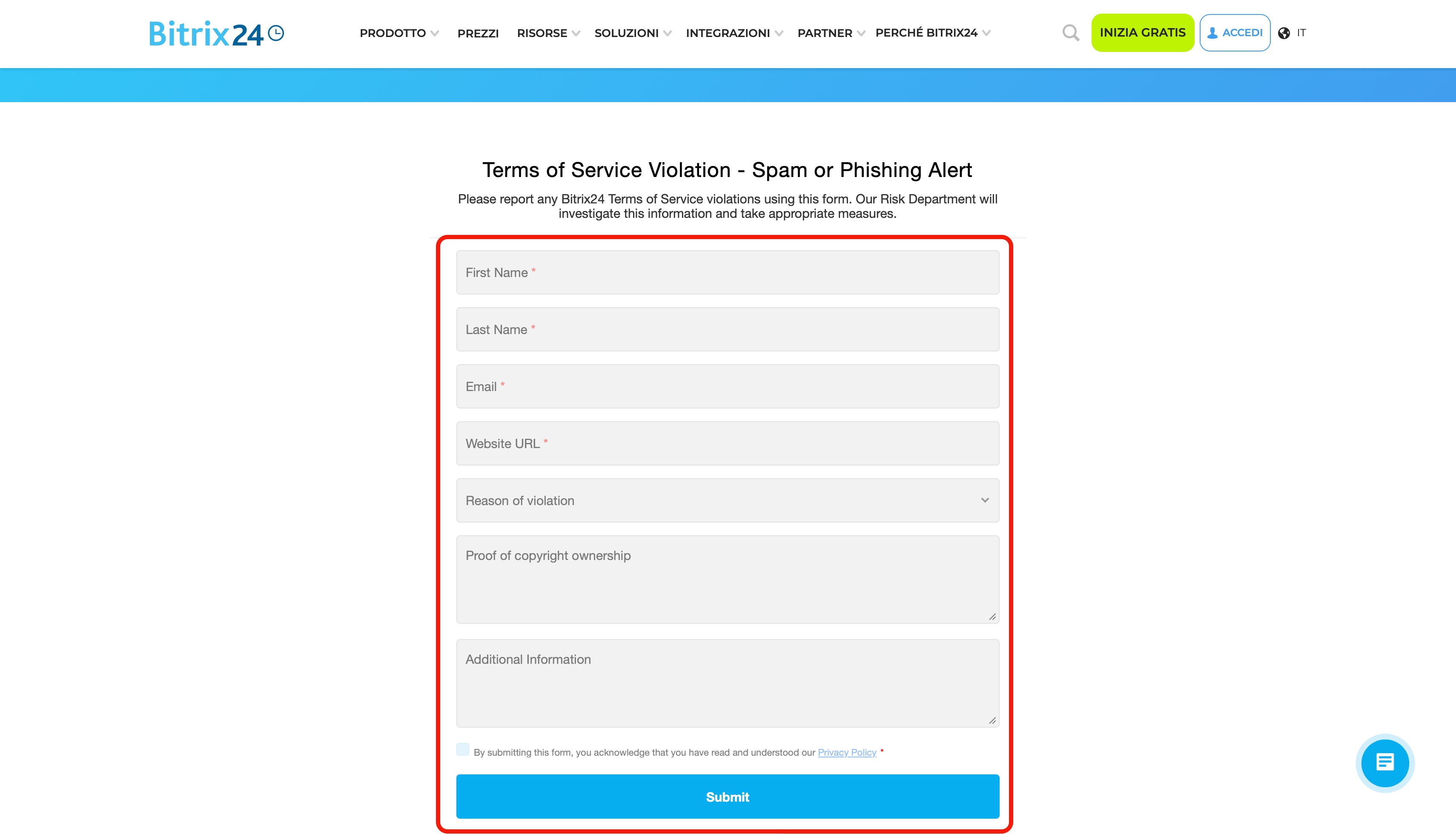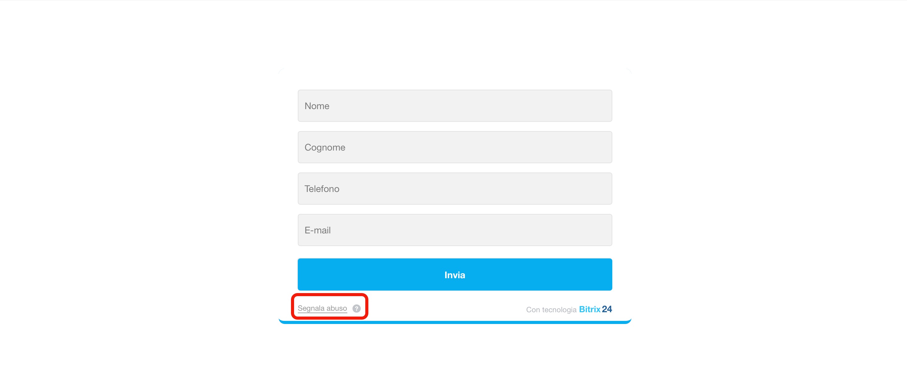 Per inviare una segnalazione, clicca su Segnala abuso nel modulo CRM, compila e invia il reclamo sul sito di Bitrix24.