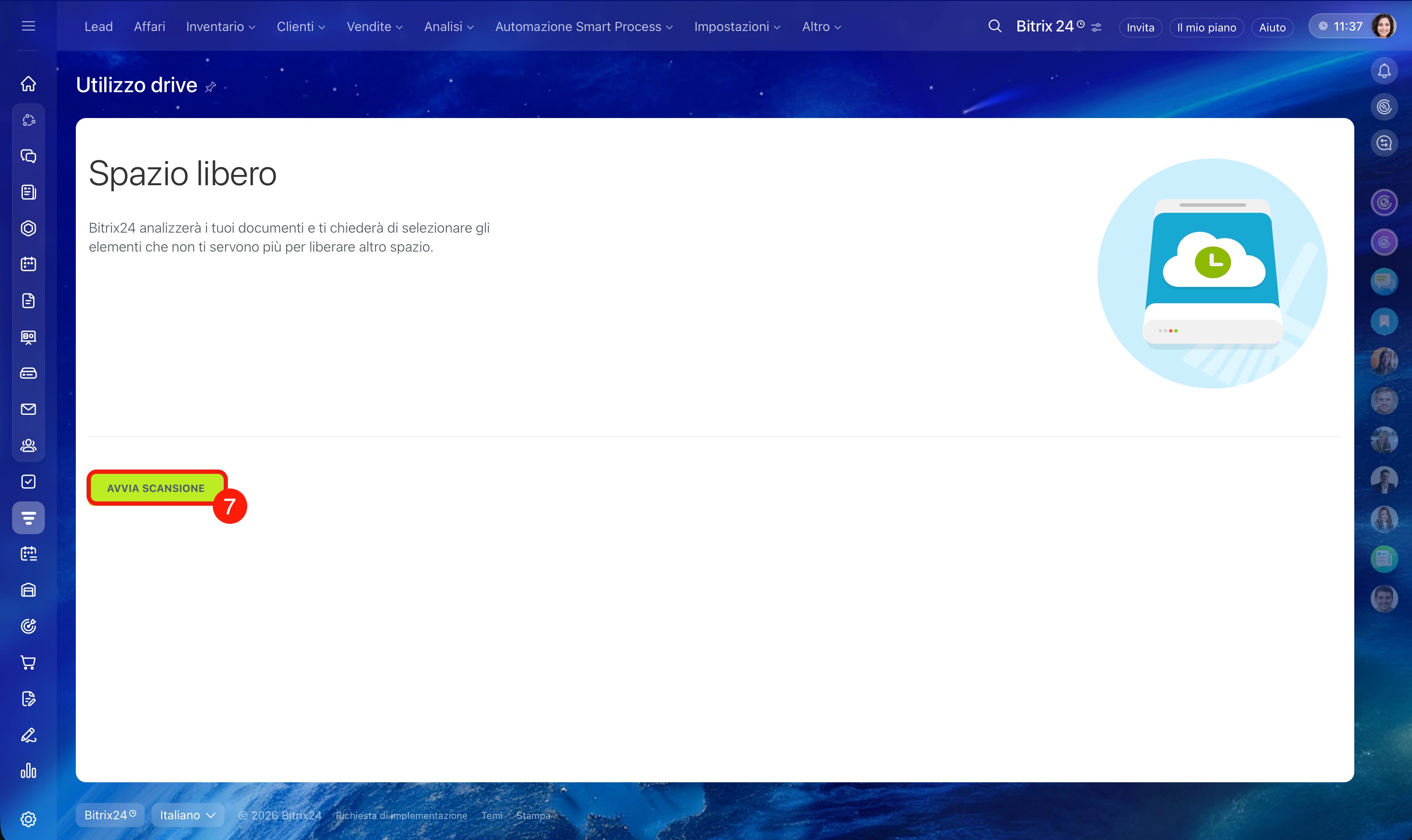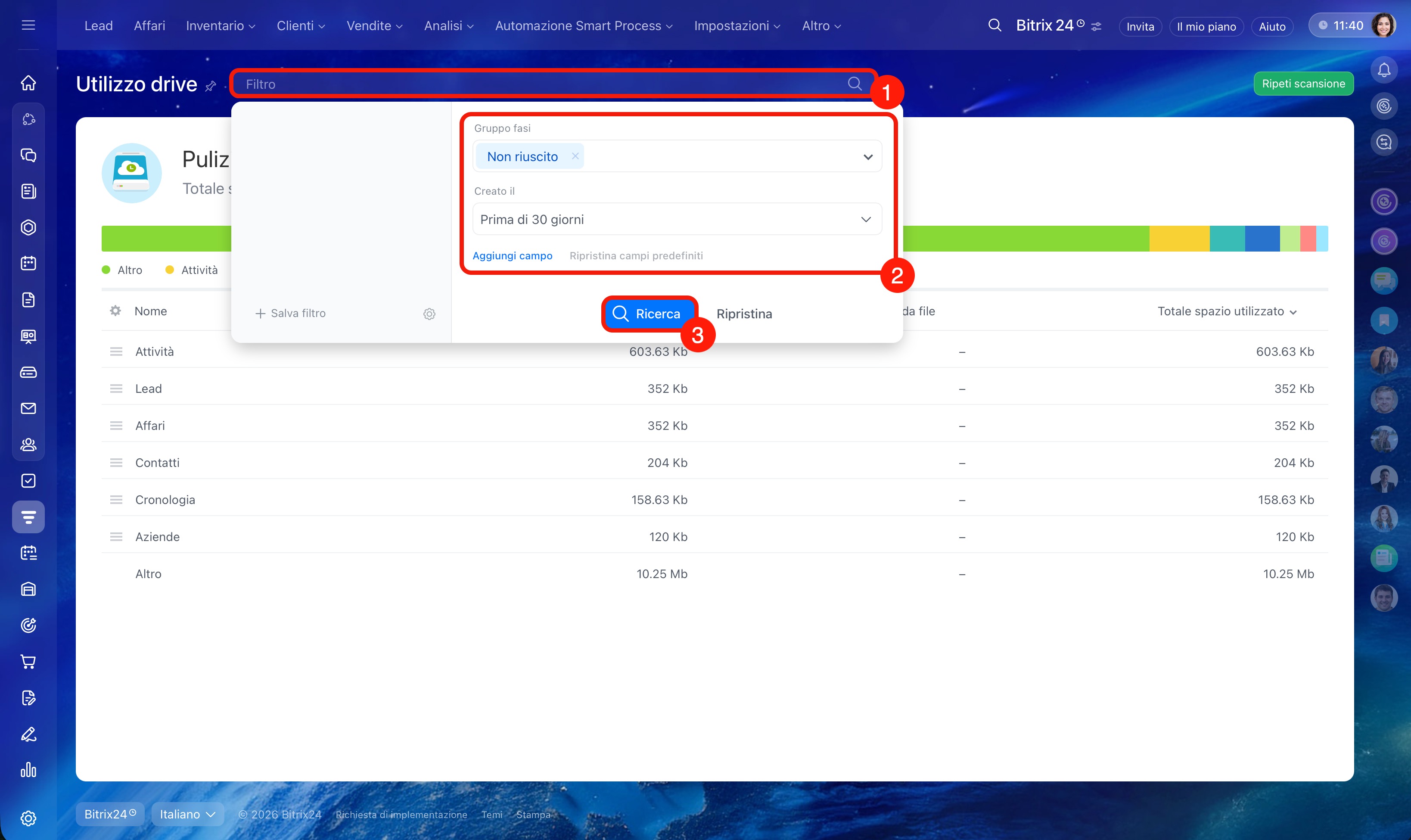 Quando lo spazio in Bitrix24 si esaurisce, non è possibile creare nuovi lead, affari, contatti e altri elementi. Lo strumento Pulizia CRM aiuta a capire rapidamente cosa occupa spazio e a eliminare i dati superflui, come vecchi affari o lead.