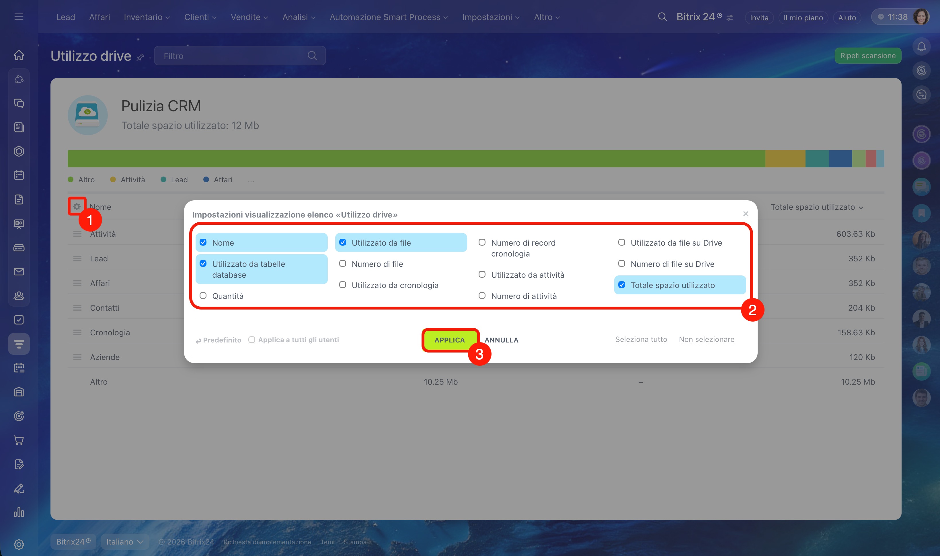 Puoi scegliere quali colonne mostrare nella tabella. Questo aiuta a identificare con maggiore precisione quali sezioni occupano più spazio e a decidere cosa eliminare per primo. Ad esempio, affari con documenti o lead con attività ed email.
