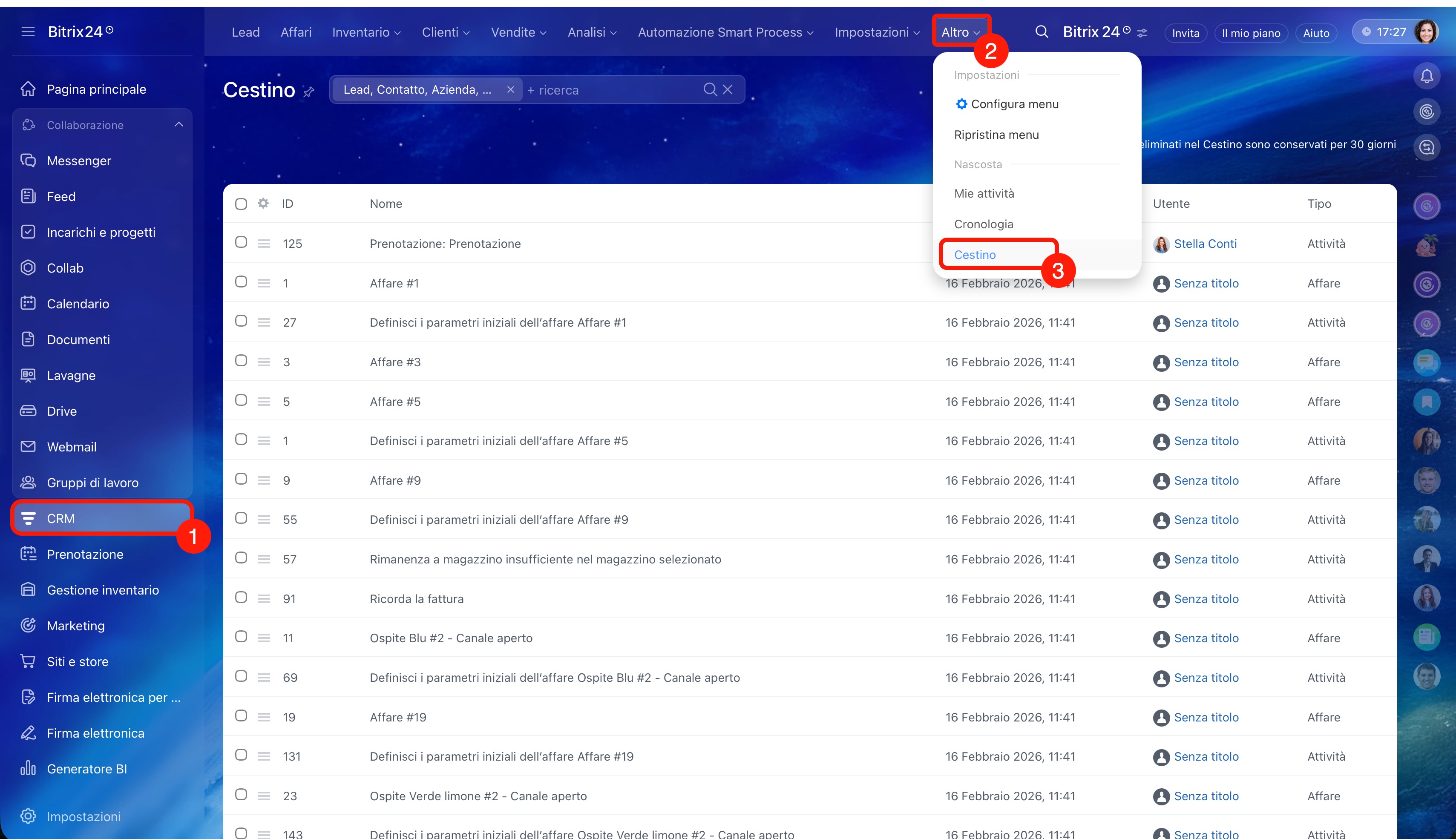 Elementi CRM. Se hai eliminato affari, contatti, aziende o lead, vai alla sezione CRM > Altro > Cestino.
