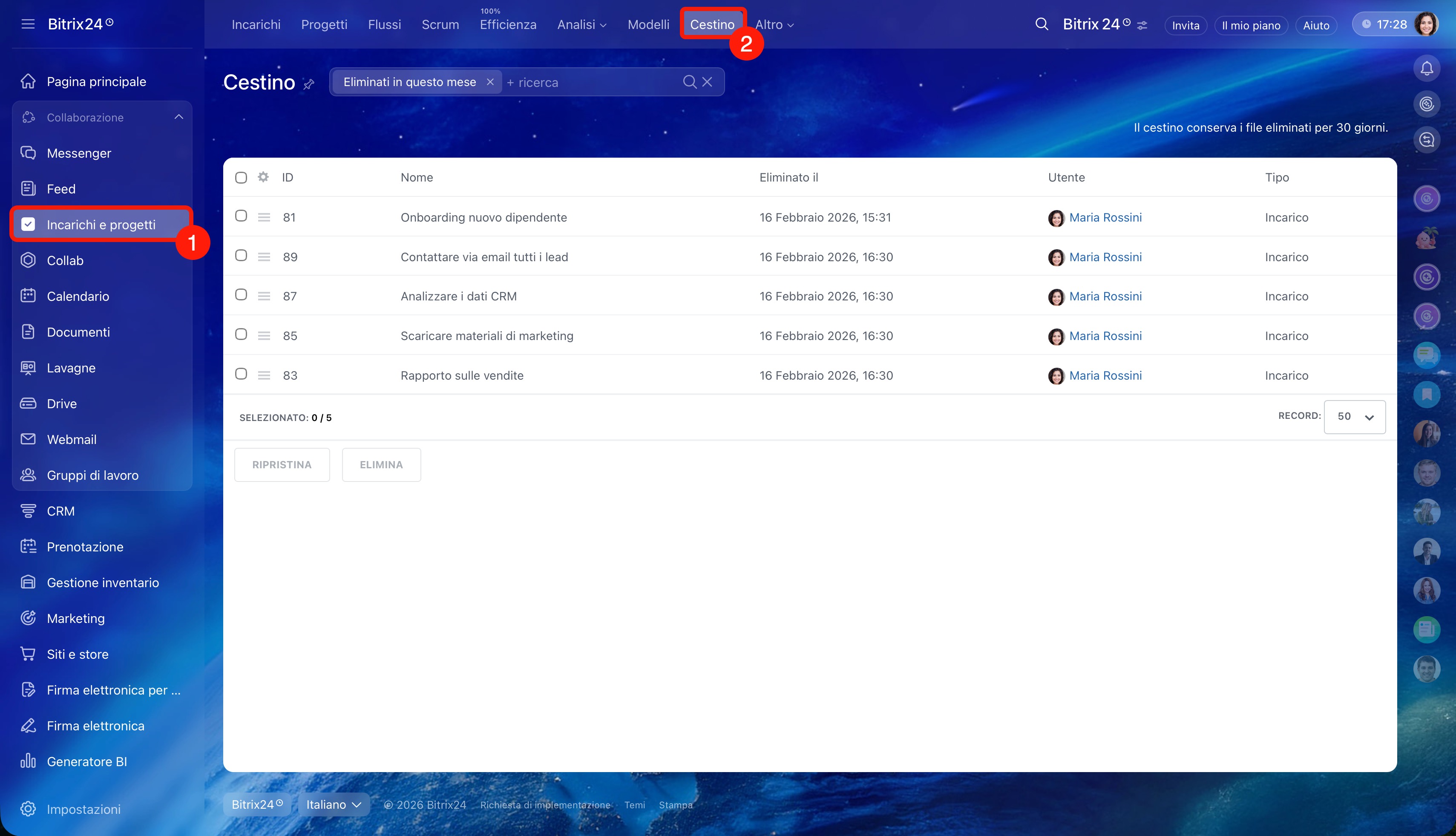 Se hai eliminato accidentalmente dati importanti, come smart process, affari o incarichi, è possibile recuperarli da un backup. Bitrix24 crea automaticamente backup di tutti i dati ogni giorno e li conserva per sette giorni.