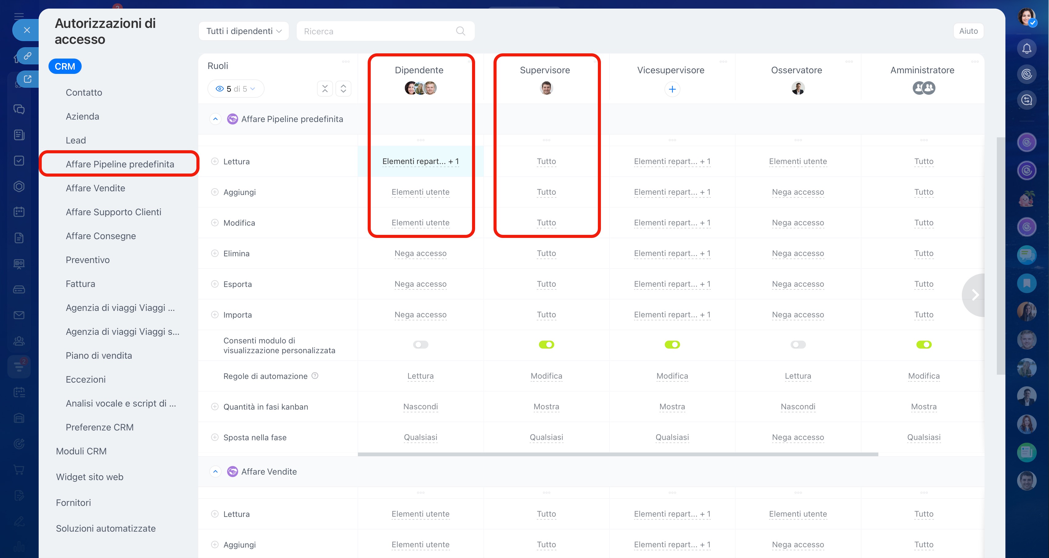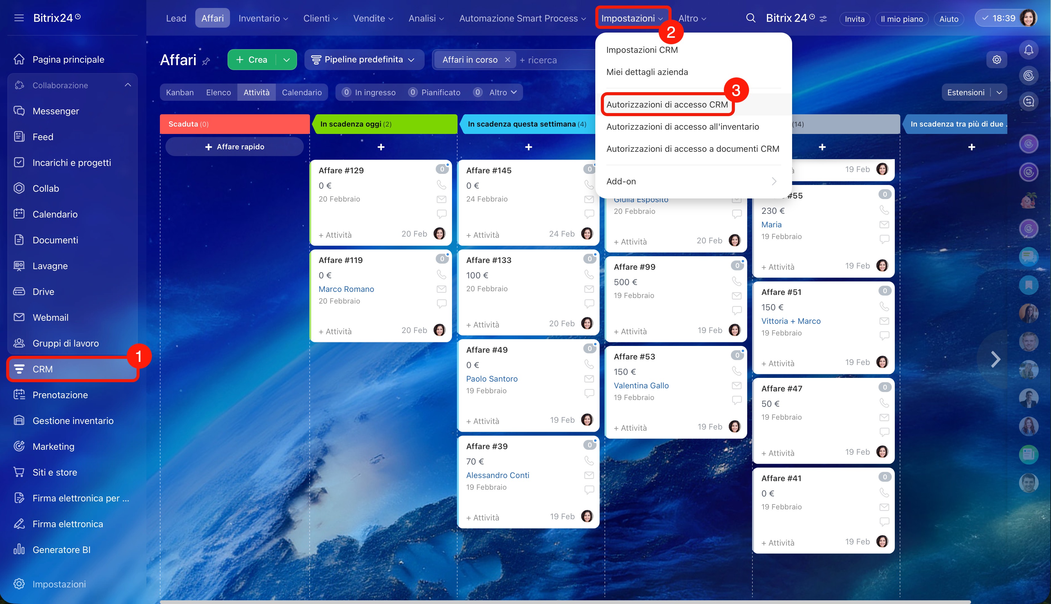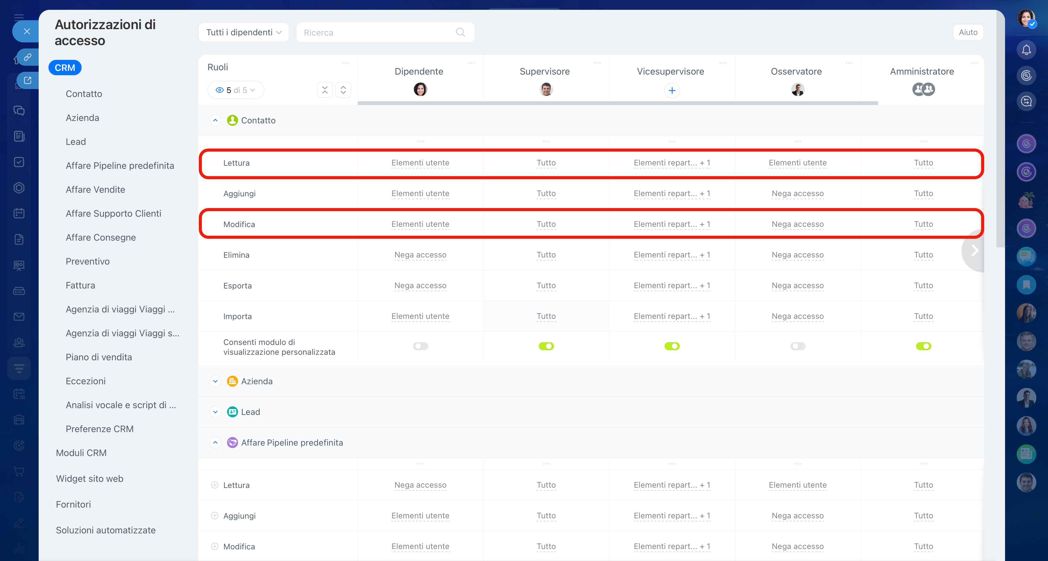 - Per configurare le autorizzazioni di accesso, vai a CRM > Impostazioni > Autorizzazioni di accesso CRM.