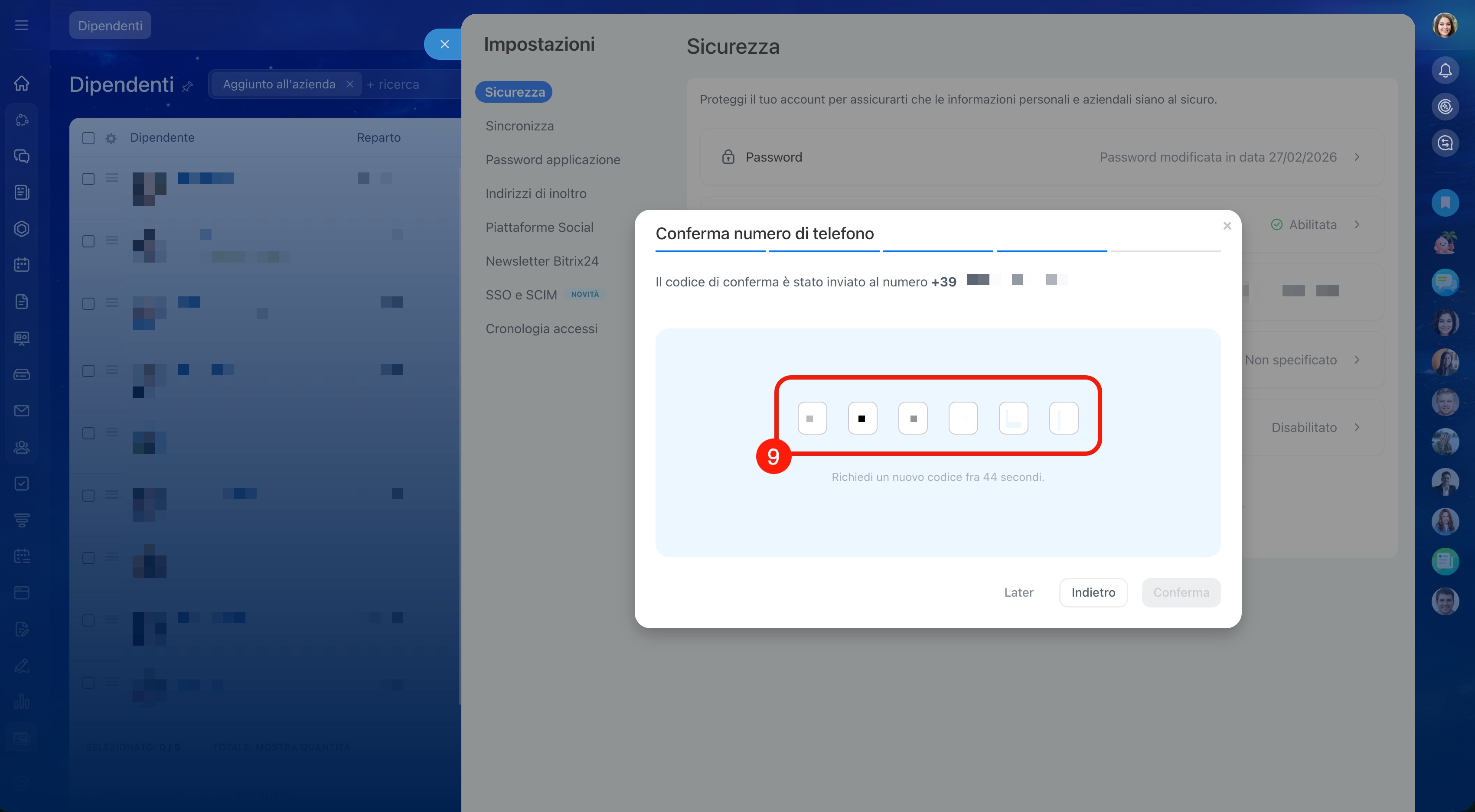 Abbiamo migliorato questo sistema di protezione, rendendolo più semplice e sicuro. In precedenza, la conferma avveniva tramite codici generati da applicazioni specifiche, ora è possibile utilizzare l'app mobile di Bitrix24 o un codice monouso inviato via SMS.