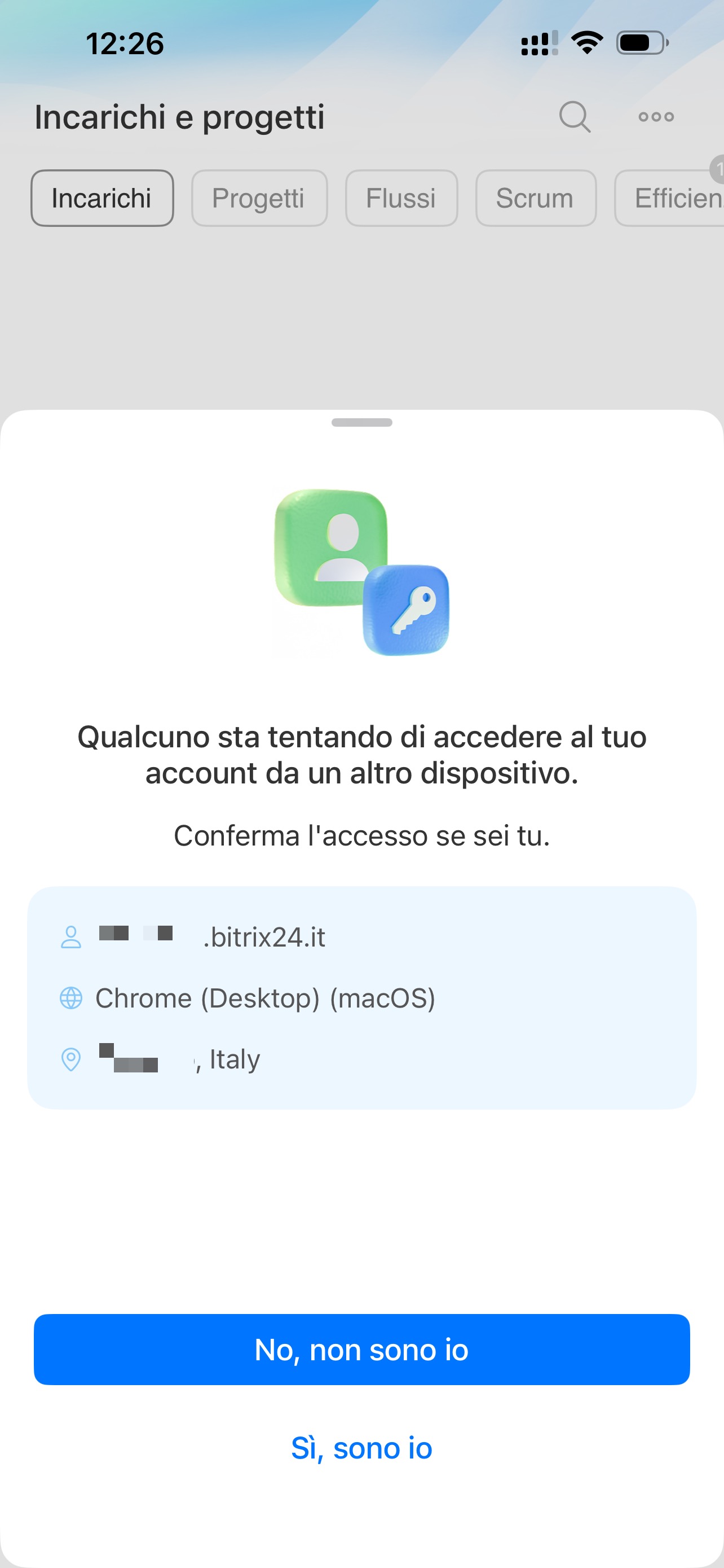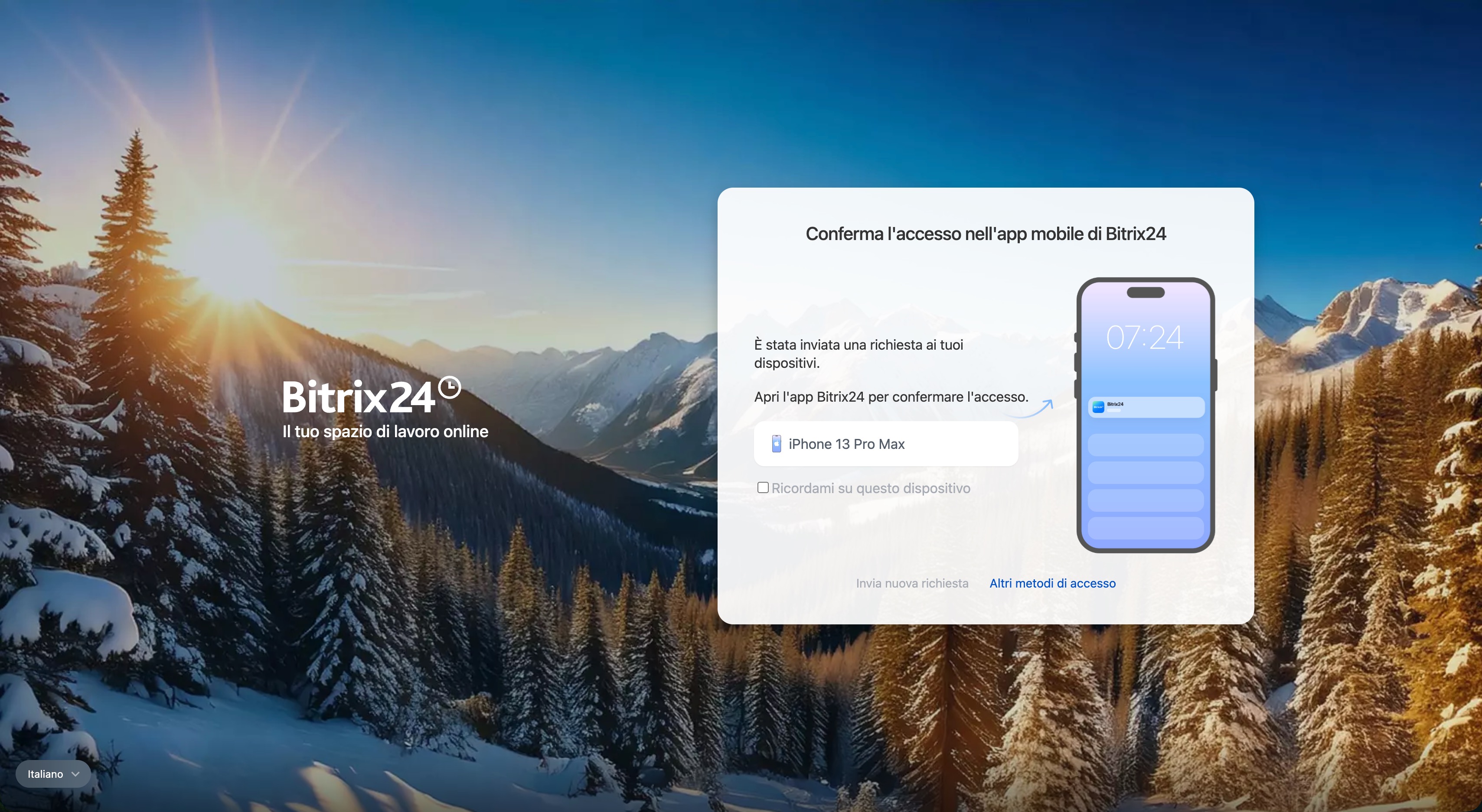 Adesso i tuoi dati sono protetti. Per accedere a Bitrix24, inserisci il login, la password e conferma l'azione nell'app mobile.