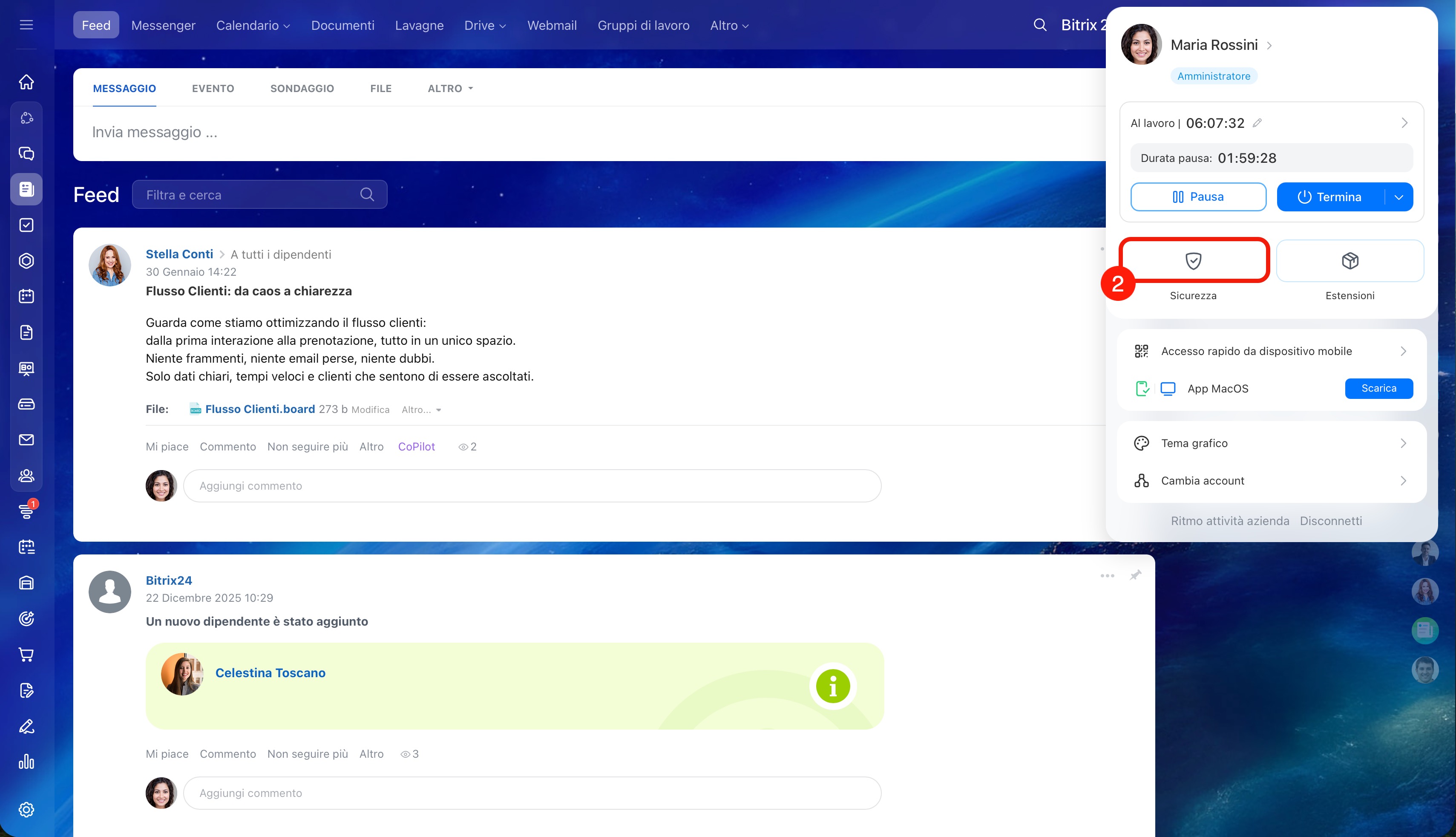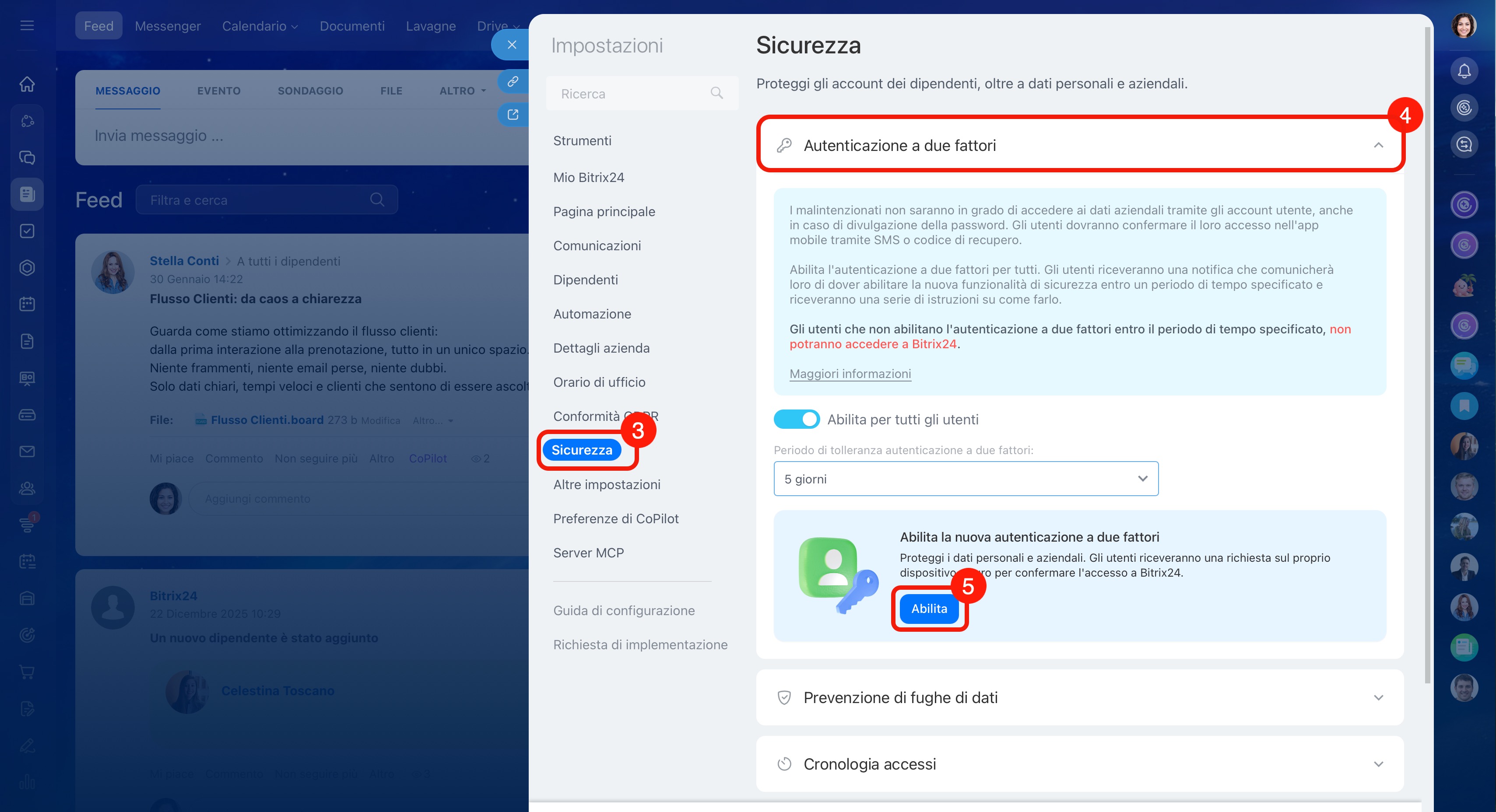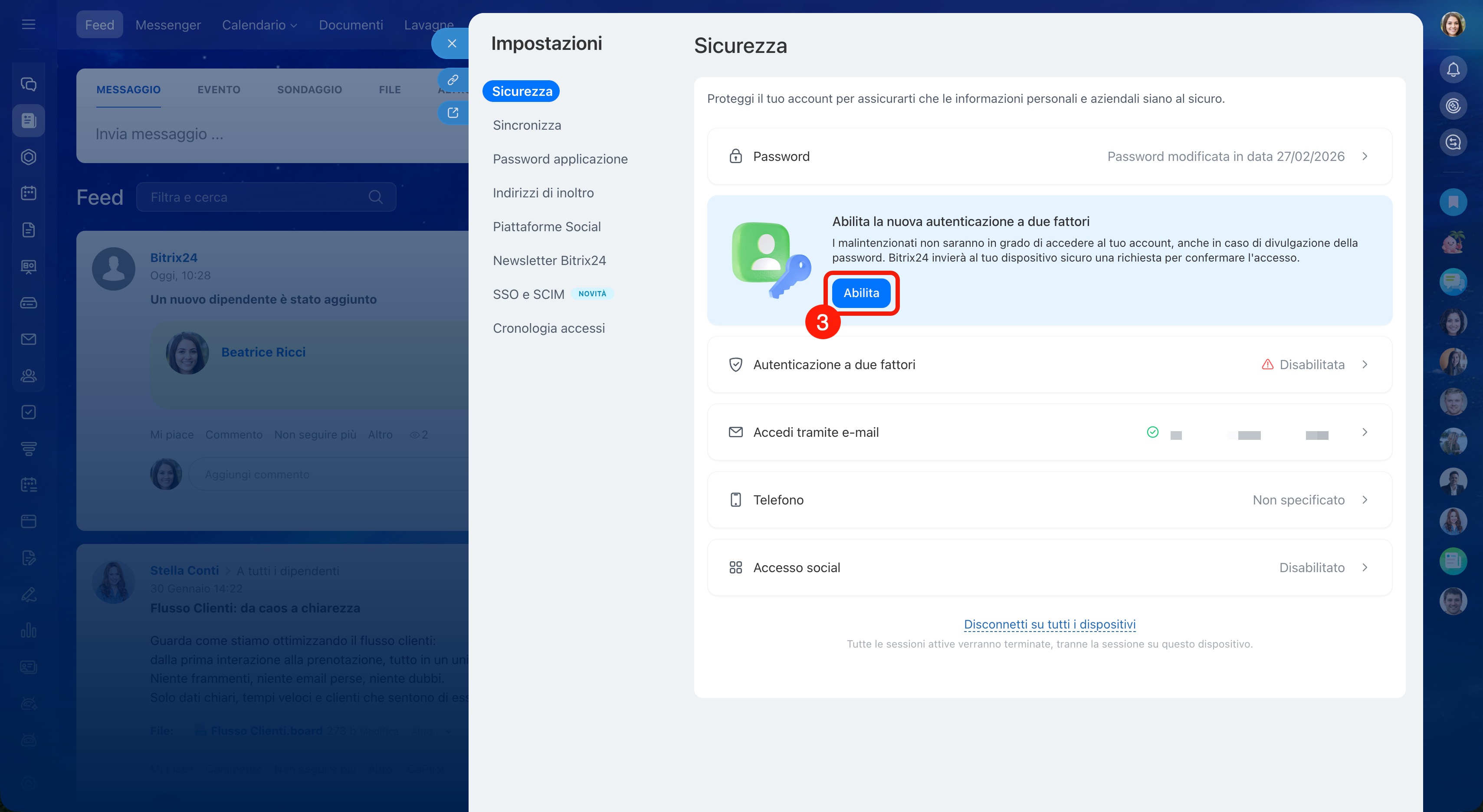 - Per configurare l'autenticazione a due fattori, installa l'app mobile di Bitrix24 e accedi. Accedi a Bitrix24 dal computer, accedi al tuo profilo, seleziona Sicurezza > Abilita.