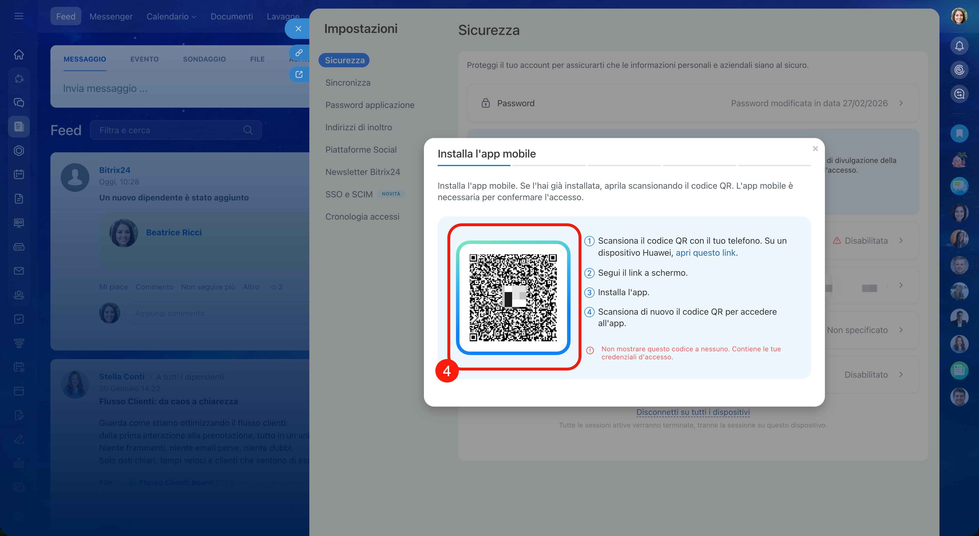 Attivare l'autenticazione a due fattori. La configurazione dell'autenticazione a due fattori per gli account di dipendenti e amministratori è identica. Per farlo, installa l'app mobile di Bitrix24 e accedi.