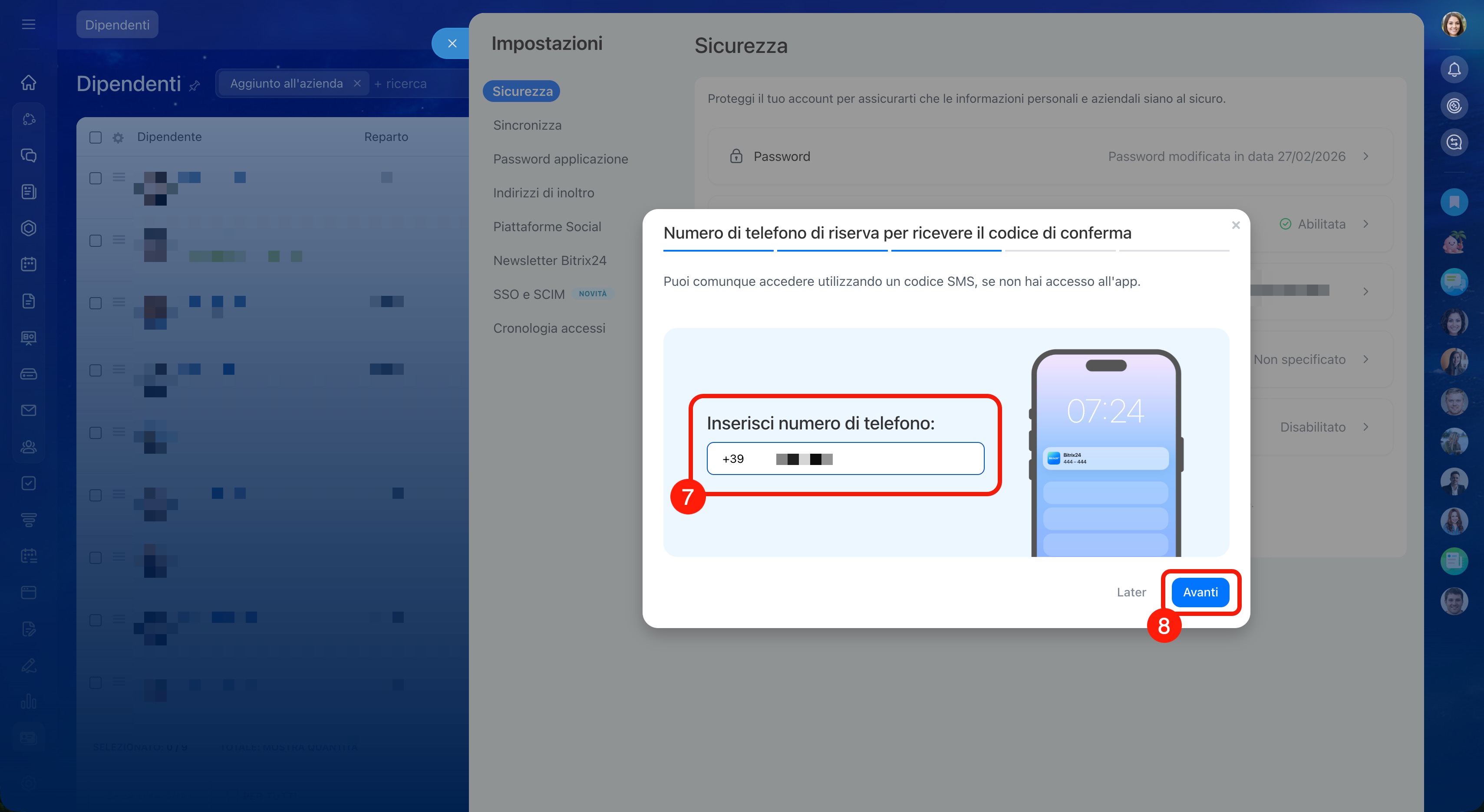 7. Inserisci il numero di telefono — è necessario per accedere a Bitrix24 tramite SMS se non hai accesso al telefono con l'app mobile.