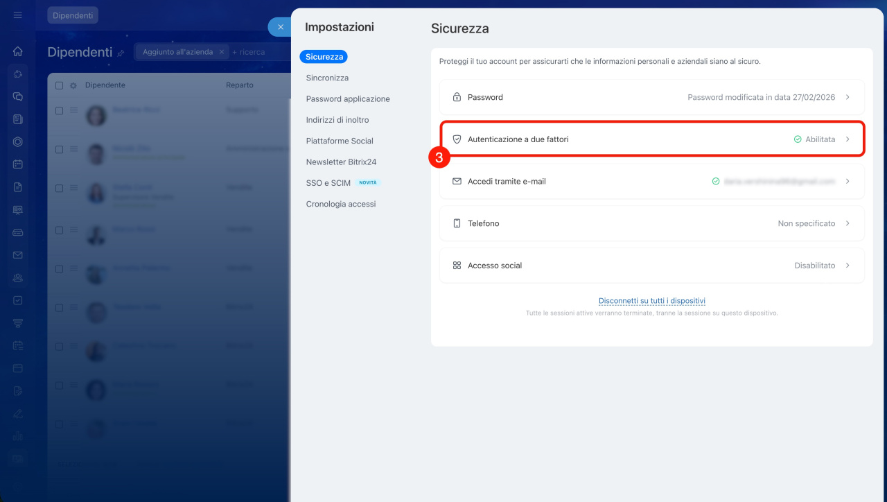 - Per configurare l'autenticazione a due fattori, installa l'app mobile di Bitrix24 e accedi. Accedi a Bitrix24 dal computer, accedi al tuo profilo, seleziona Sicurezza > Abilita.