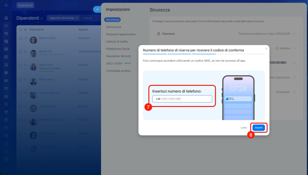 7. Inserisci il numero di telefono — è necessario per accedere a Bitrix24 tramite SMS se non hai accesso al telefono con l'app mobile.