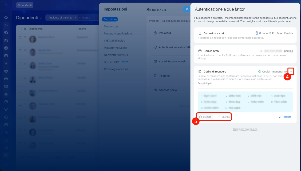 - Dopo aver attivato l'autenticazione a due fattori, scarica i codici di recupero. Saranno necessari se non potrai confermare l'accesso a Bitrix24 tramite l'app mobile o il codice SMS.